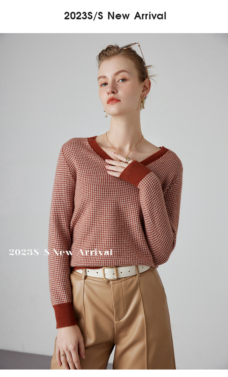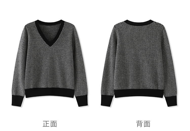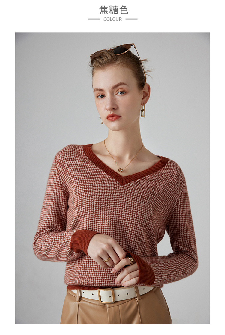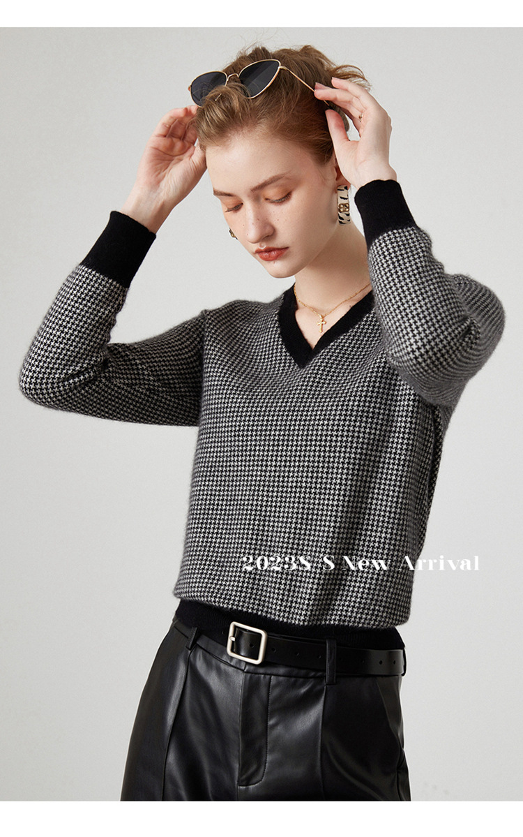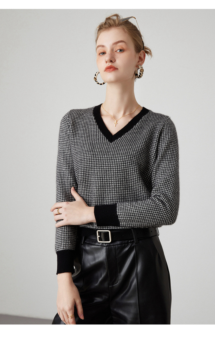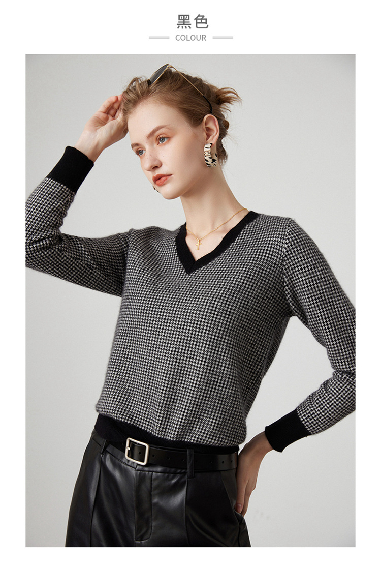 丁摩秋冬V领山羊绒衫女宽松套头毛衣千鸟格长袖上衣针织内搭打底衫女ALMK65