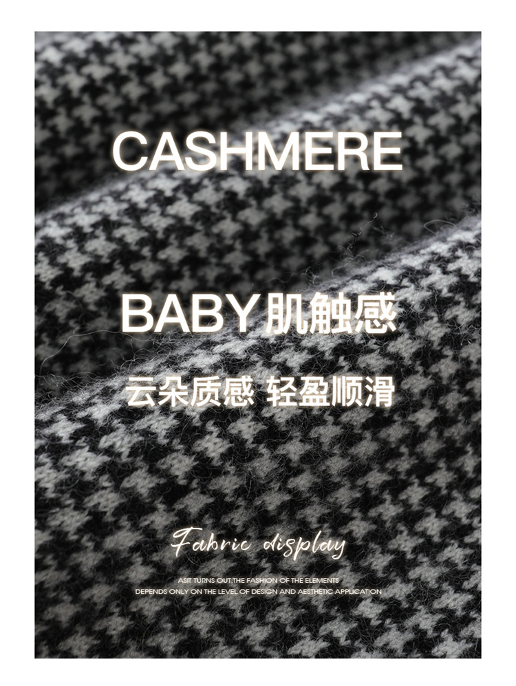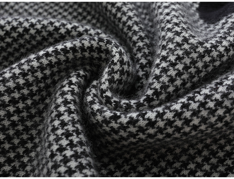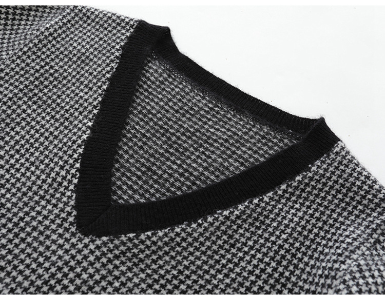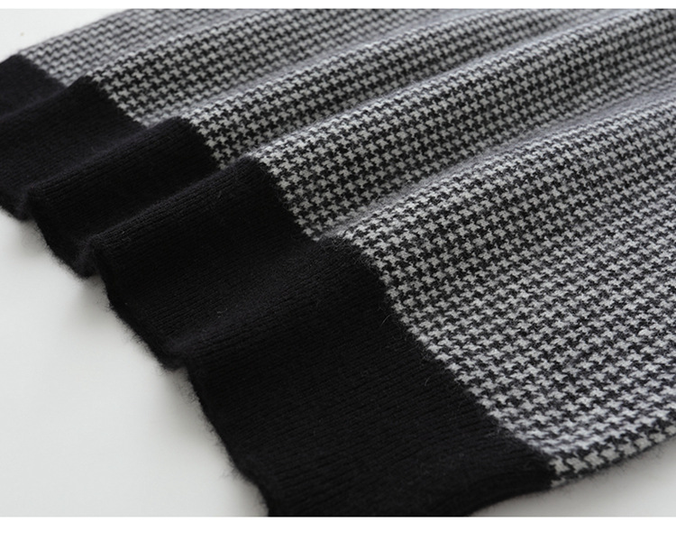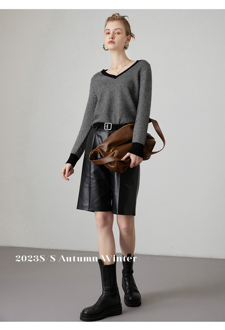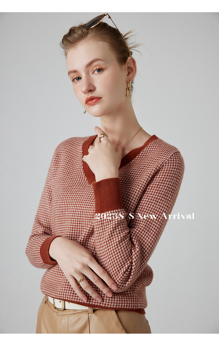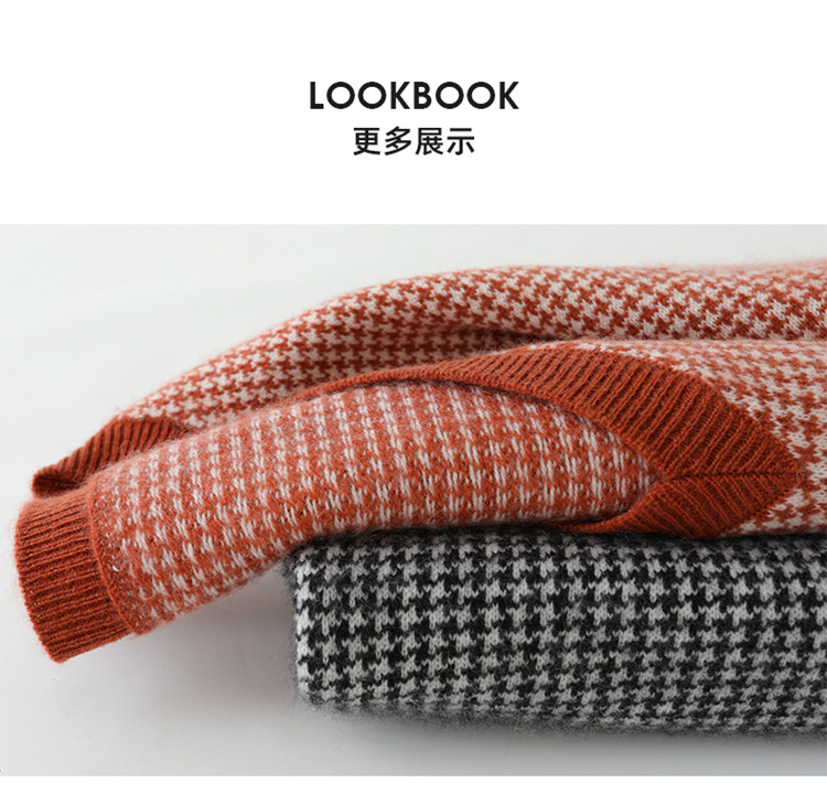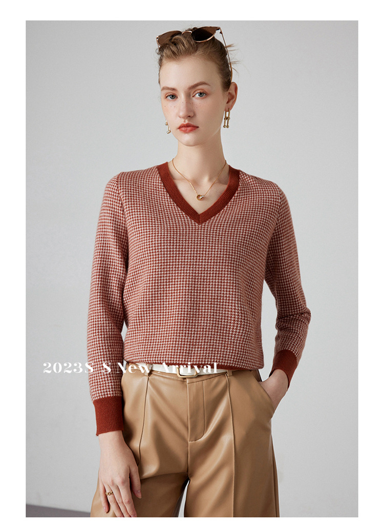 丁摩秋冬V领山羊绒衫女宽松套头毛衣千鸟格长袖上衣针织内搭打底衫女ALMK65