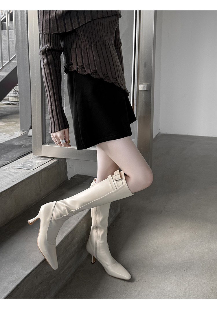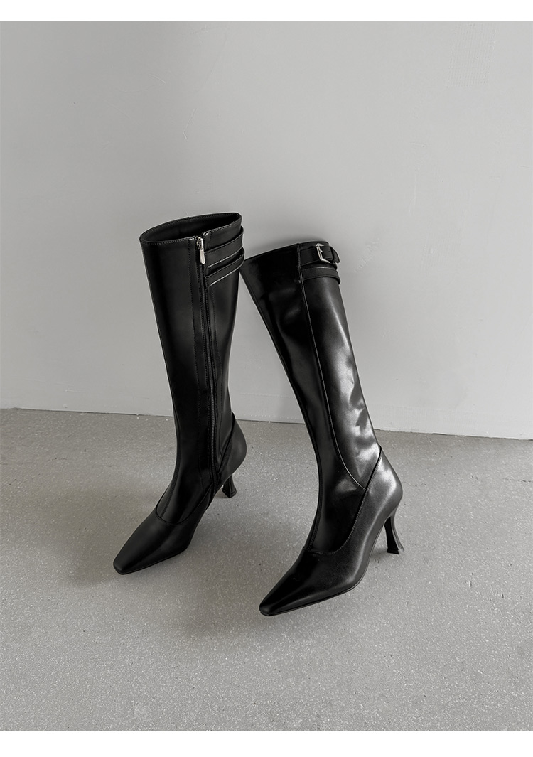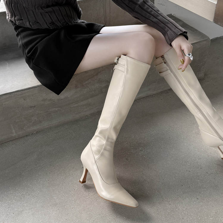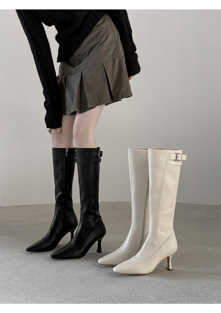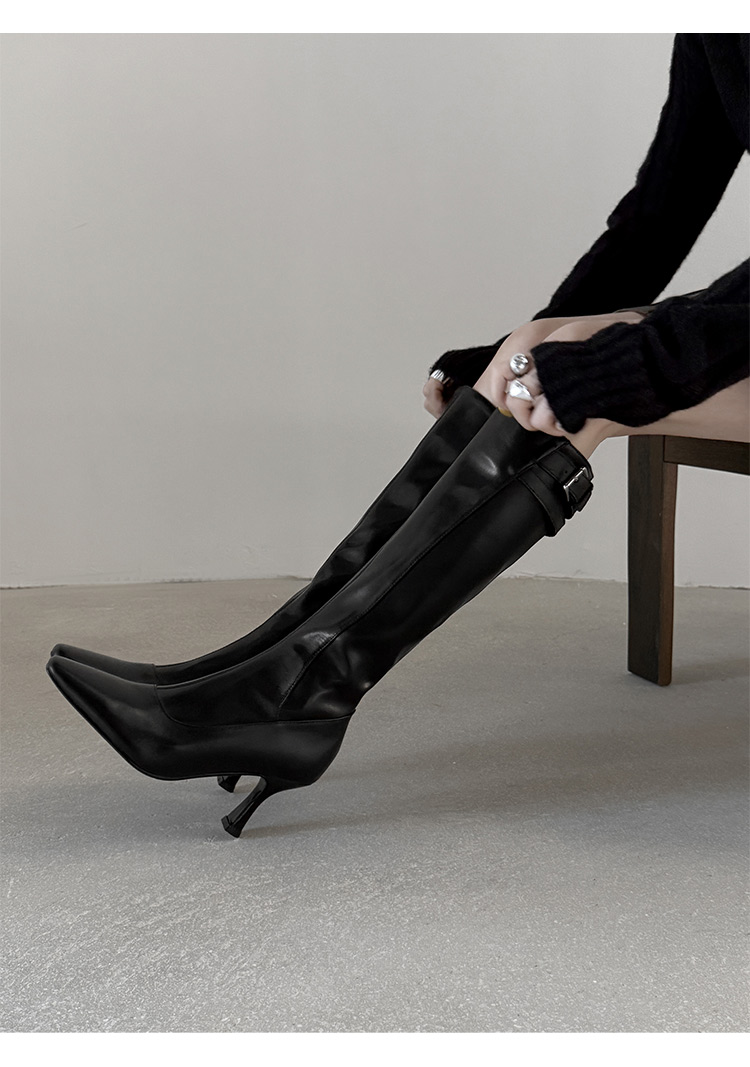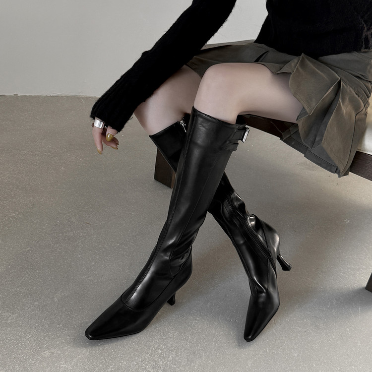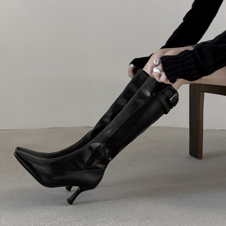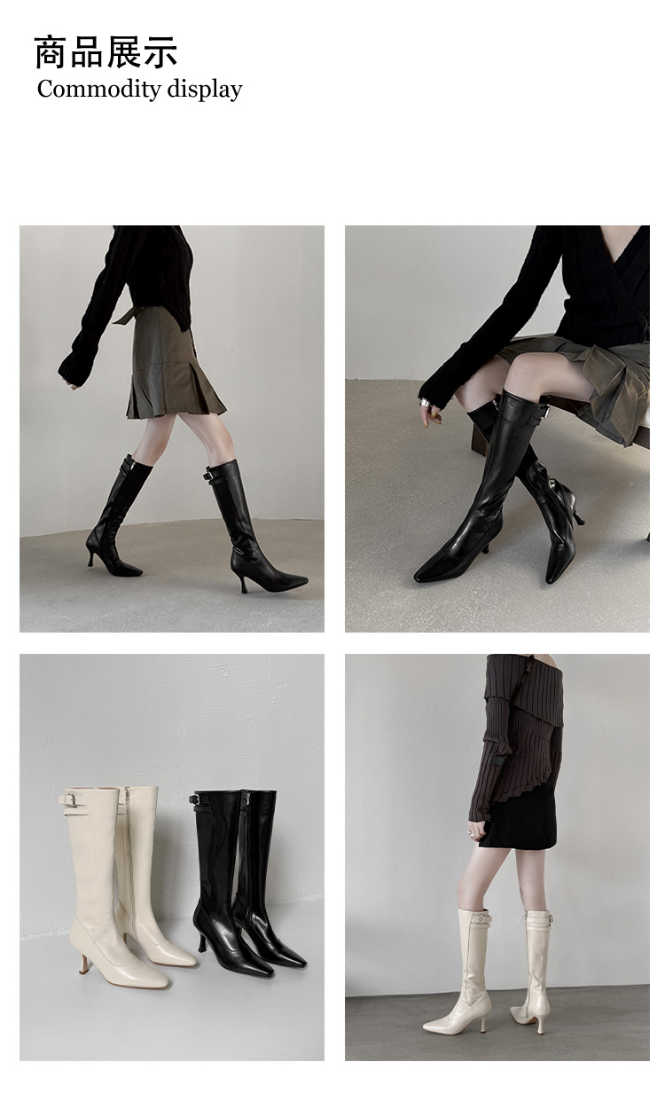 【预售7天】优雅性感高跟高筒靴秋冬尖头皮带扣通勤细跟牛皮弹力长靴女DQ&DQ9721W