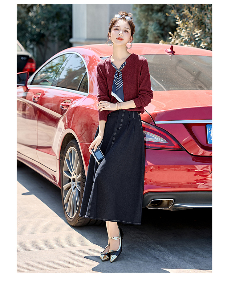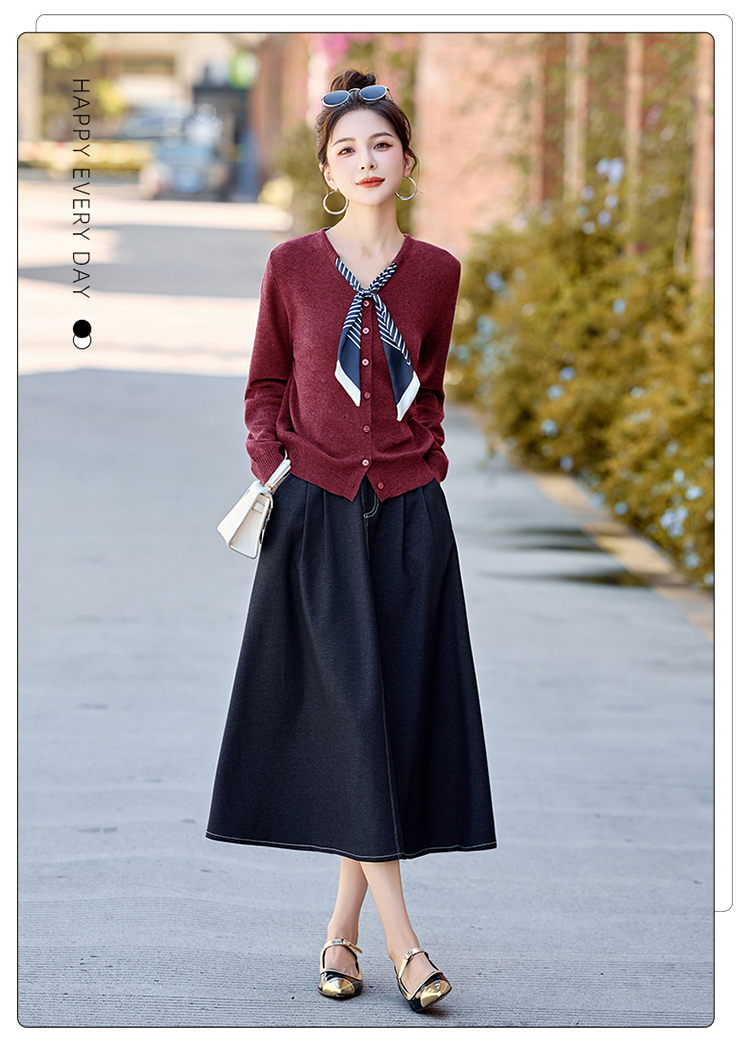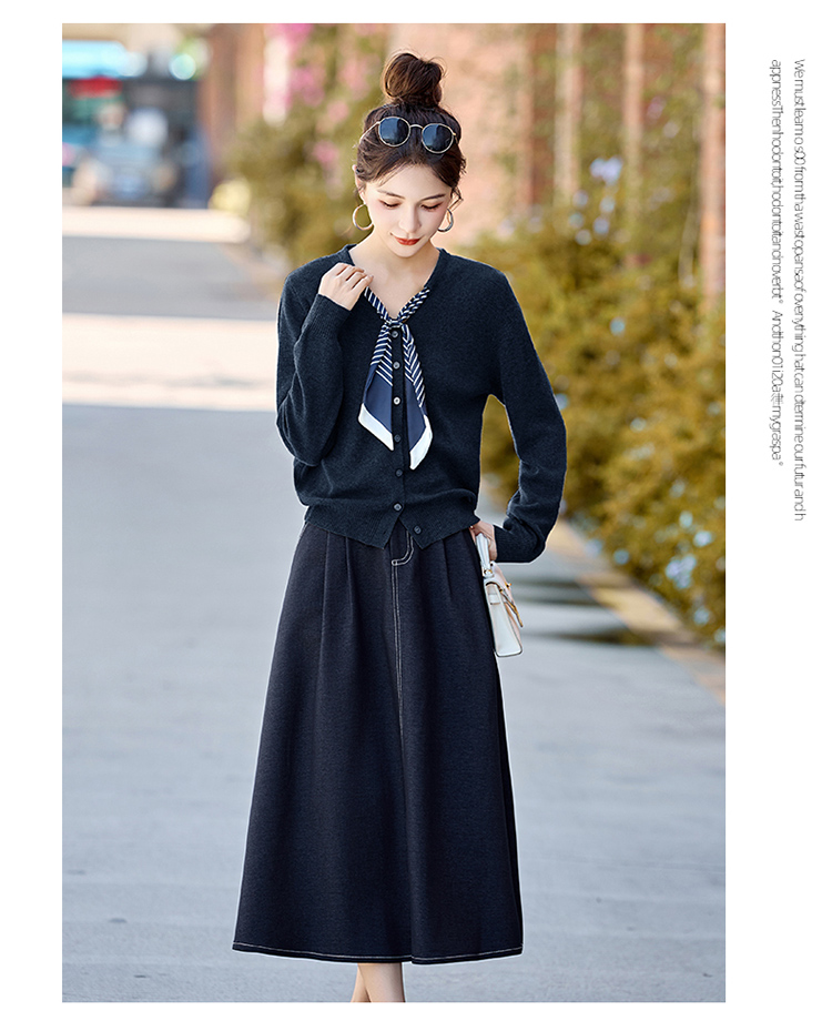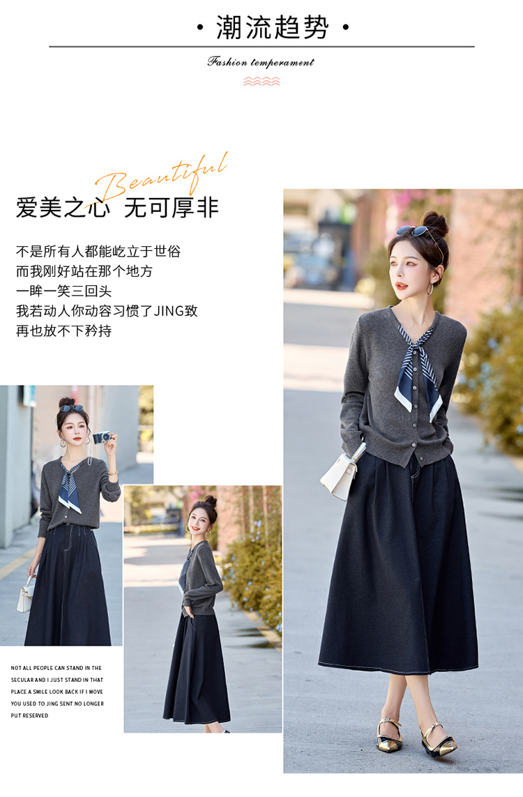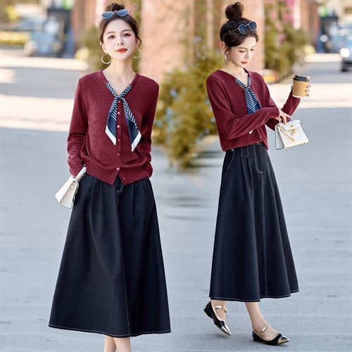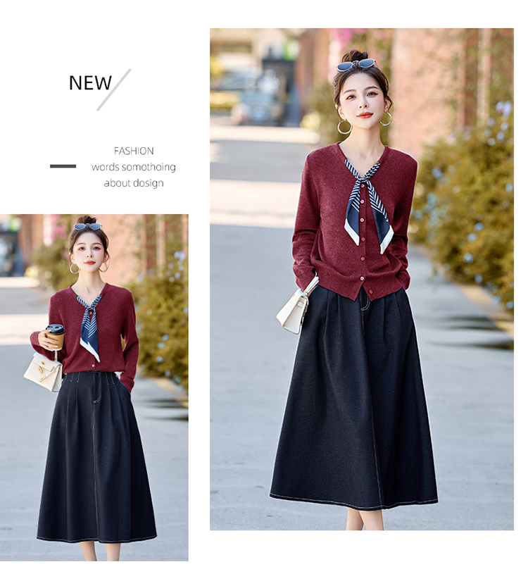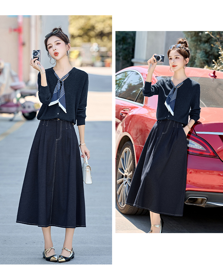 时尚高级感长袖丝巾针织开衫+高腰牛仔半身裙两件套HR-YM7738