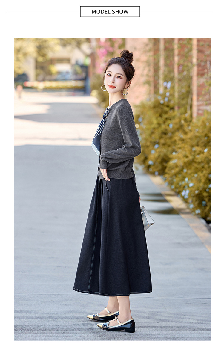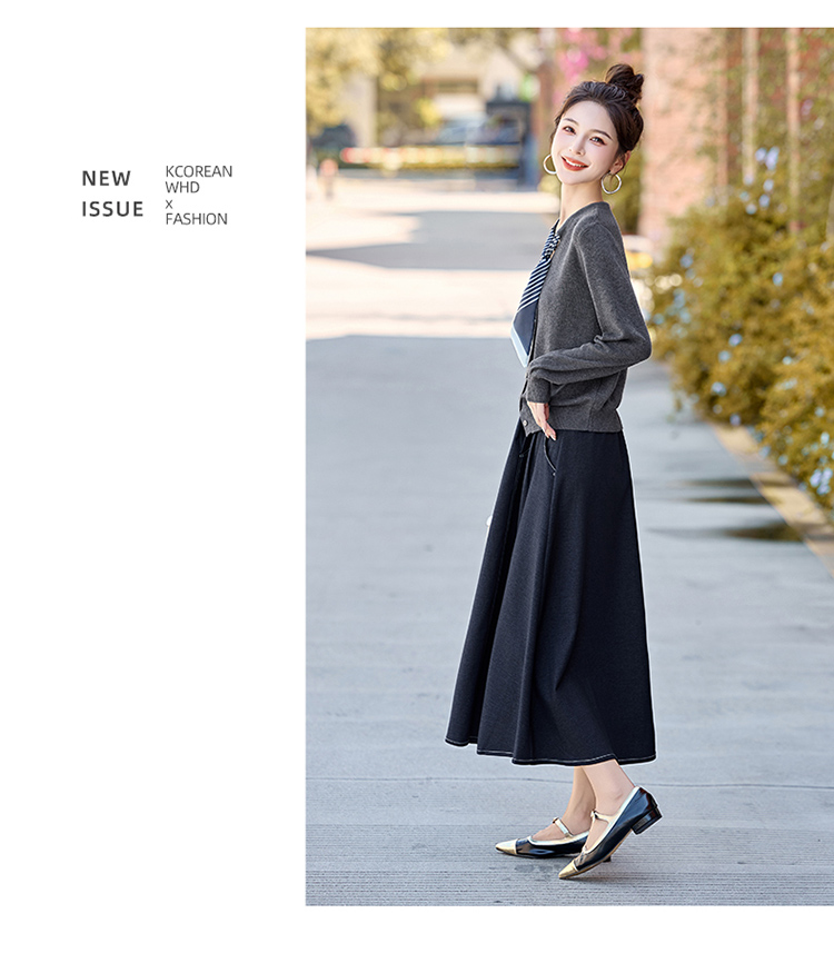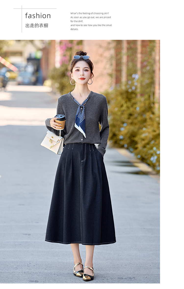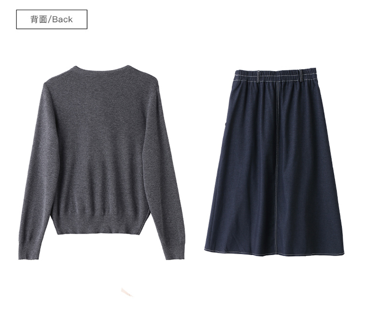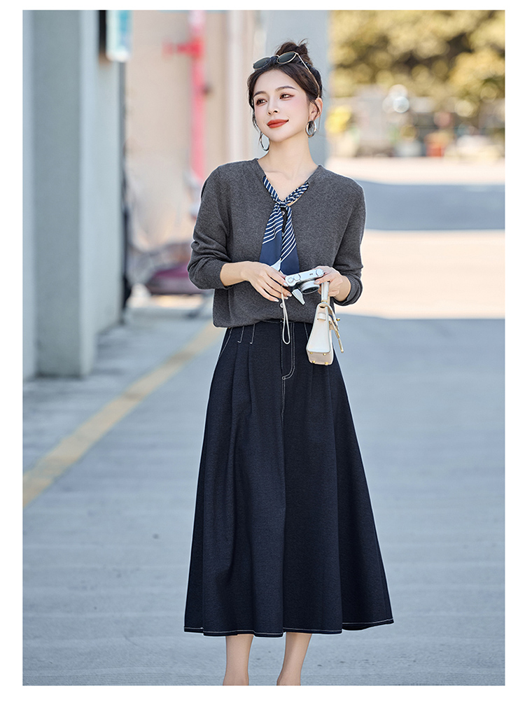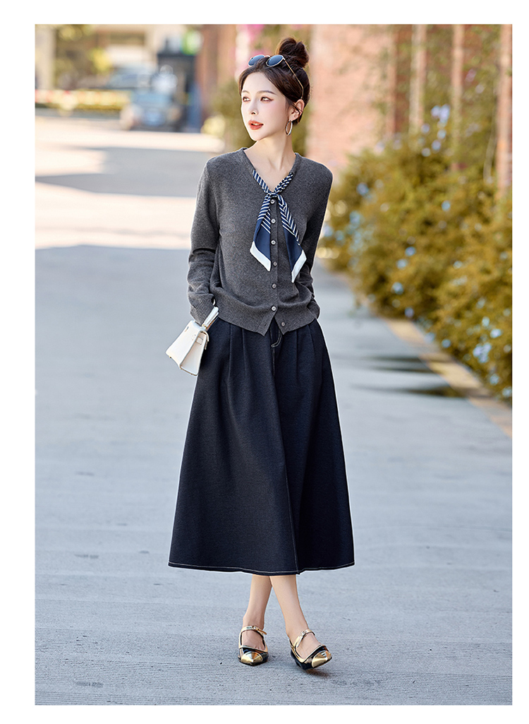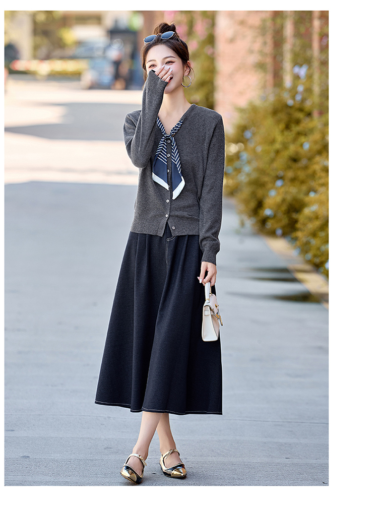 时尚高级感长袖丝巾针织开衫+高腰牛仔半身裙两件套HR-YM7738
