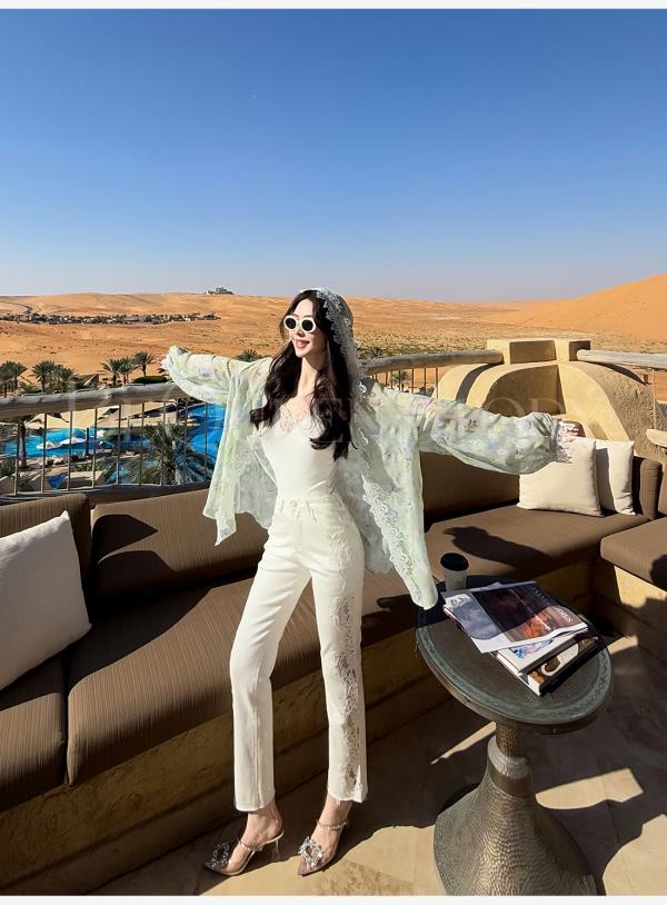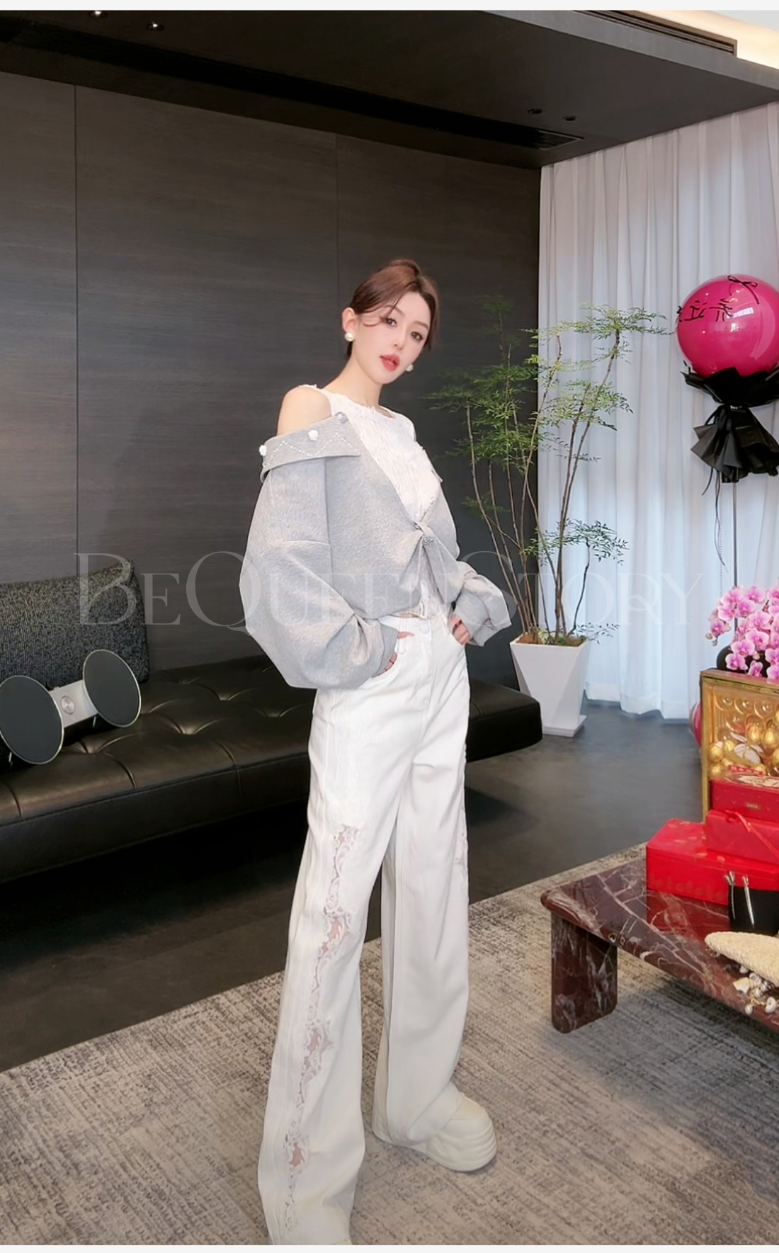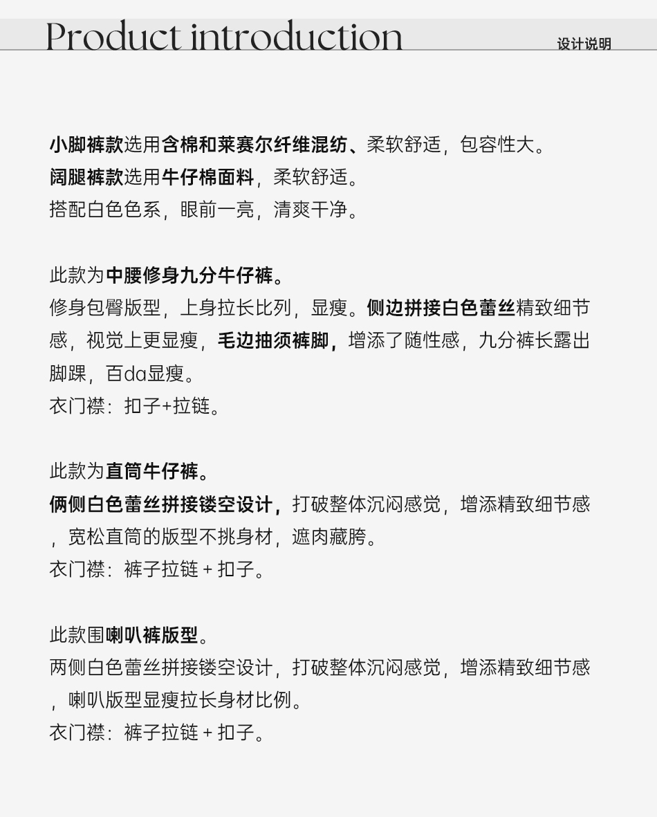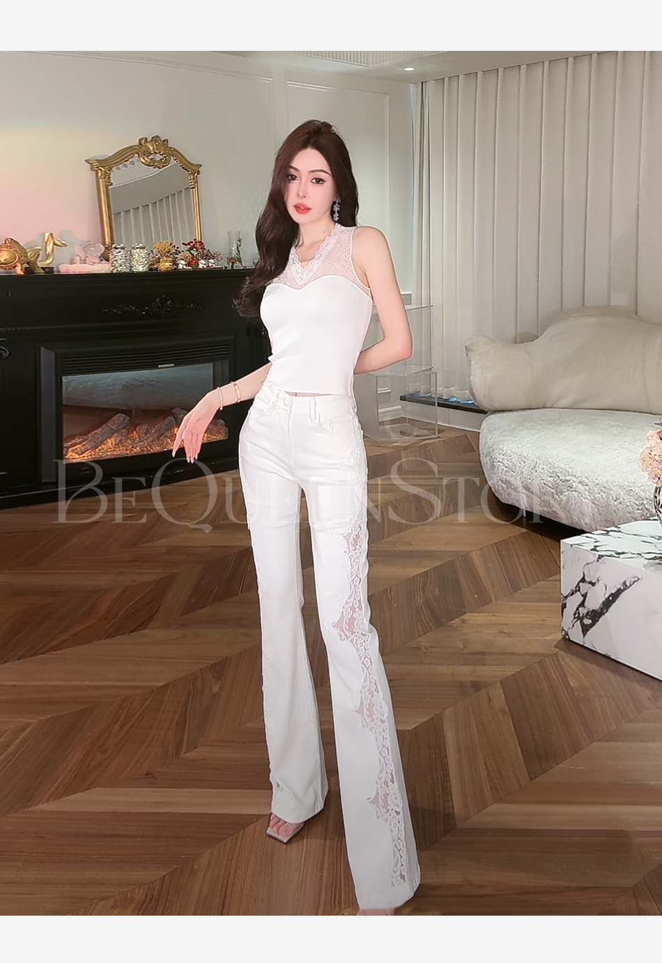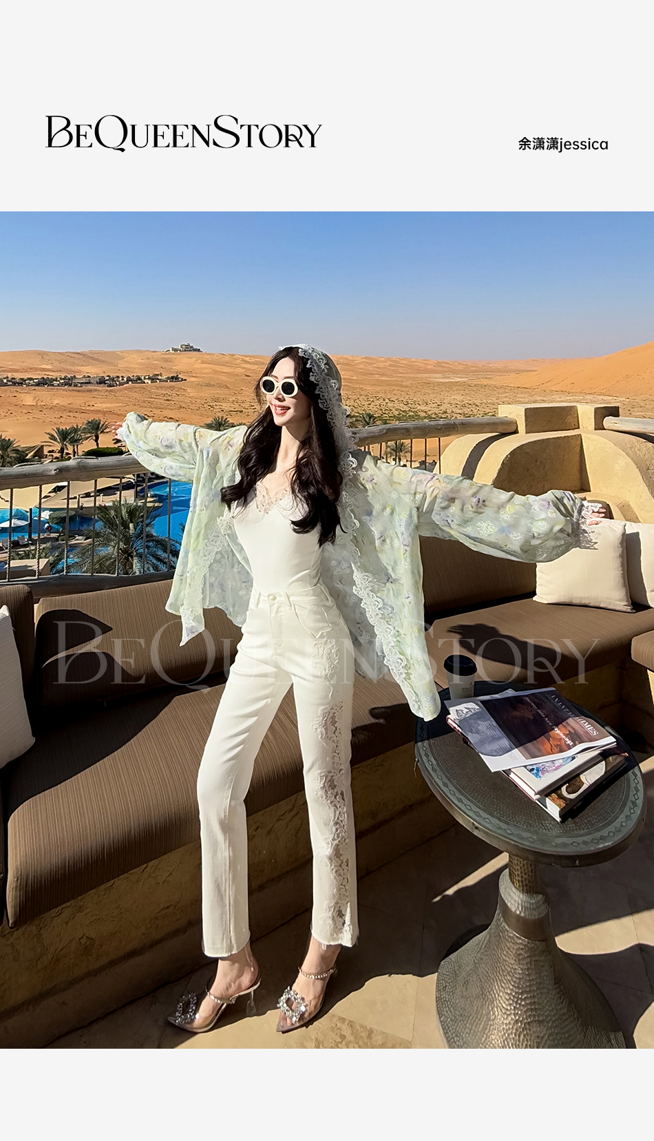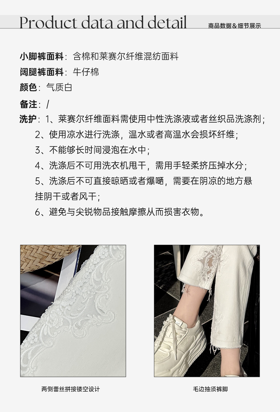 余潇潇【漫步生花】2025春装新款棉天丝混纺拼白色蕾丝欧若风牛仔裤