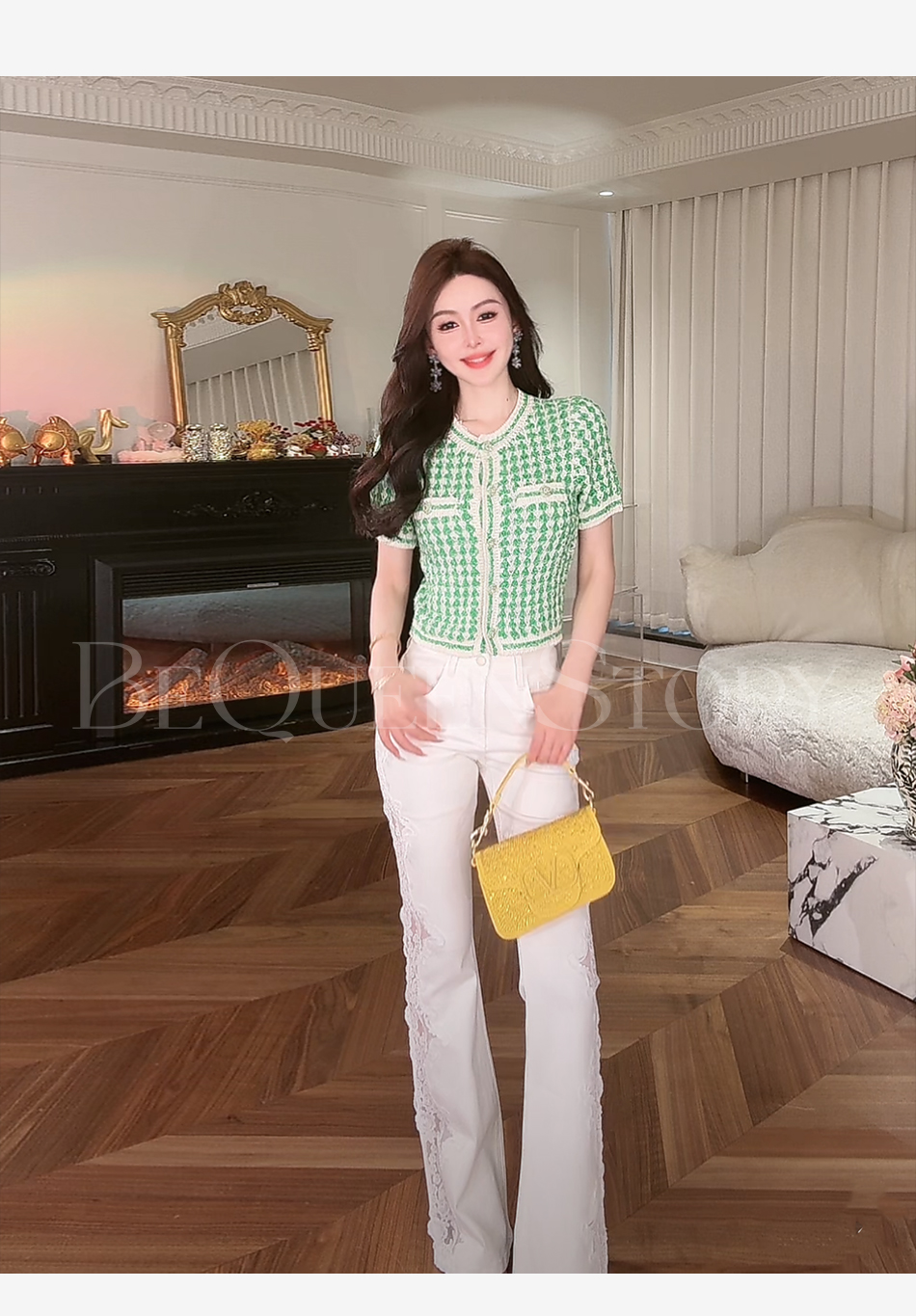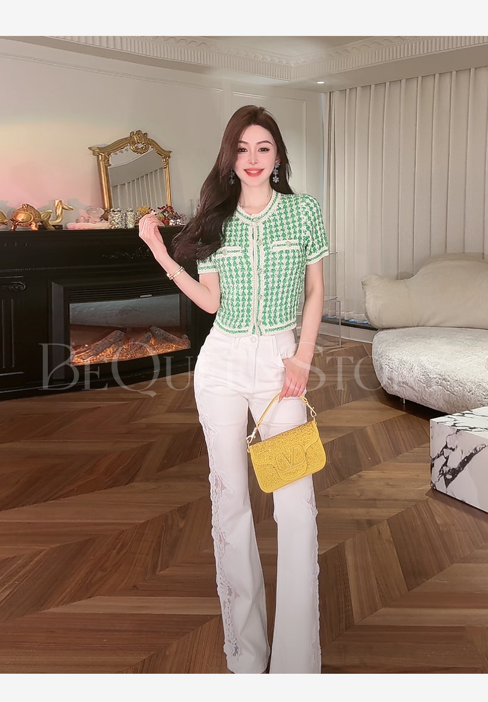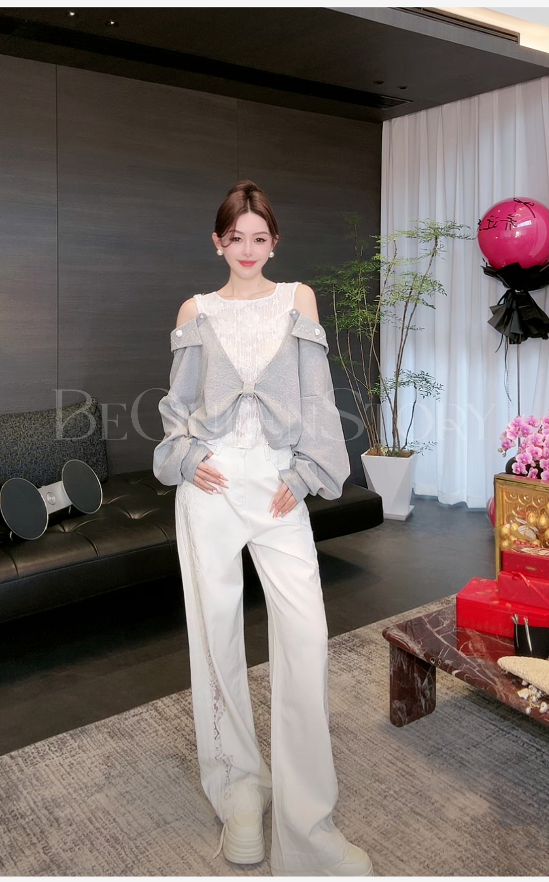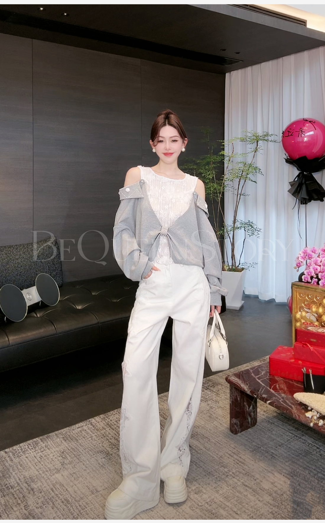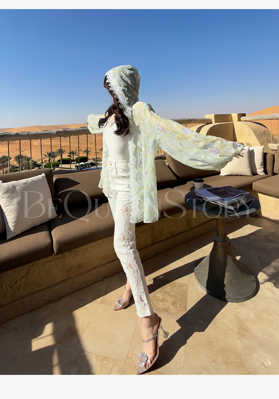 余潇潇【漫步生花】2025春装新款棉天丝混纺拼白色蕾丝欧若风牛仔裤