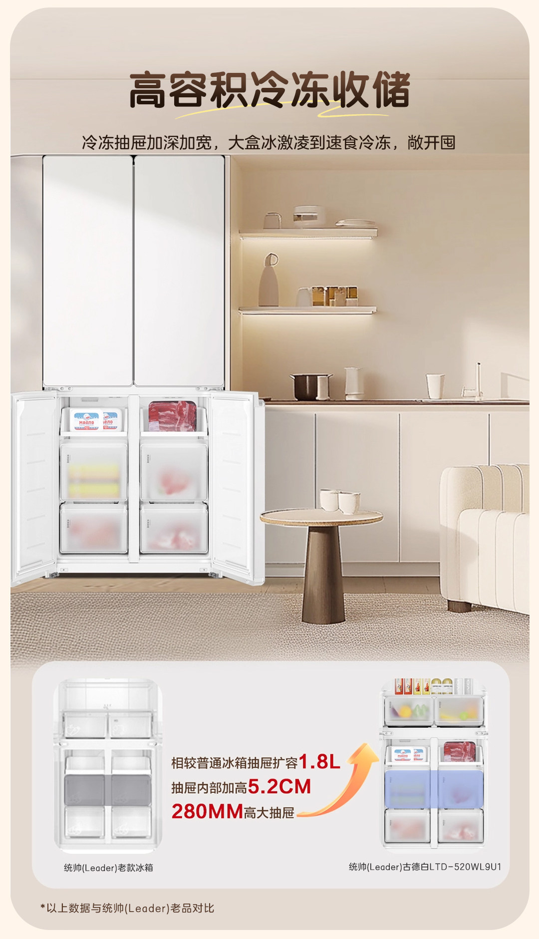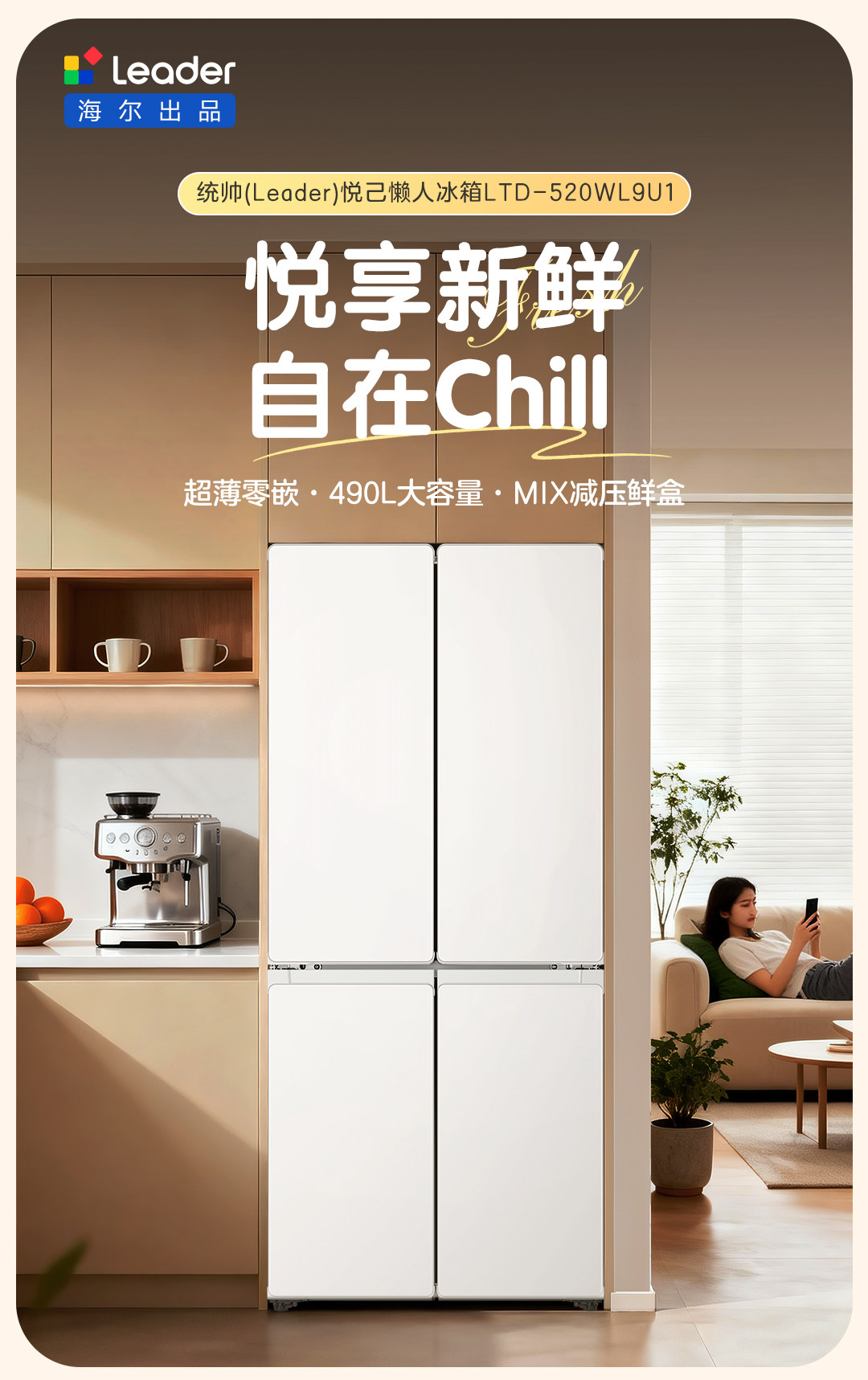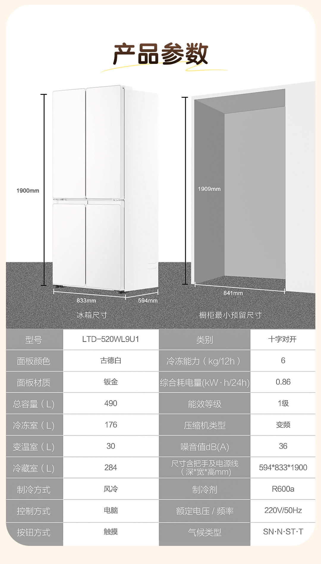 海尔出品统帅悦己懒人520十字四门超薄大容量家用电冰箱LTD-520WL9U1