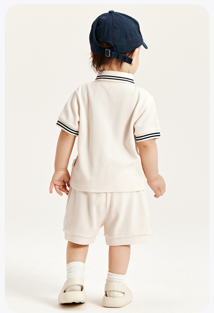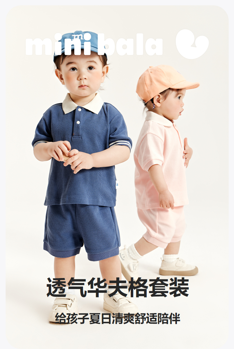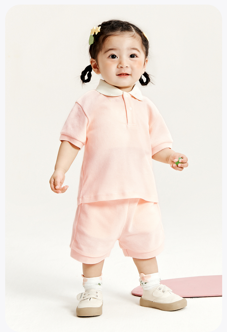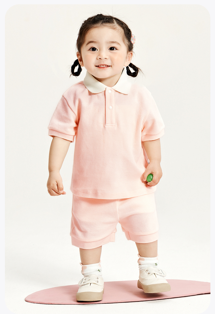 迷你巴拉男童女童儿童短袖两件套夏季学院风华夫格运动套装