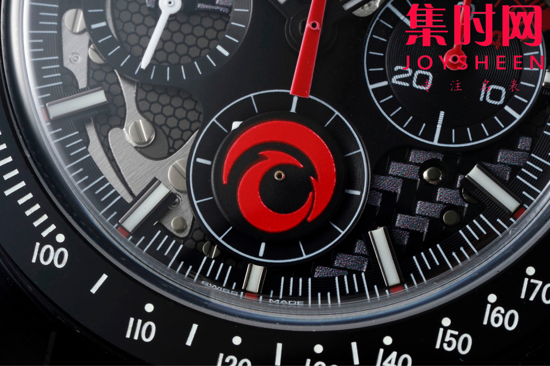 腕表搭配黑色微孔橡胶表带,中间饰有黄色橡胶材质内衬,引人瞩目。整枚腕表采用黑色陶瓷打造而成,中央计时秒针饰以黄色亮漆,表圈饰有激光镌刻的亮白色珐琅测速刻度。小秒盘指针采用五级钛金属材质制成,以别出心裁的“土星5号运载火箭”造型呈现。这一3D立体造型由激光车削技术制成,并由附着白漆、激光烧蚀和激光黑化工艺呈现出了不同的色彩效果。