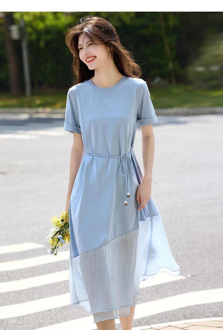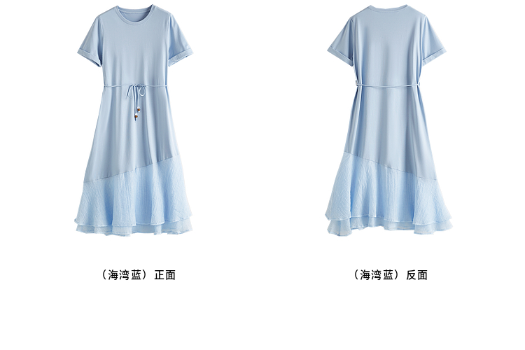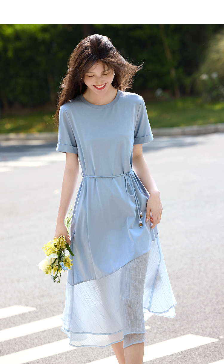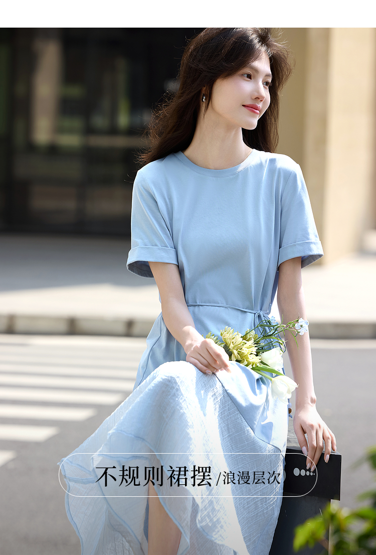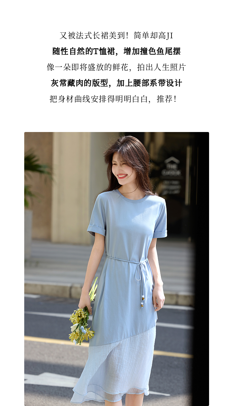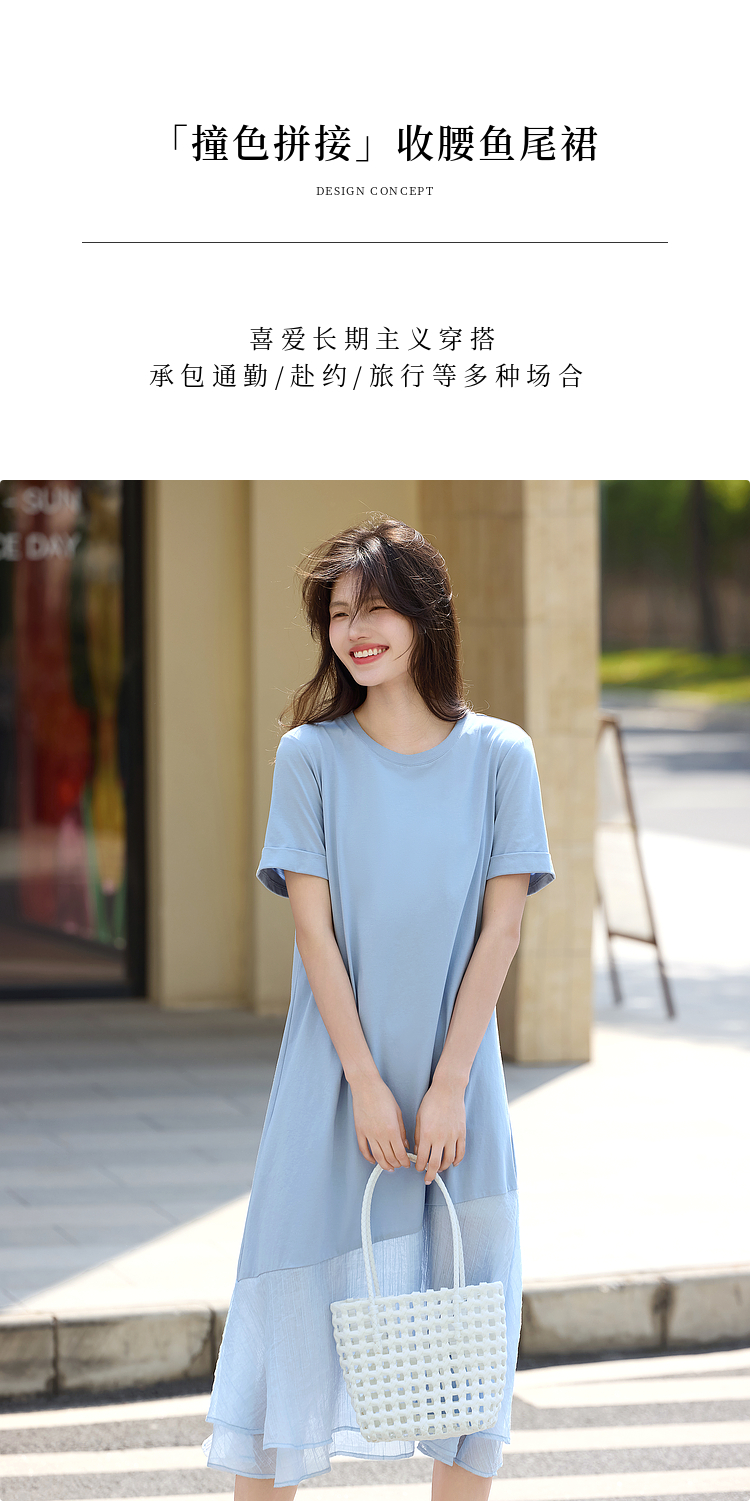 【周末秒杀】熙世界高级感蓝色连衣裙女2025新款夏季短袖棉质拼接天丝鱼尾裙子