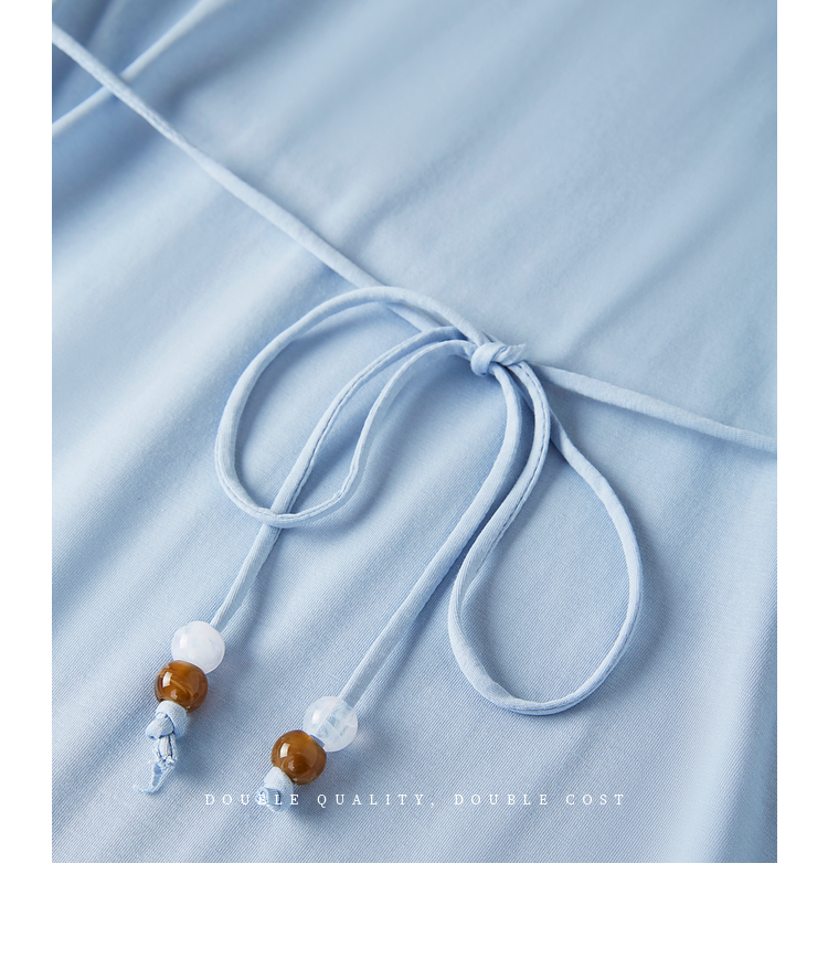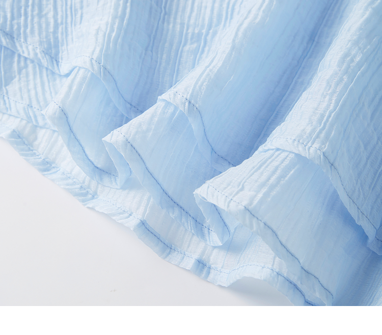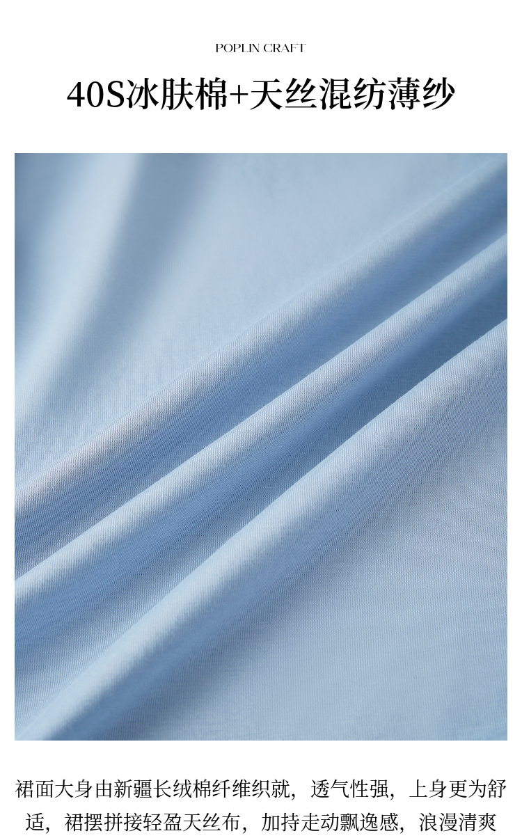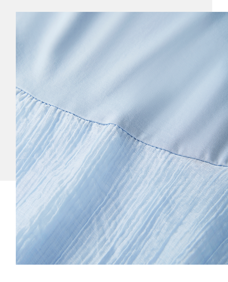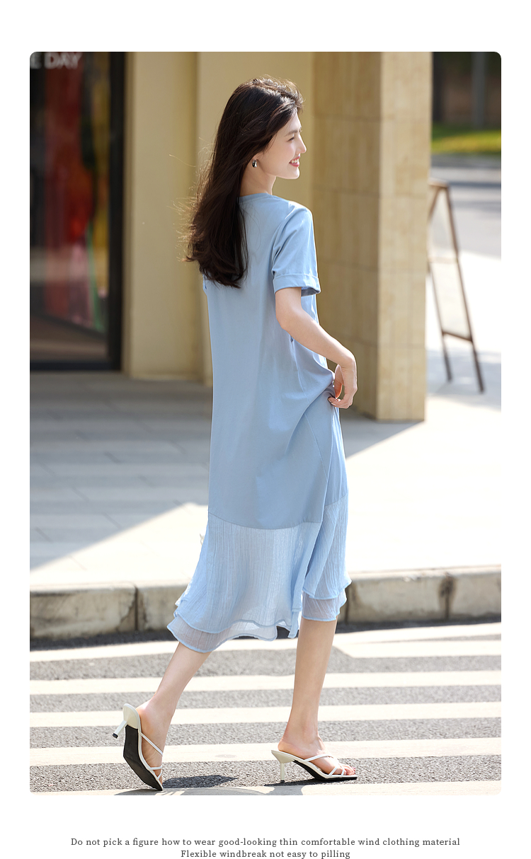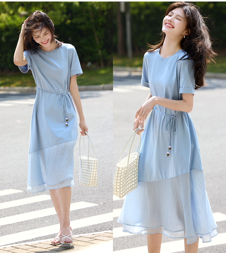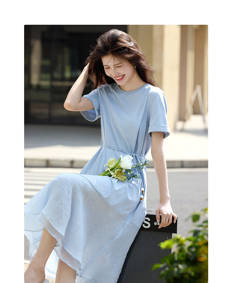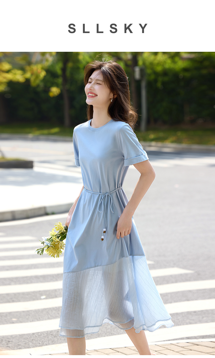 【周末秒杀】熙世界高级感蓝色连衣裙女2025新款夏季短袖棉质拼接天丝鱼尾裙子