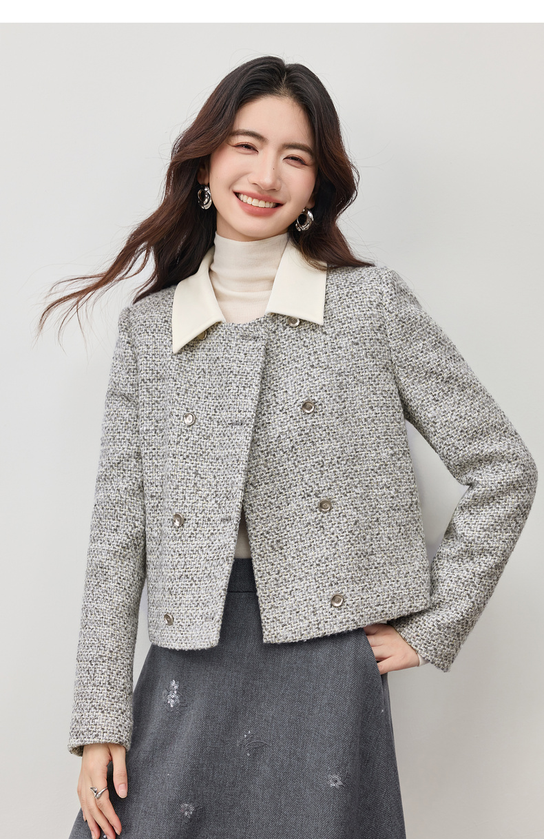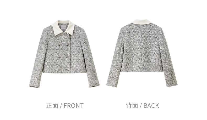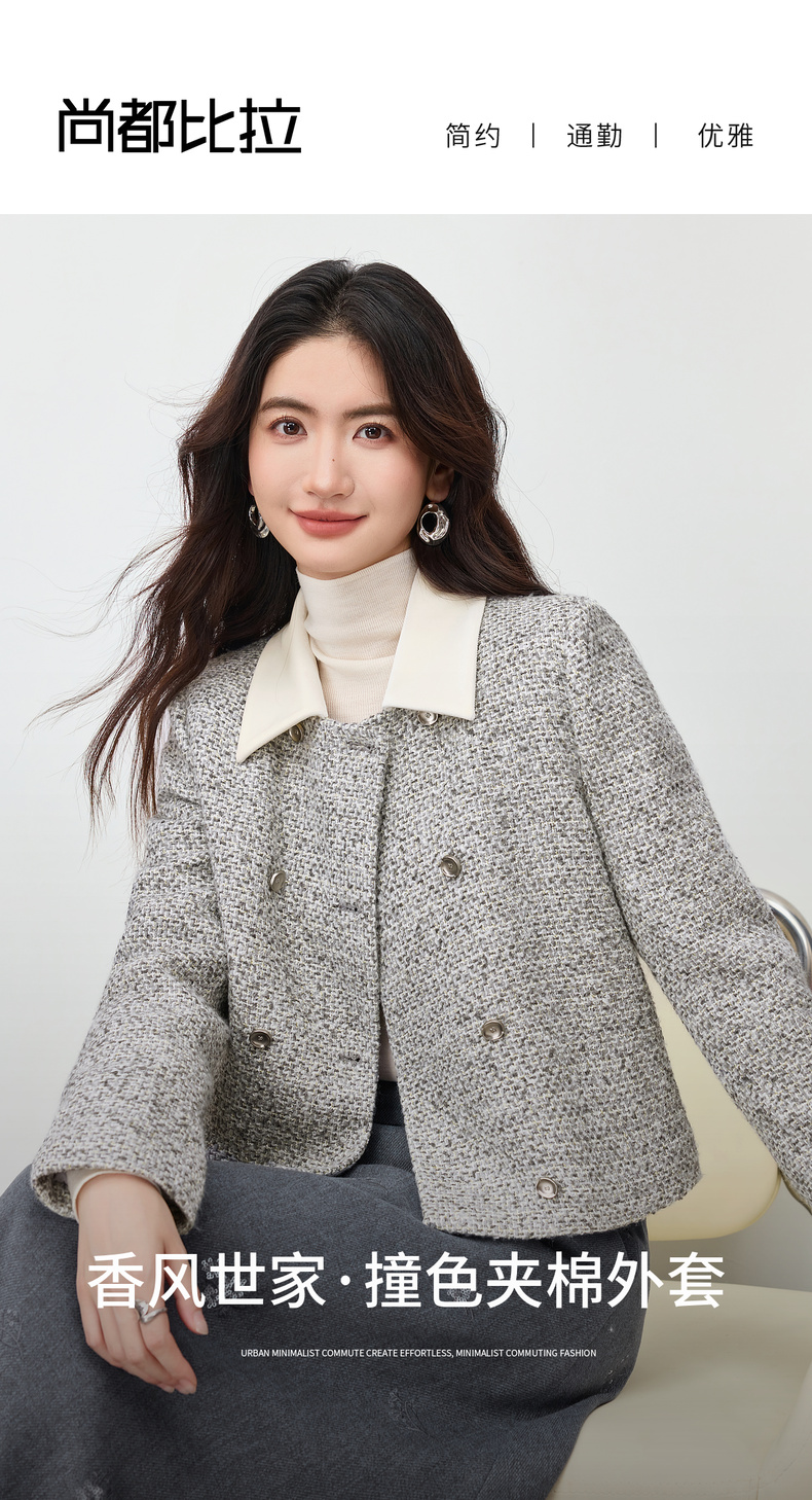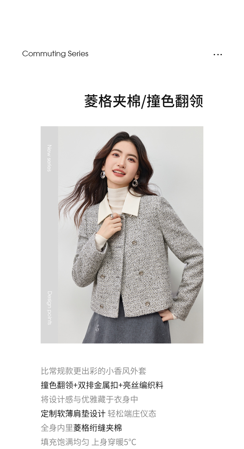 【内购】【夹棉保暖】优雅通勤撞色翻领双排金属扣垫肩短款亮丝小香风外套-154WA3750