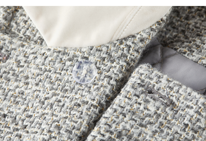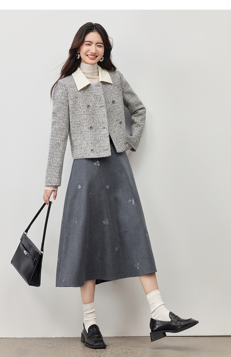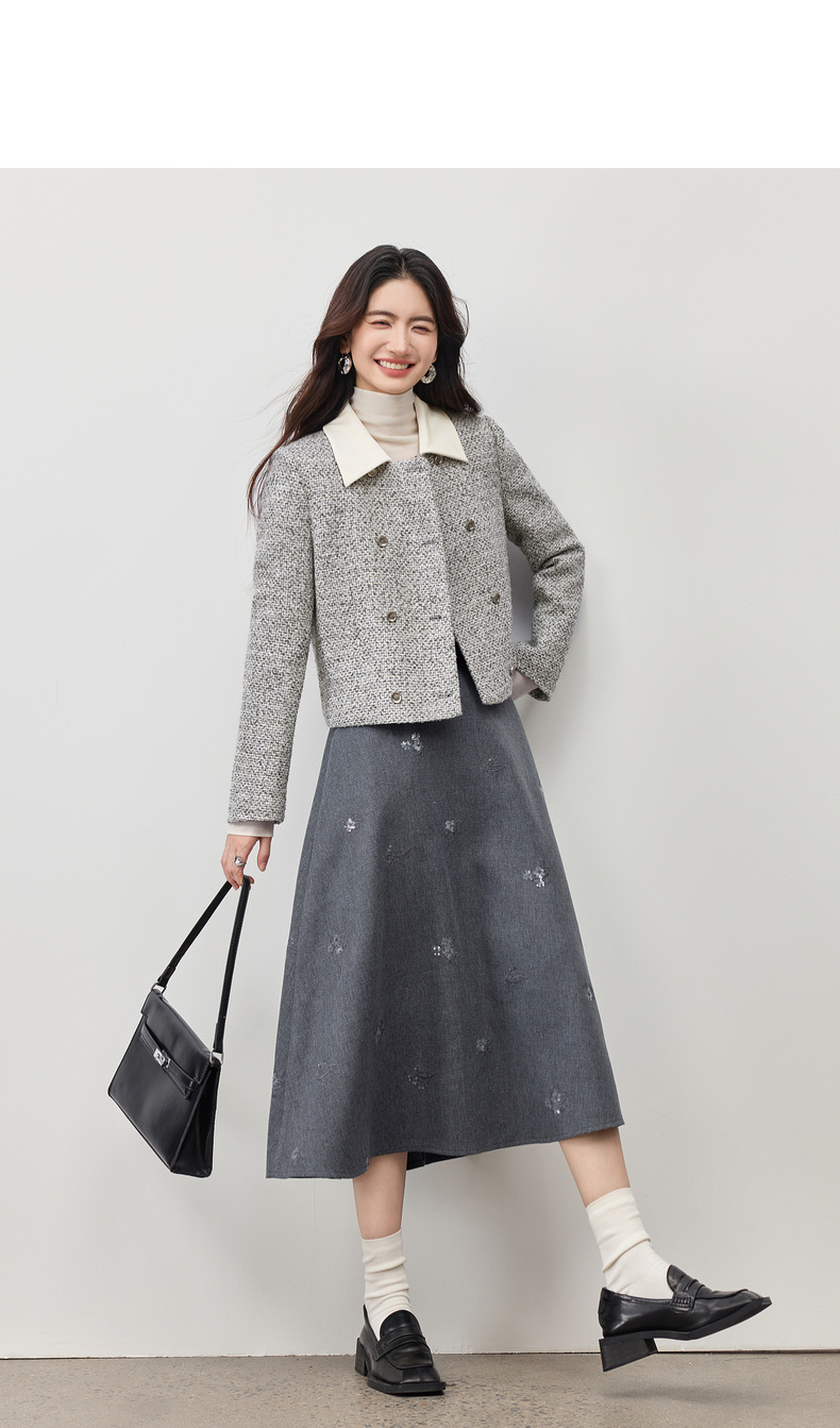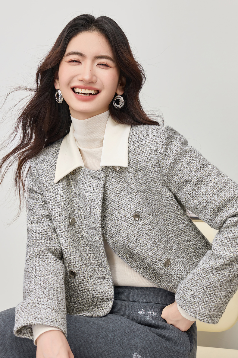 【内购】【夹棉保暖】优雅通勤撞色翻领双排金属扣垫肩短款亮丝小香风外套-154WA3750