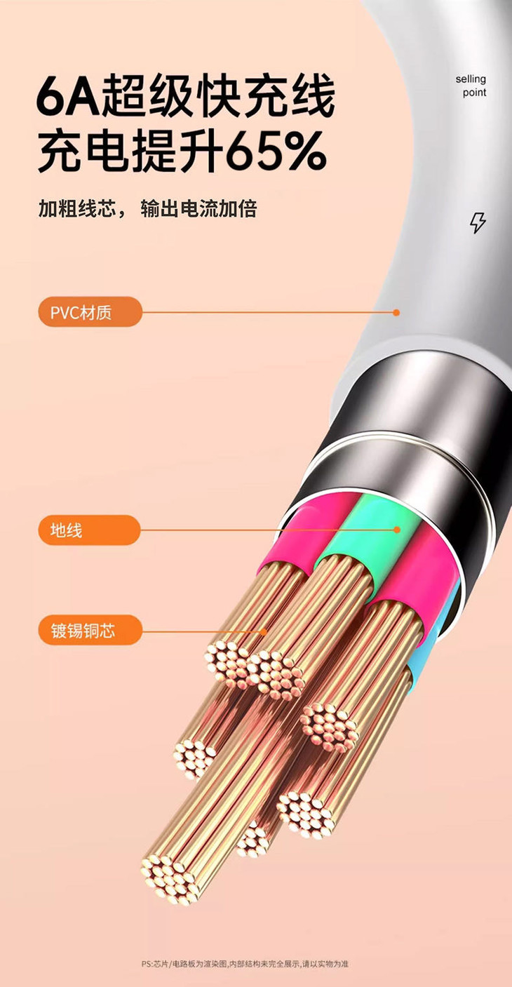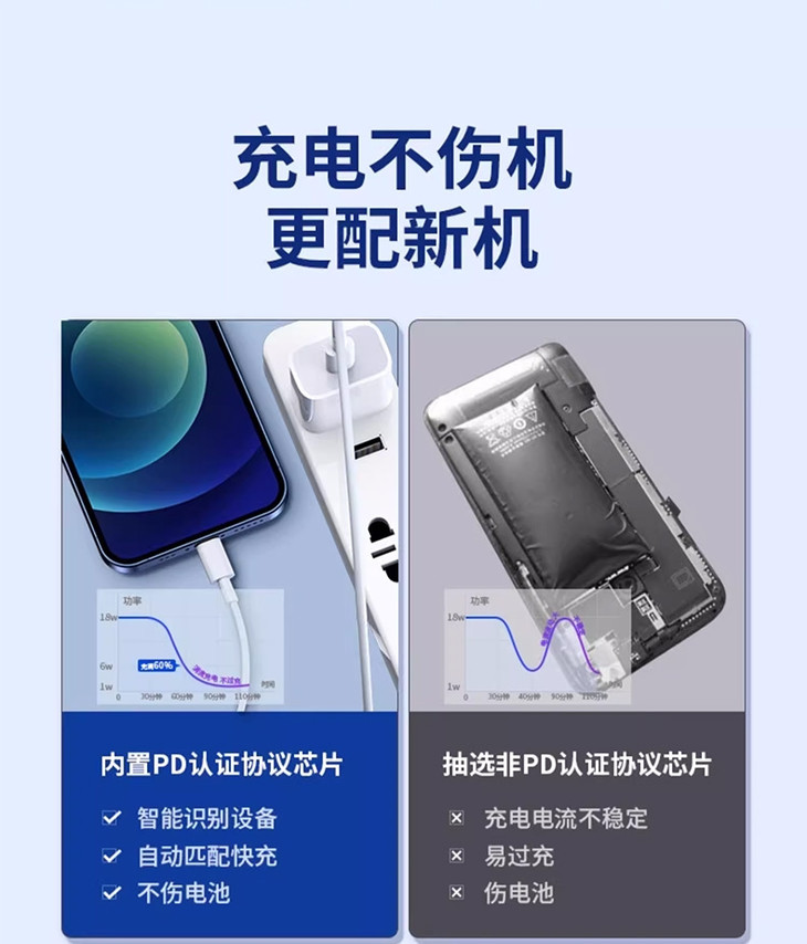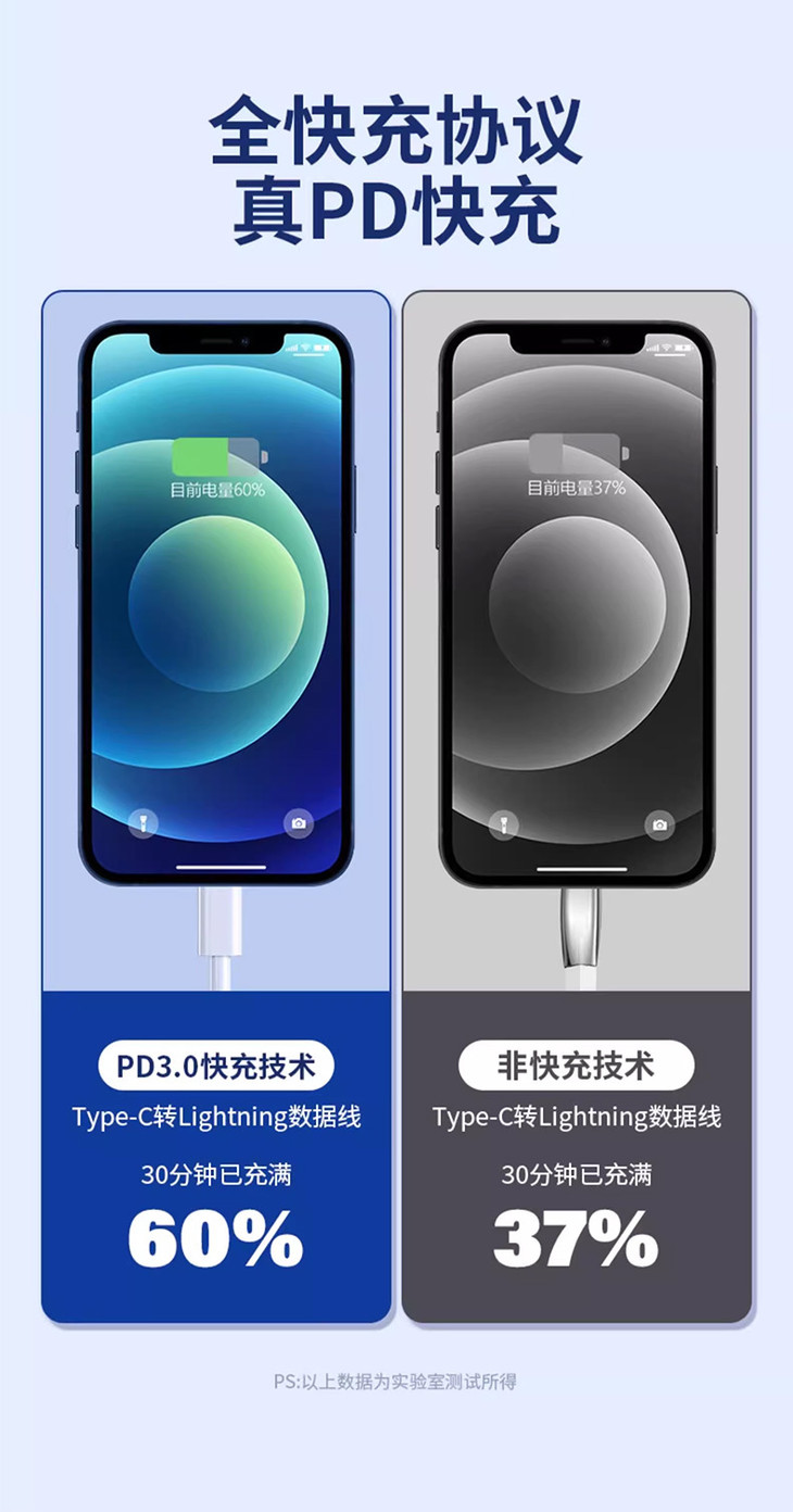 半小时至多可充到70%!!(从0到60电量充电速度最快) 加粗铜线芯,智能芯片保护性充电(快充协议保护电池,60以上电功率输出变慢)
