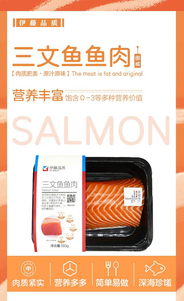 伊藤品质冰鲜三文鱼鱼肉180g/盒(需冷藏保存)挪威冰鲜三文鱼(美食优选)