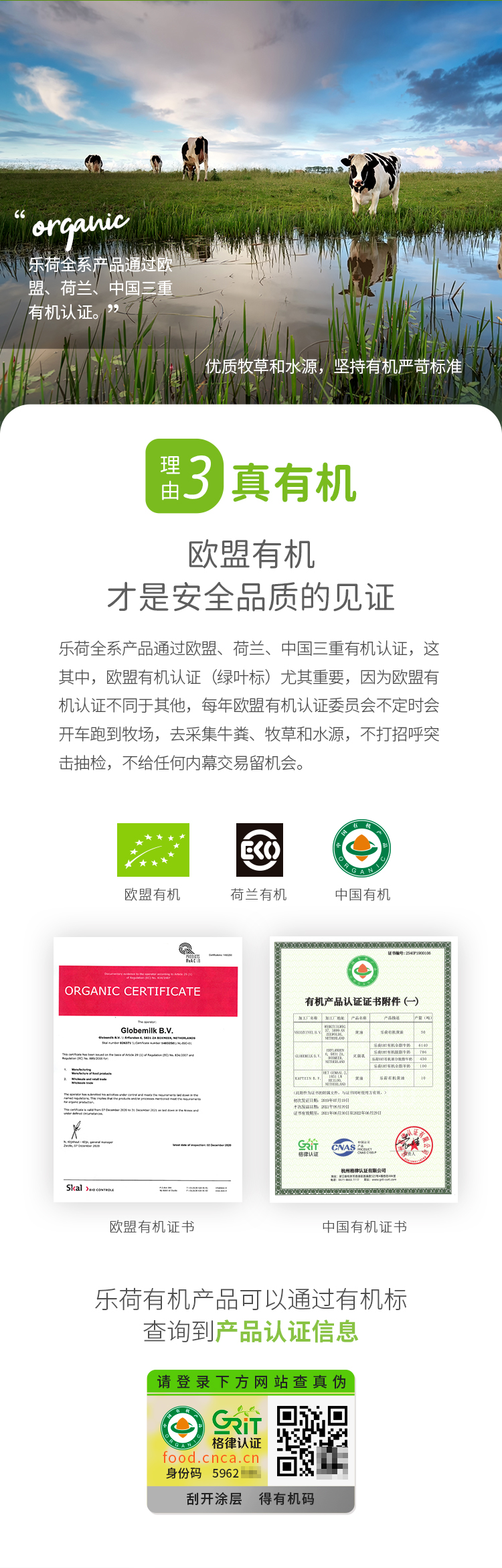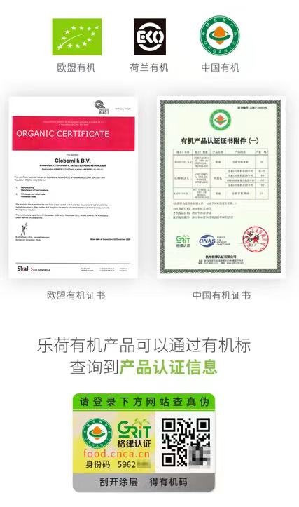 事实上,有机是需要权威机构认证的,乐荷通过了中欧荷兰三重有机认证,也就是说,不管国内还是国际检测,乐荷都符合有机标准。