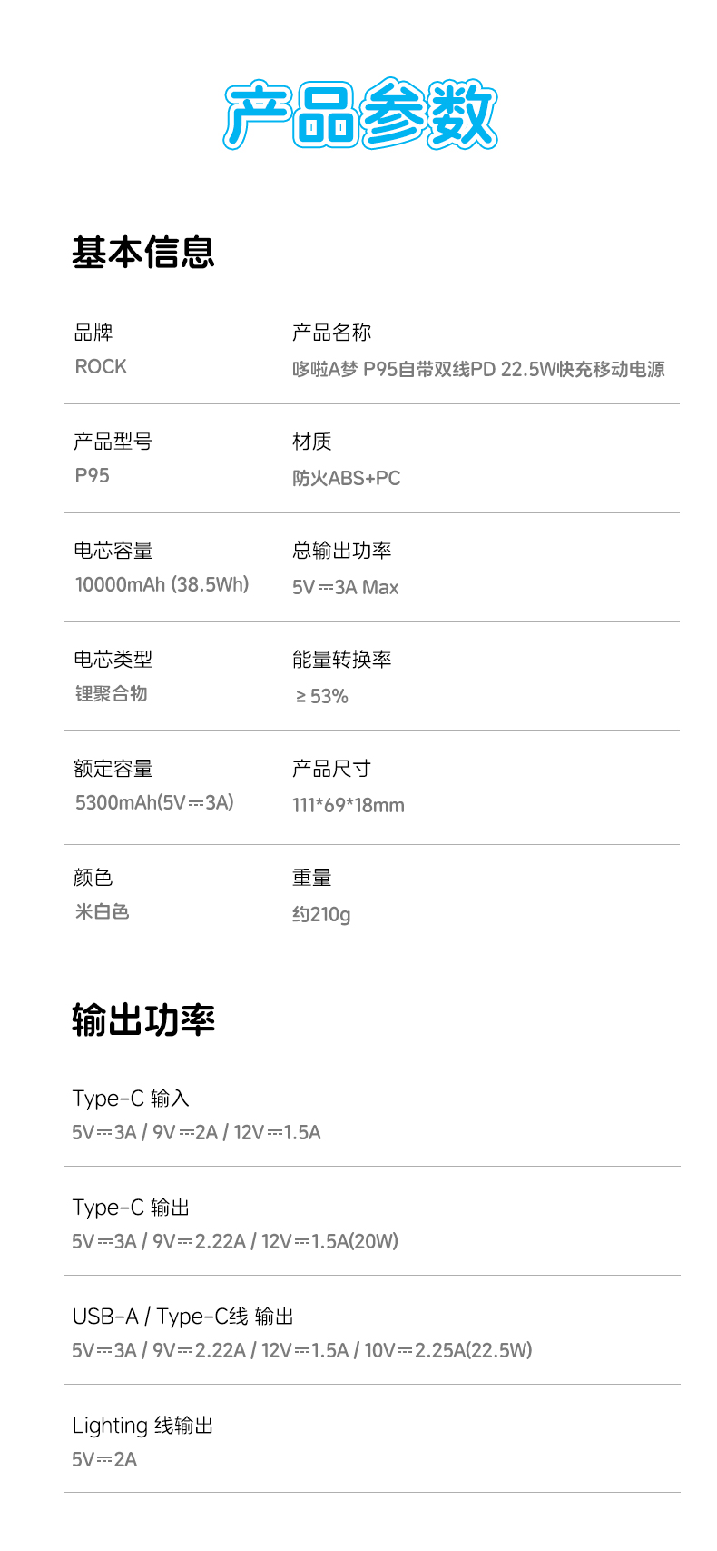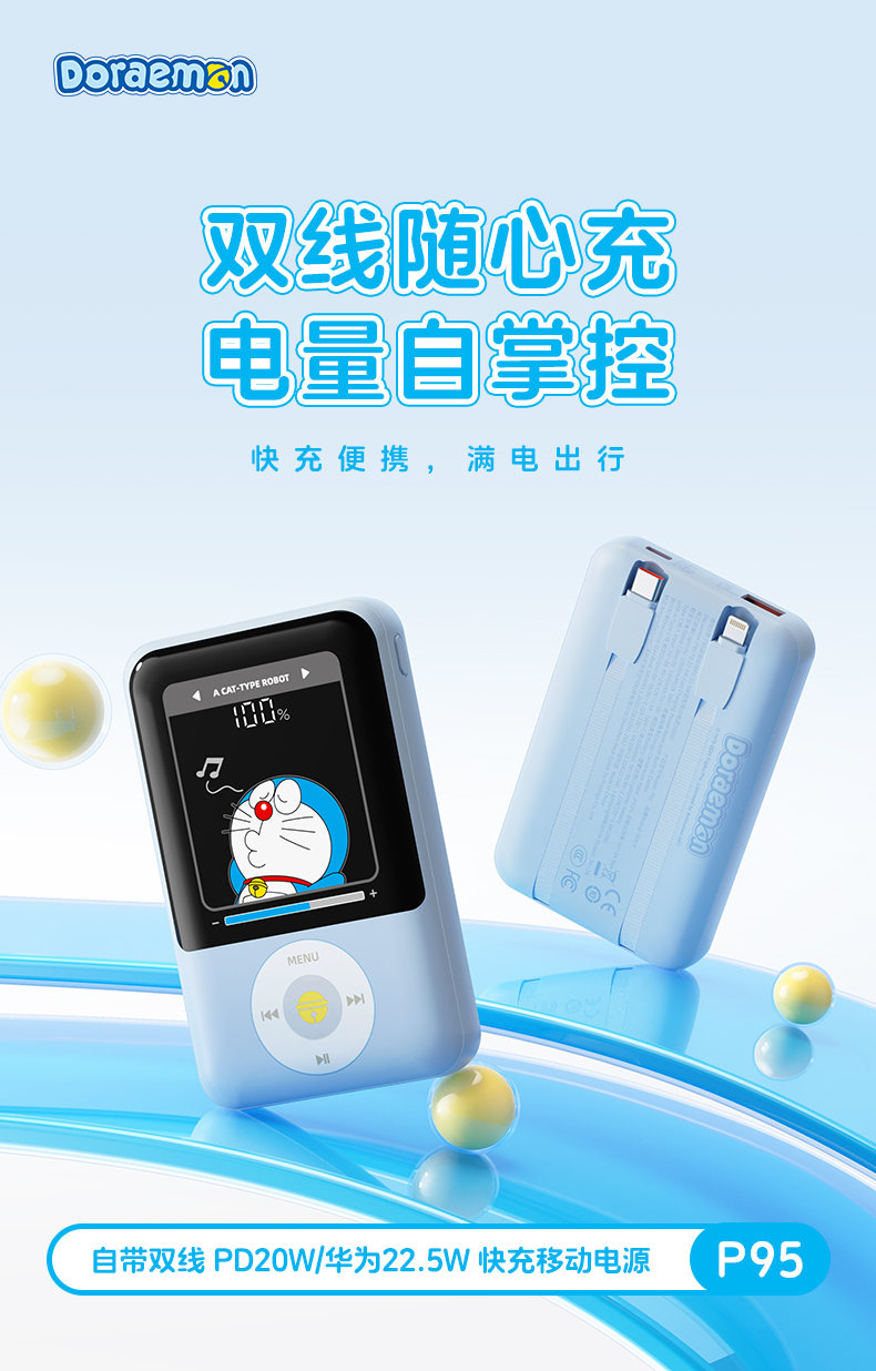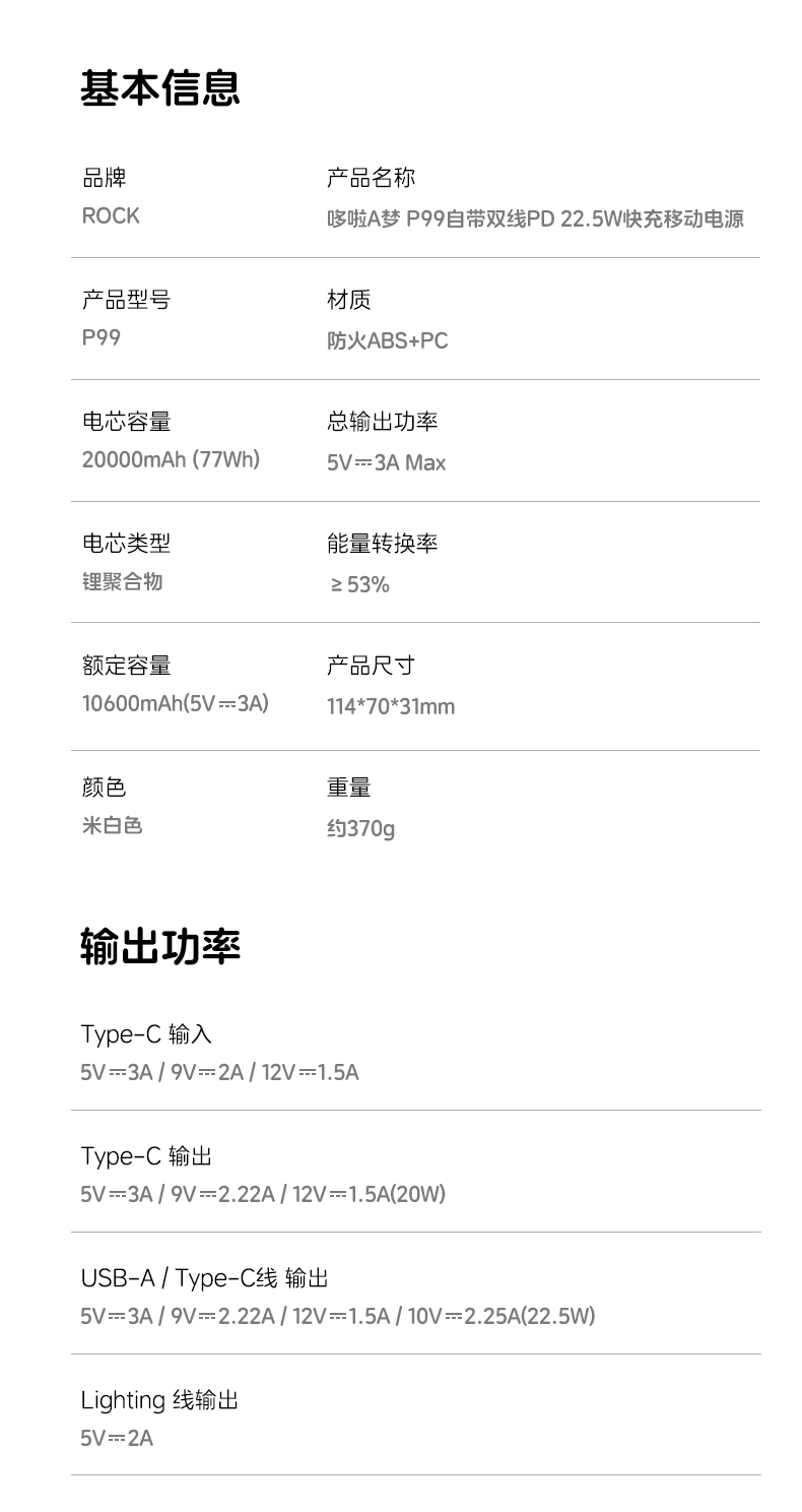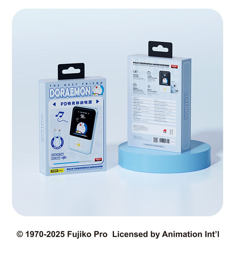 ROCK 哆啦A梦 P95/P99自带双线PD 22.5W快充移动电源10000/20000mah