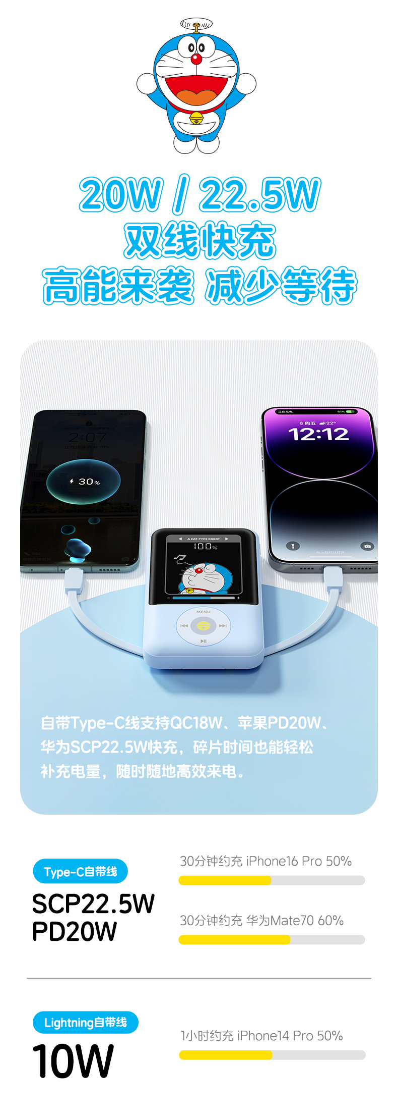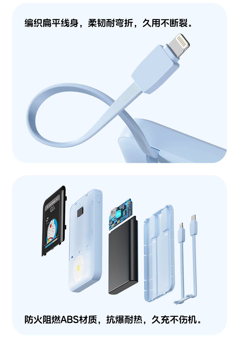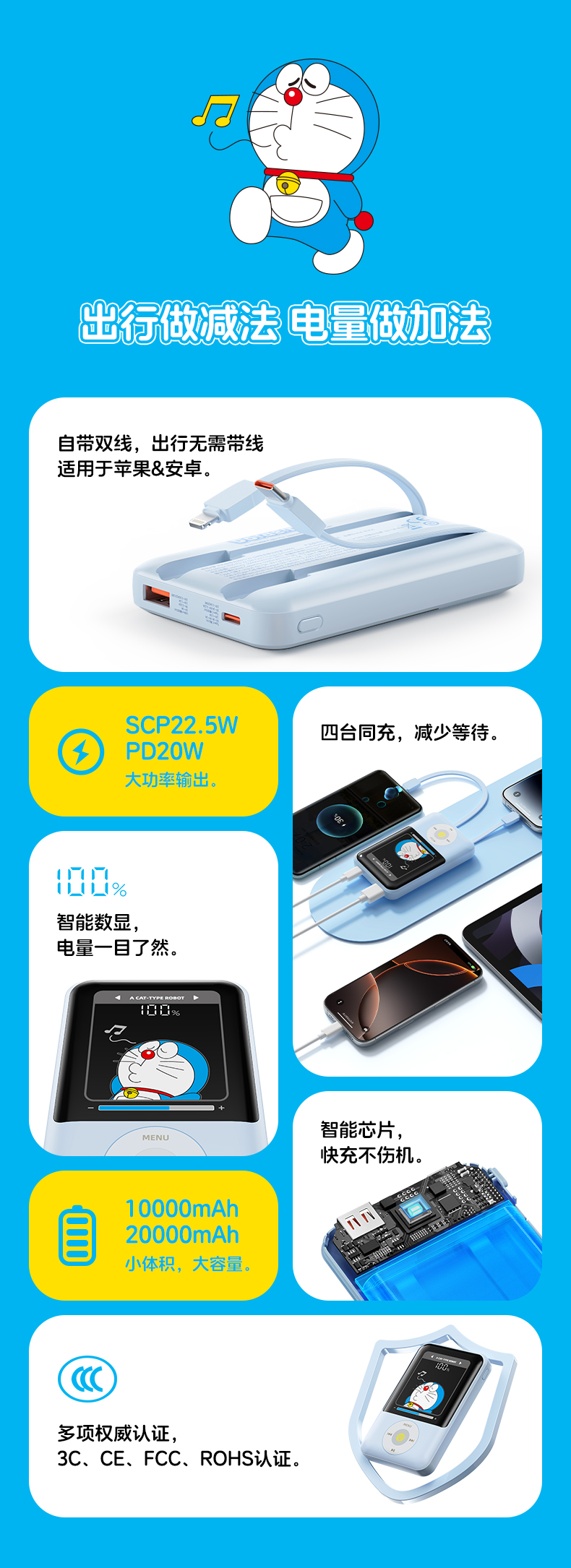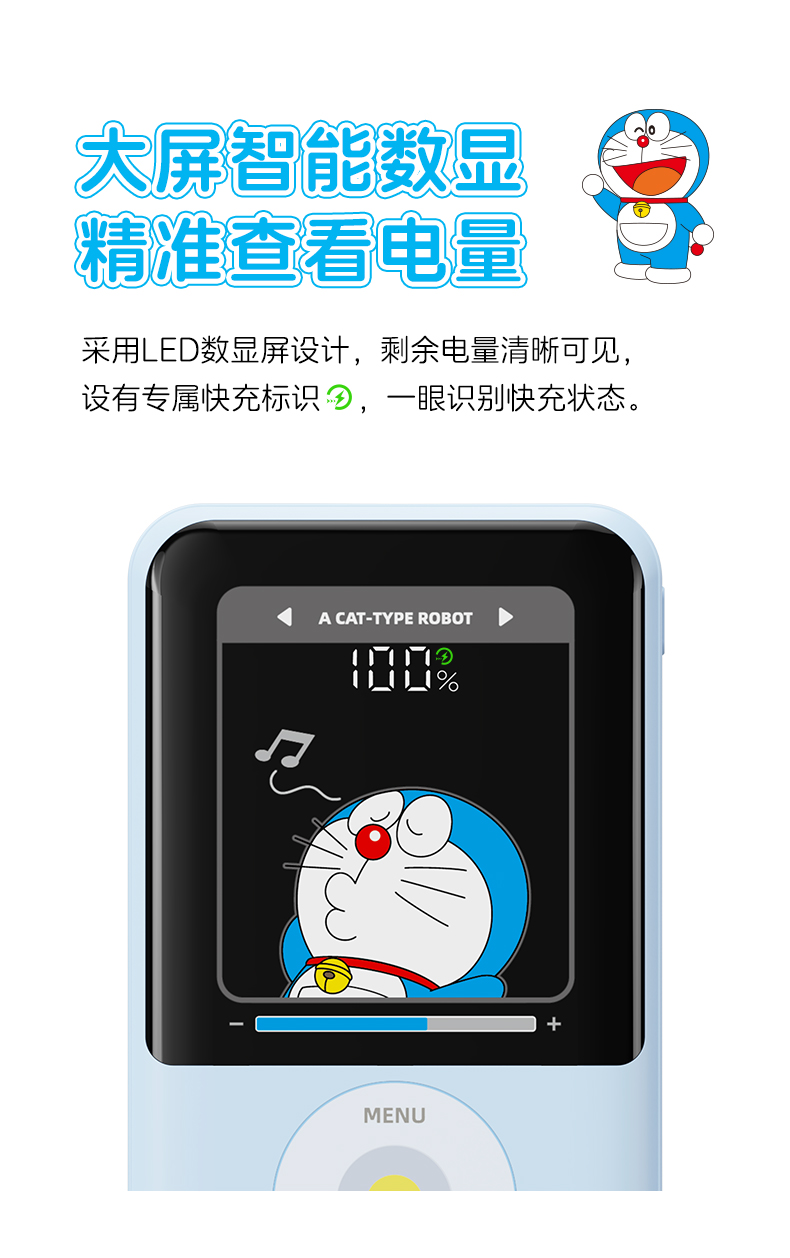 ROCK 哆啦A梦 P95/P99自带双线PD 22.5W快充移动电源10000/20000mah