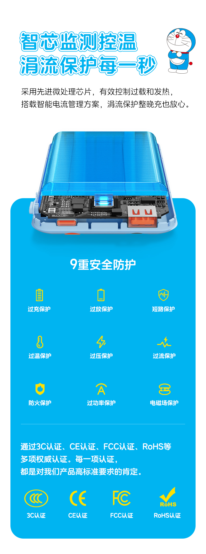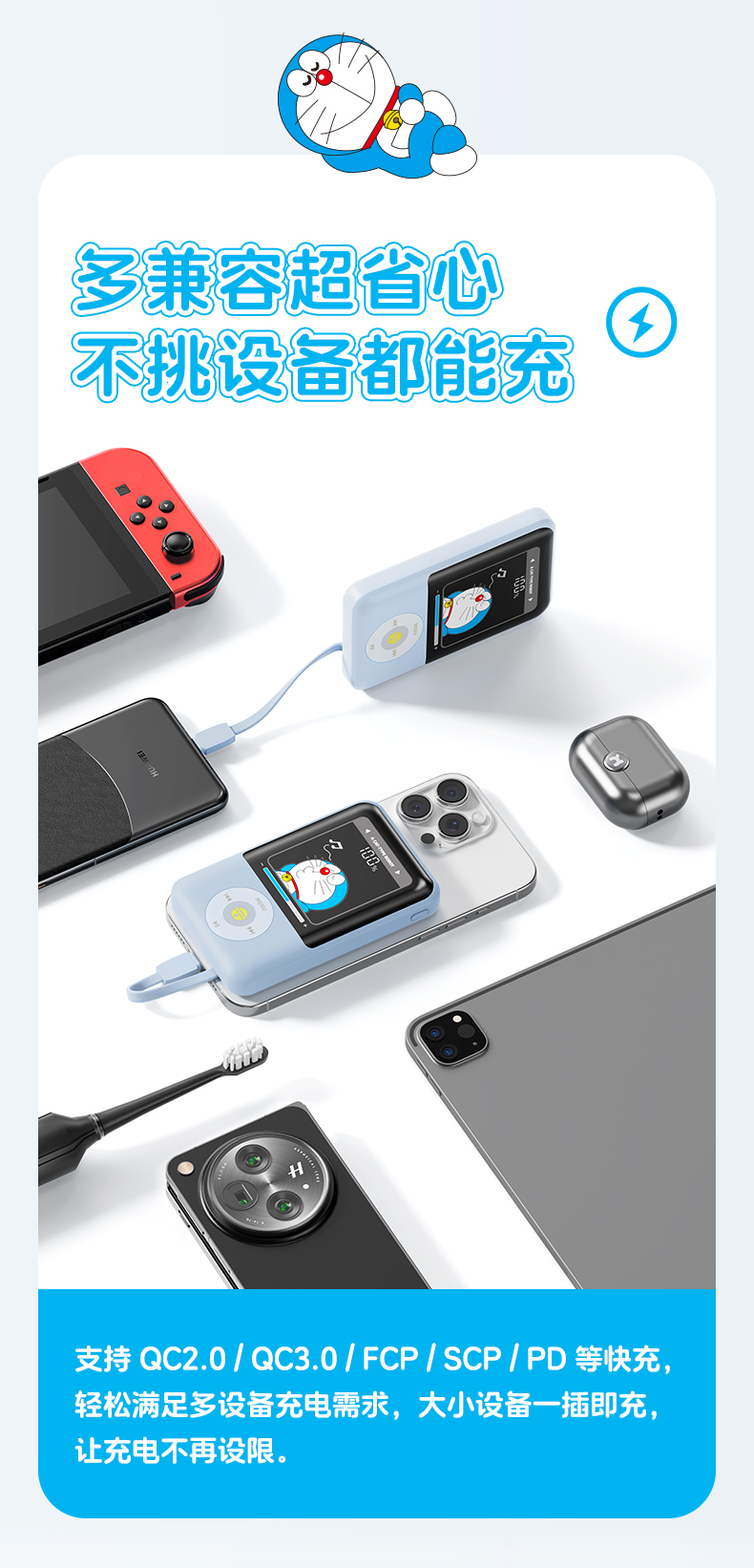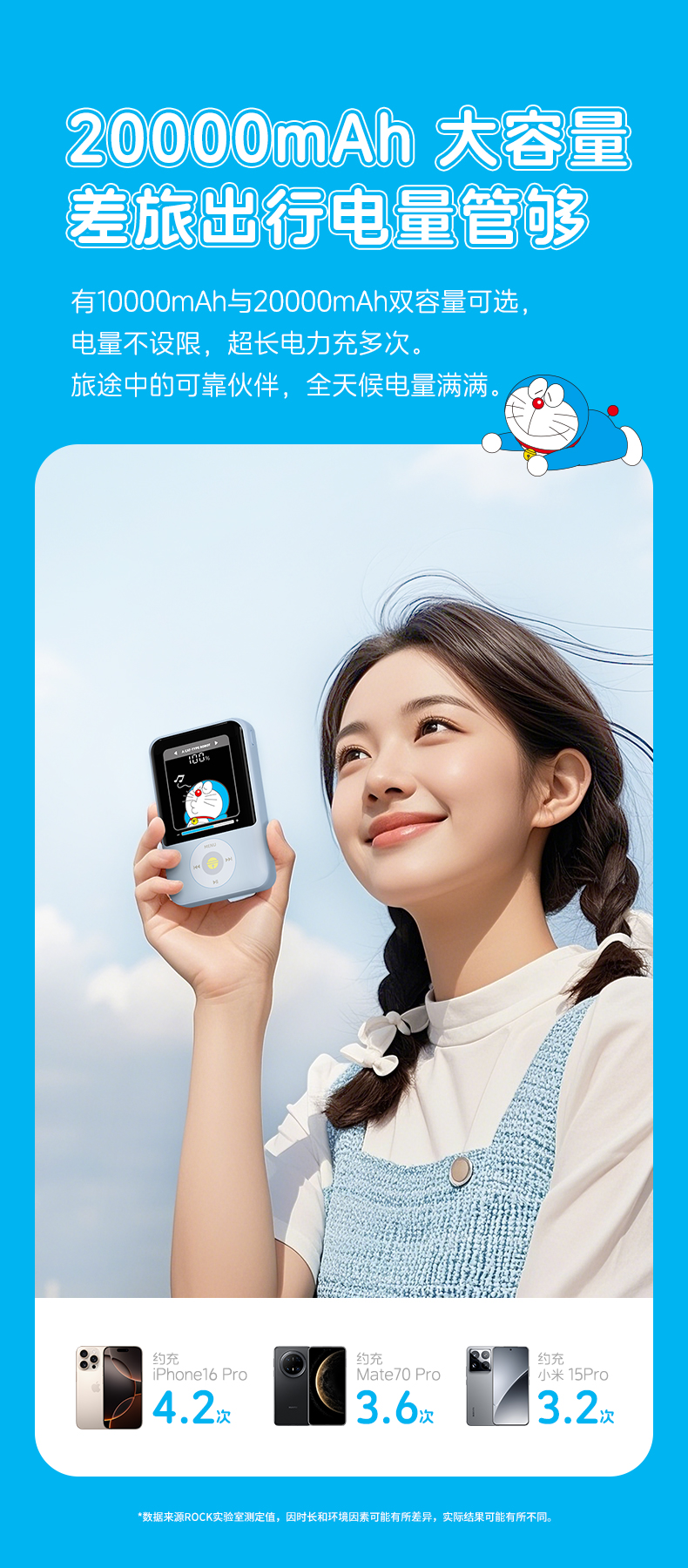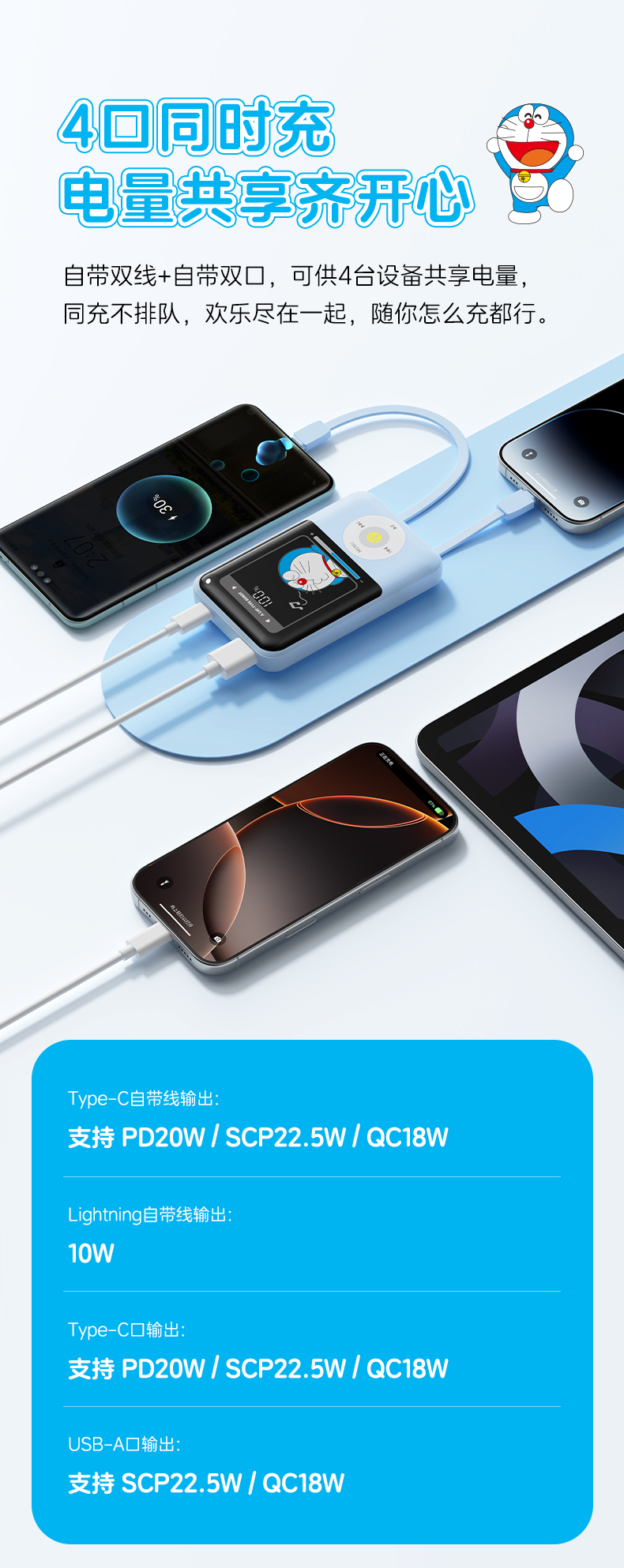 ROCK 哆啦A梦 P95/P99自带双线PD 22.5W快充移动电源10000/20000mah