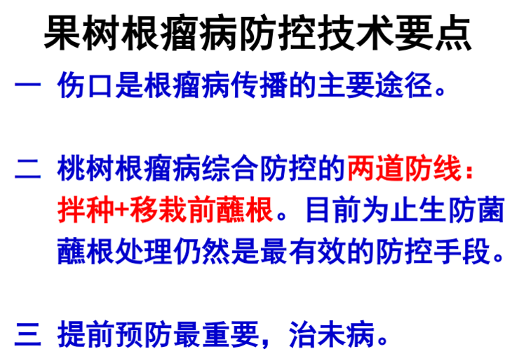研究表明,根瘤病病菌从伤口侵入,一旦质粒在染色体上完成整合,使用任何化学农药就没有任何意义。防控的唯一途径,就是设法别让致病菌接触到植物的伤口。