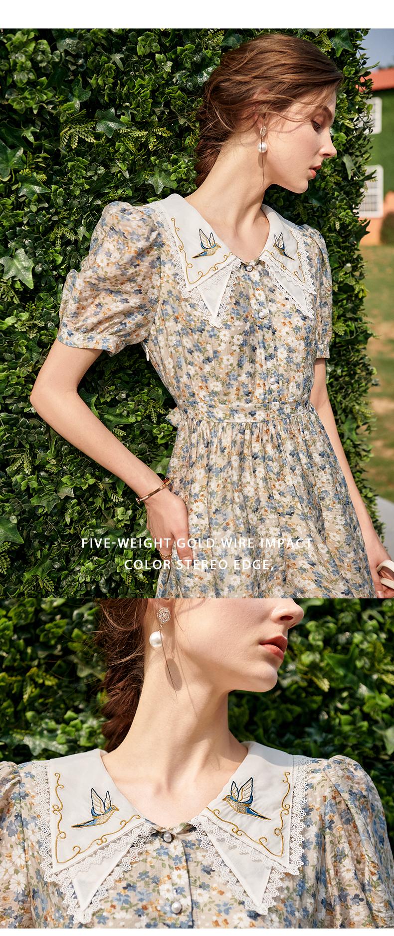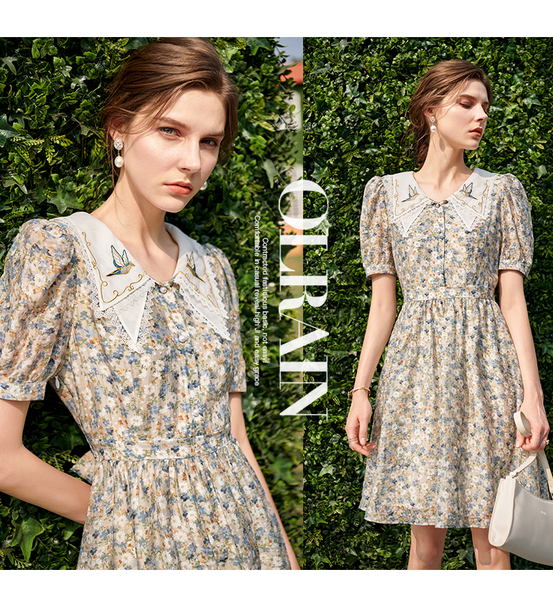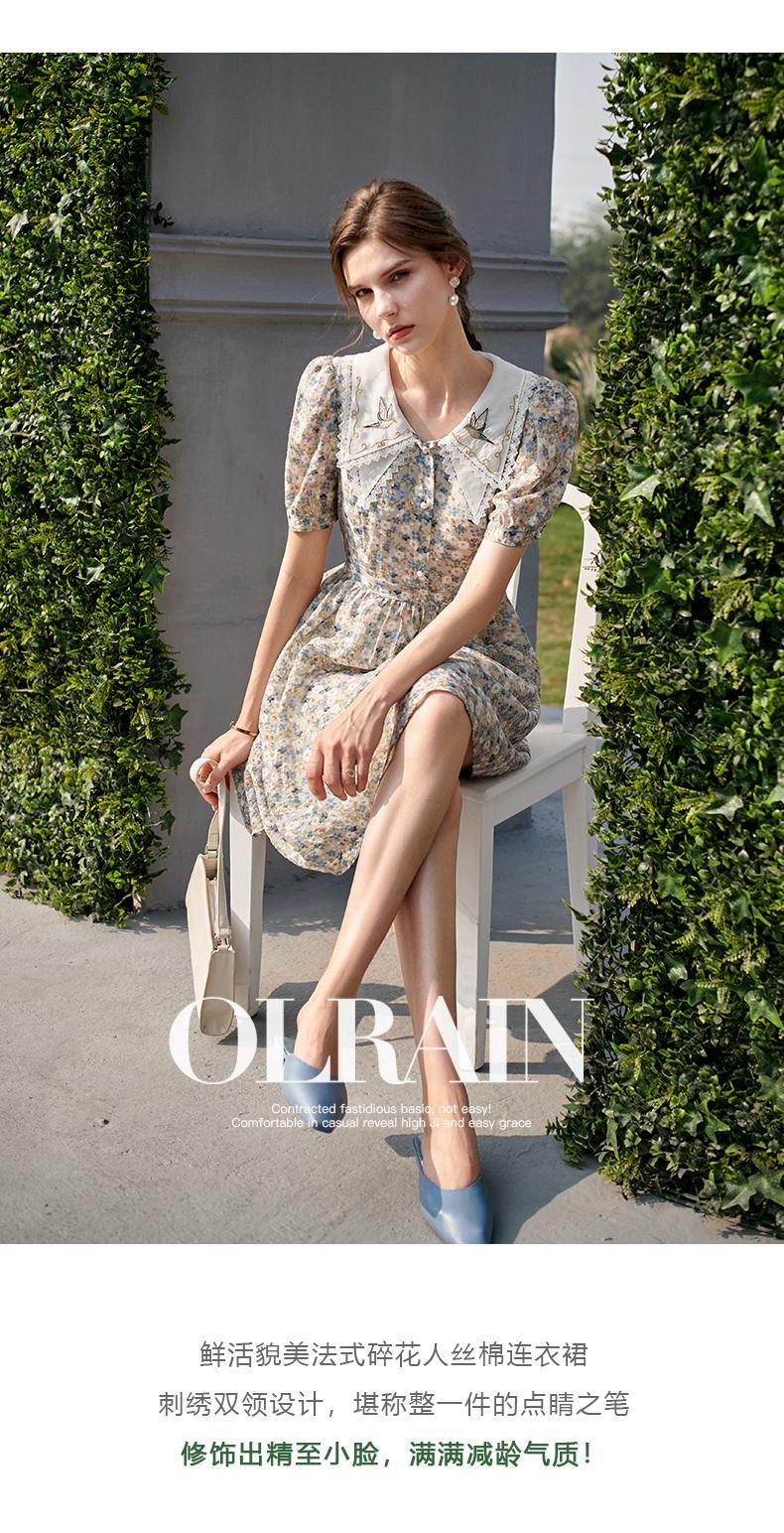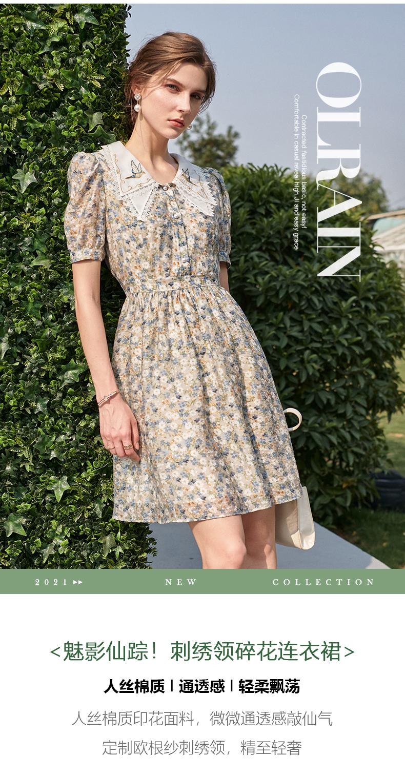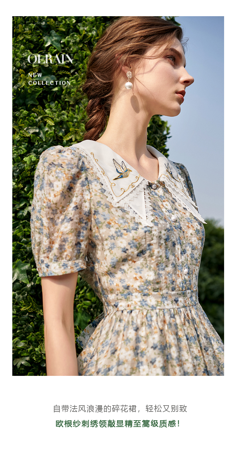 欧芮儿碎花短袖连衣裙2021新款收腰显瘦法式刺绣领时髦优雅裙