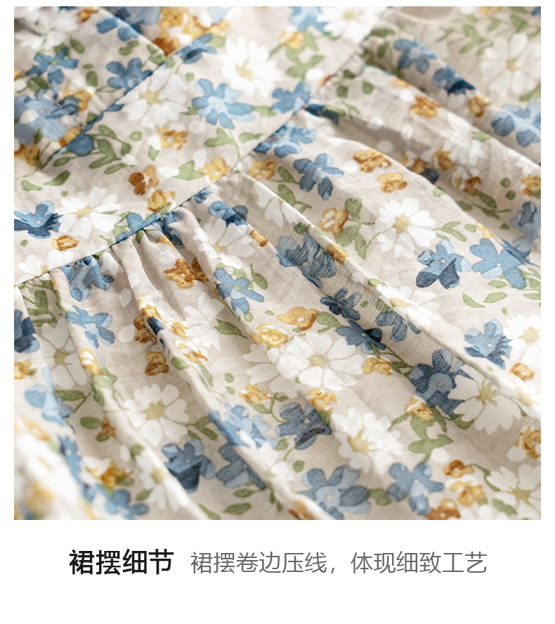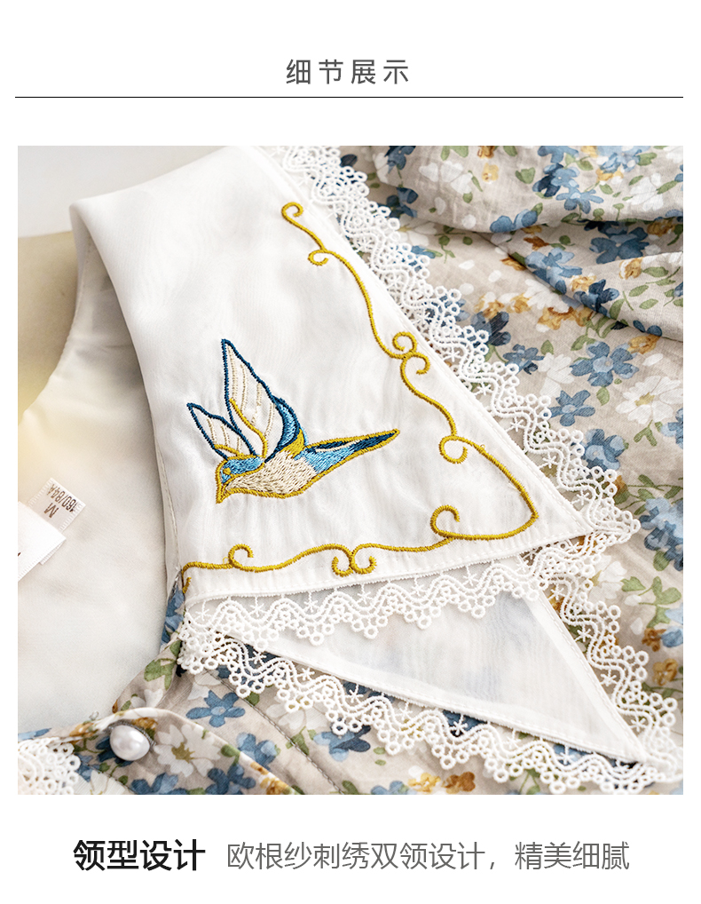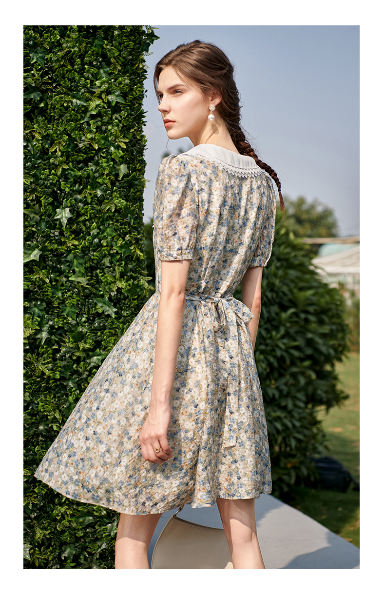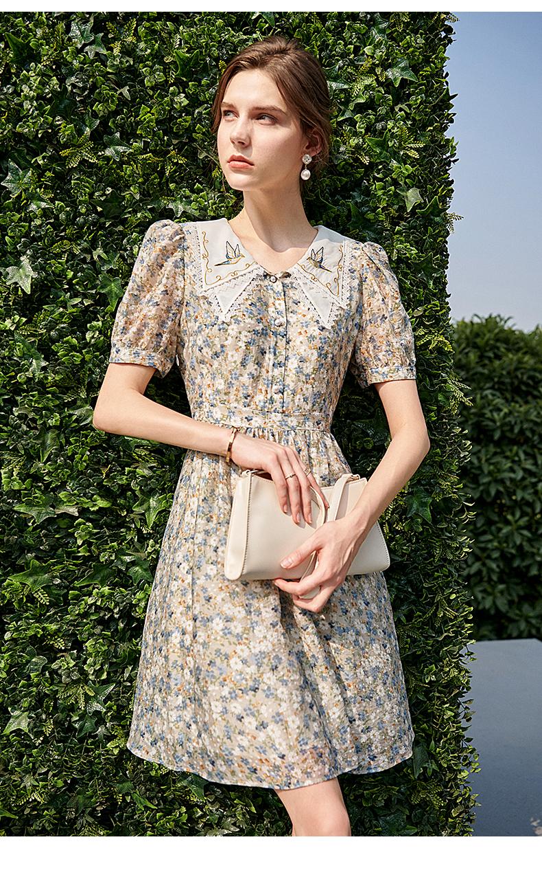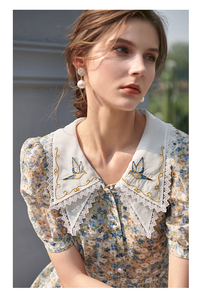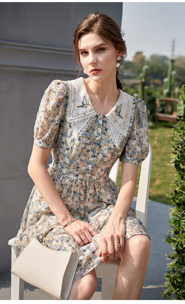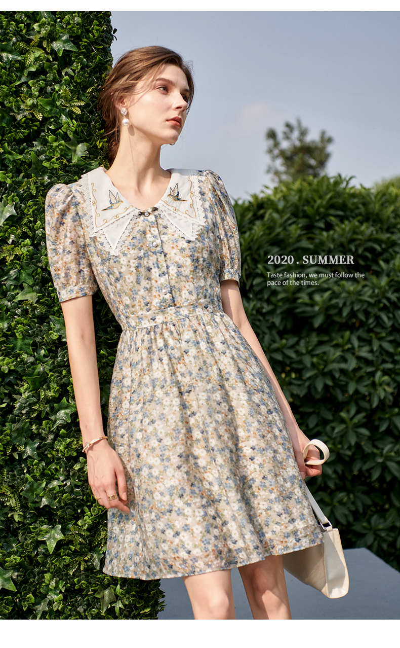 欧芮儿碎花短袖连衣裙2021新款收腰显瘦法式刺绣领时髦优雅裙