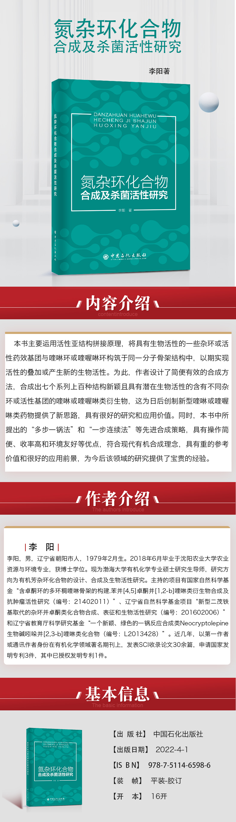 李阳,男,辽宁省朝阳市人,1979年2月生。2018年6月毕业于沈阳农业大学农业资源与环境专业,获博士学位。现为渤海大学有机化学专业硕士研究生导师,研究方向为有机芳杂环化合物的设计、合成及生物活性研究。主持的项目有国家自然科学基金“含卓酮环的多环稠喹啉骨架的构建.苯并[4,5]卓酮并[1,2-b]喹啉类衍生物合成及抗肿瘤活性研究(编号:21402011)”、辽宁省自然科学基金项目“新型二茂铁基取代的杂环并卓酮类化合物合成、表征和生物活性研究(编号:201602006)”和辽宁省教育厅科学研究基金“一个新颖、绿色的一锅反应合成类Neocryptolepine 生物碱吲哚并[2,3-b]喹啉类化合物(编号:L2013428)”。近几年,以*作者或通讯作者身份在有机化学领域*期刊上,发表SCI收录论文30余篇,申请国家发明专利3件,其中已授权发明专利1件。