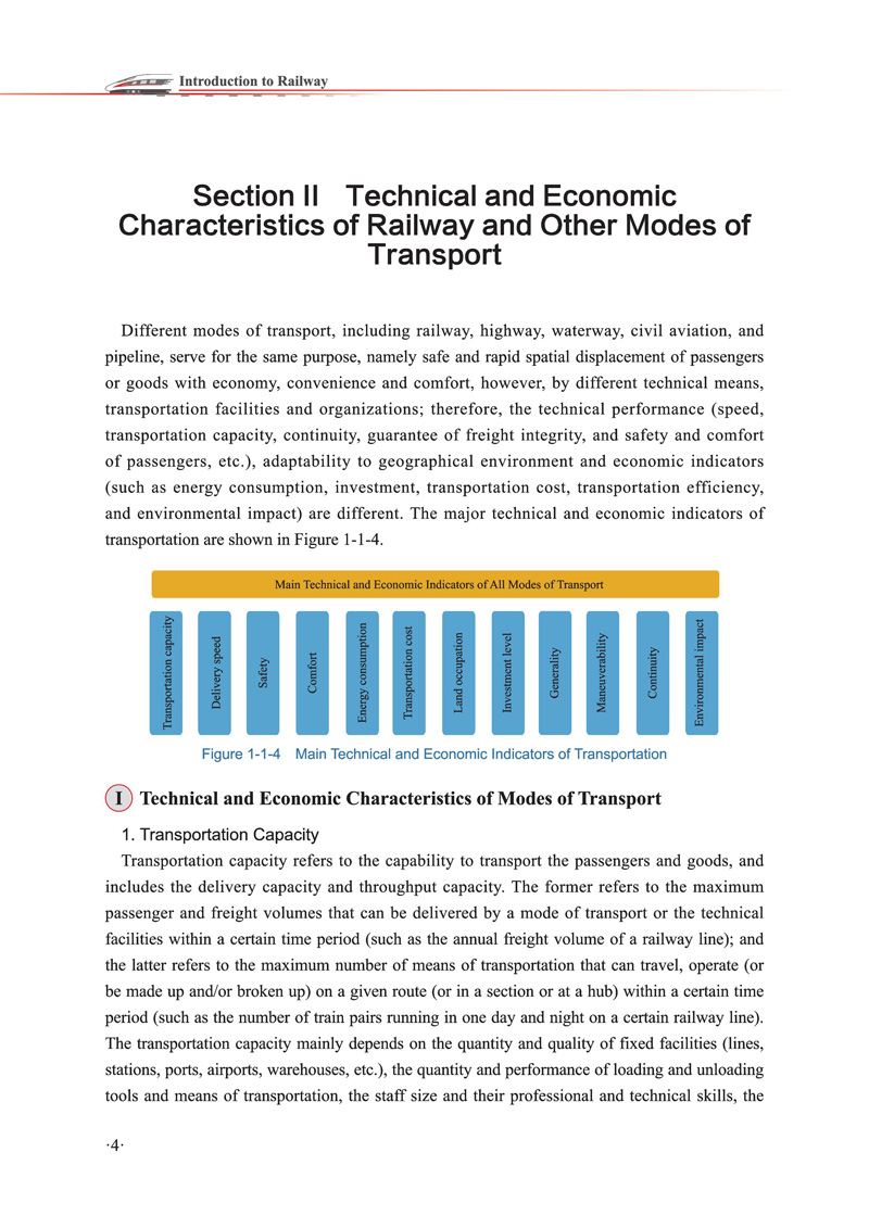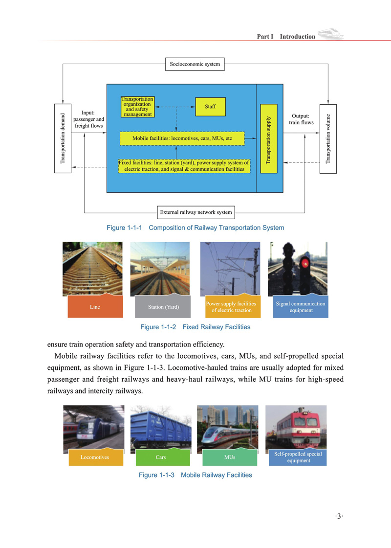 本书适应“一带一路”倡议和“铁路走出去”战略对国际铁路培训的需要,结合铁路最新技术、装备,充分展示了中国铁路的最新成就,系统阐述了铁路设备及运营管理的基础知识与原理,科学解释中国铁路的热点、难点问题,包括绪论、铁路运输基本设备、铁路运输组织与安全管理等3篇共15章,以“概述—基础固定设施—载运工具—车站-信号通信—运输组织与安全管理”为主线,对现代交通运输、铁路分类、铁路建设与发展、铁路管理、铁路线路、牵引供电系统、机车车辆、车站、信号与通信设备、运输组织及安全管理等内容进行了系统阐释和梳理。