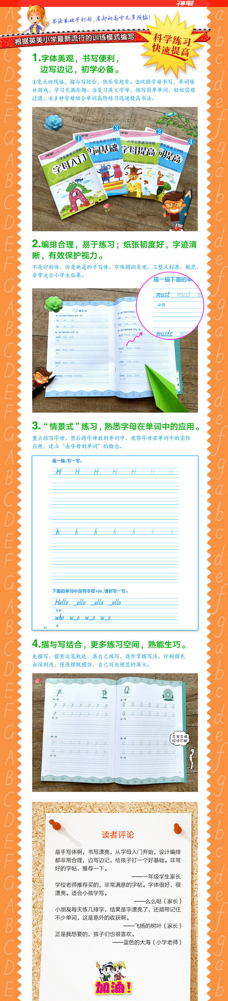 于文涛:著名英文书写者,其英文手写体工整美观,标准规范,适合小学生模仿。曾出版过多种小学英语字帖,当当网读者上千条好评,销量高居同类字帖榜首,得到学生、老师和家长的高度认可。《小学英语通用临摹字帖》(基础版、提高版、优化版)、《小学英语字帖》(推荐单词天天练、推荐短语天天练、推荐句子天天练、推荐口语天天练)得到广大老师、家长和小学生的喜爱。