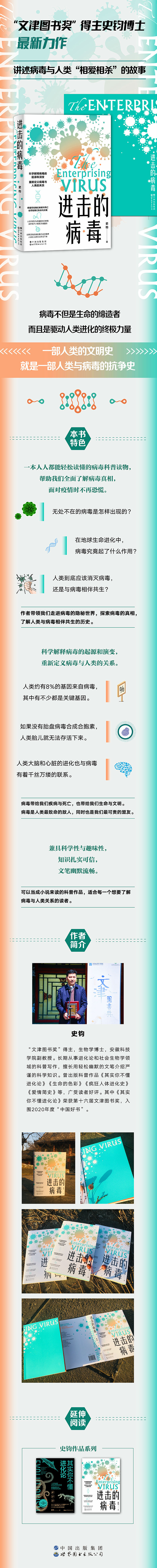 (1)“文津图书奖”得主史钧博士新力作,讲述病毒与人类“相爱相杀”的故事。作者以生动有趣的文笔,从进化论的视角讲述了病毒驱动人类进化的历程,以及人类与病毒的抗争史,帮助我们了解人类与病毒相伴共生的历史。