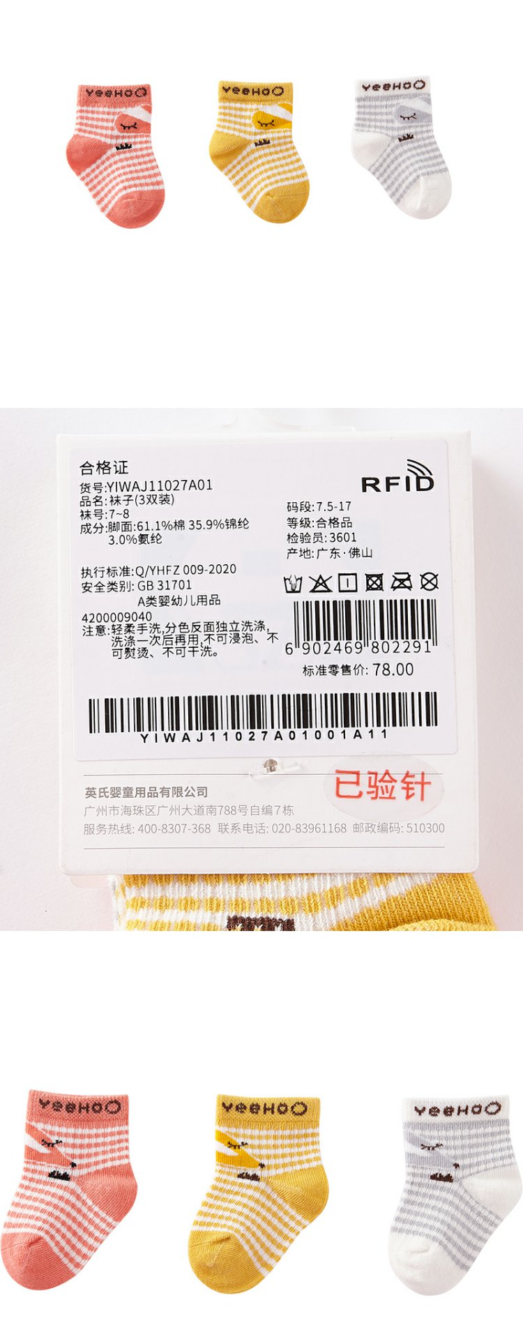 英氏婴儿袜子男女宝3双装袜四季袜YIWAJ11027A01 YIWAJ11026A01