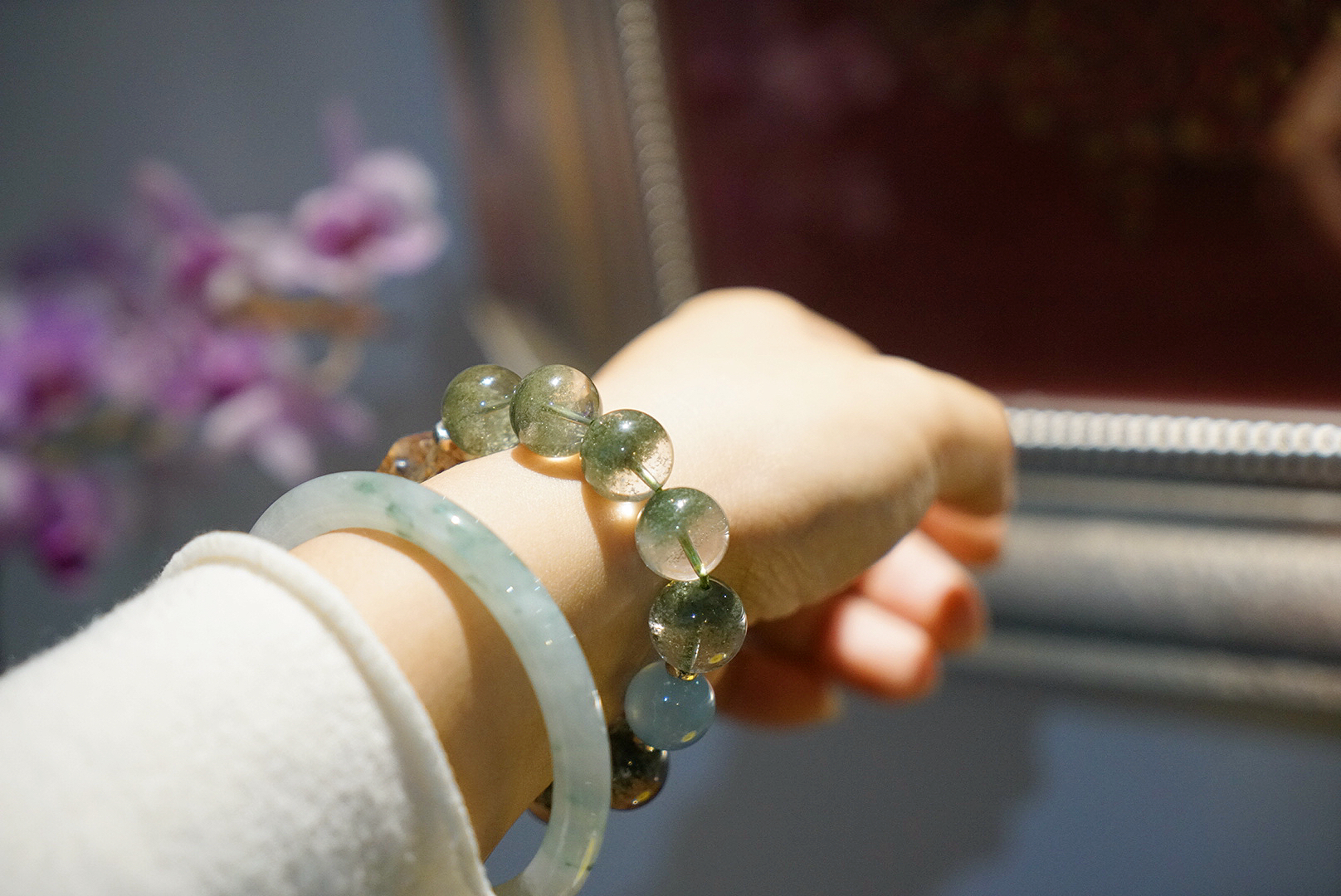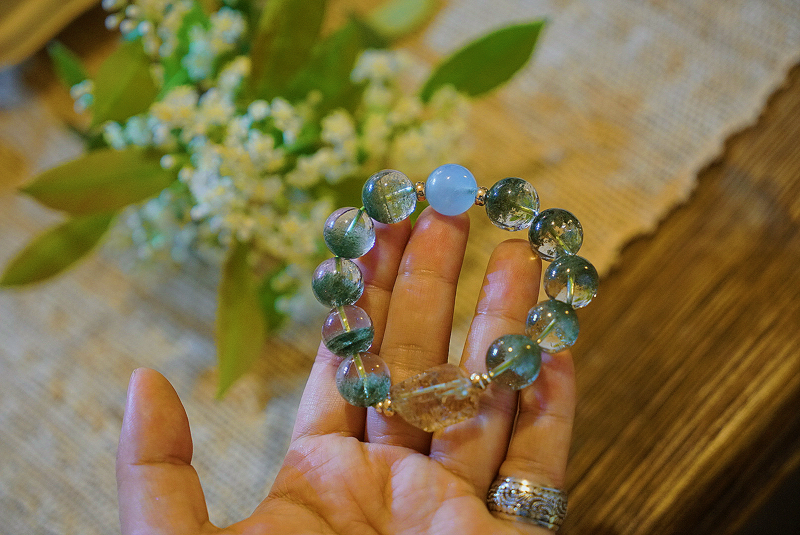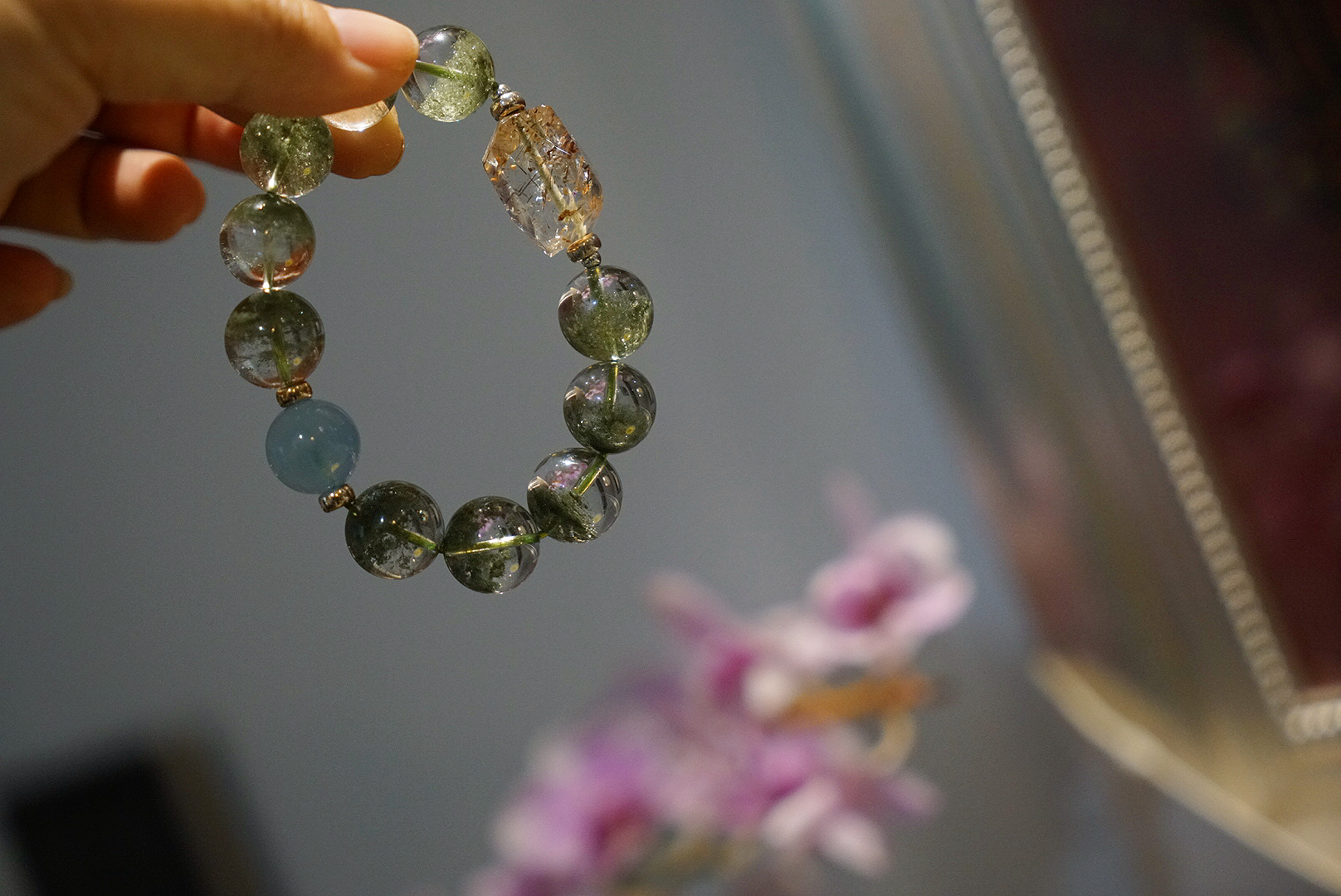 所以很推荐喜欢绿幽灵的朋友,珠子直径大气有存在感又不会太抢眼,整体就很舒服匀称再加上海蓝宝,旺事业的绿幽灵当然需要海蓝宝的沟通能量,再增强一点吸金力,黑金超七,超大颗,旺旺旺!