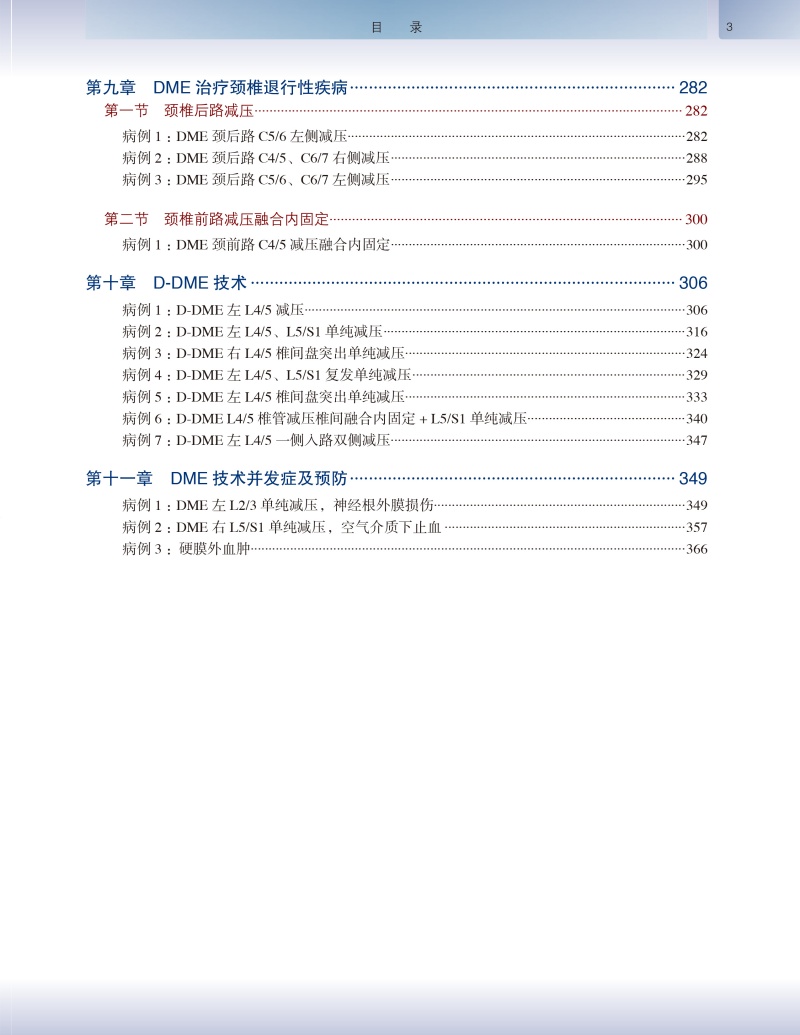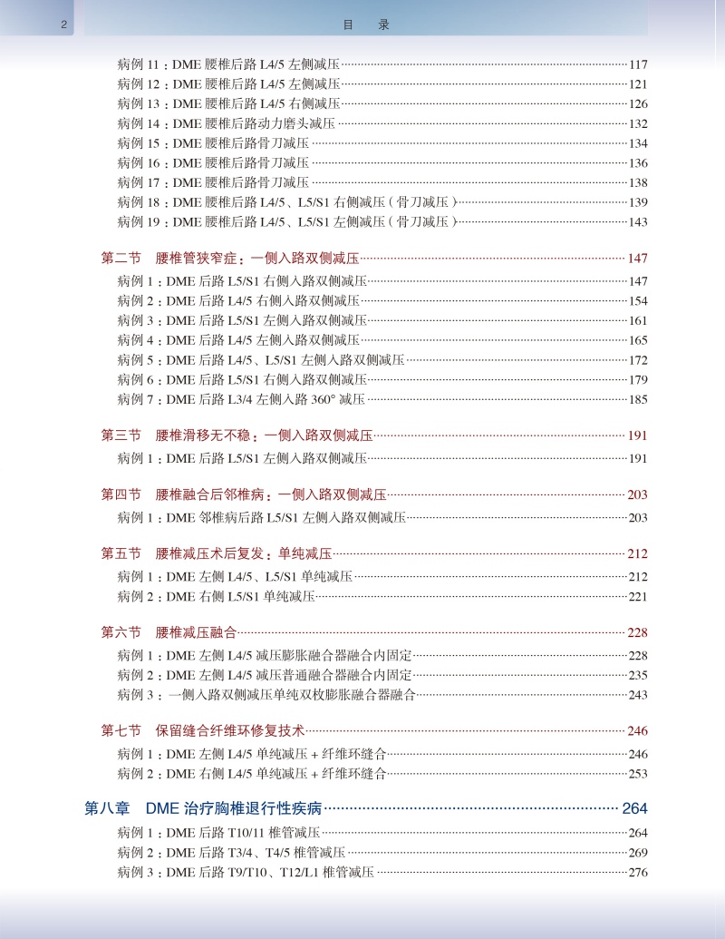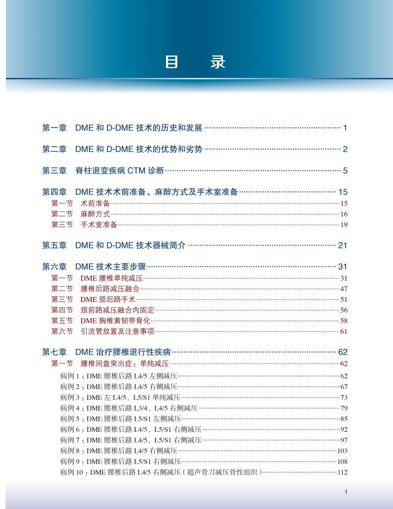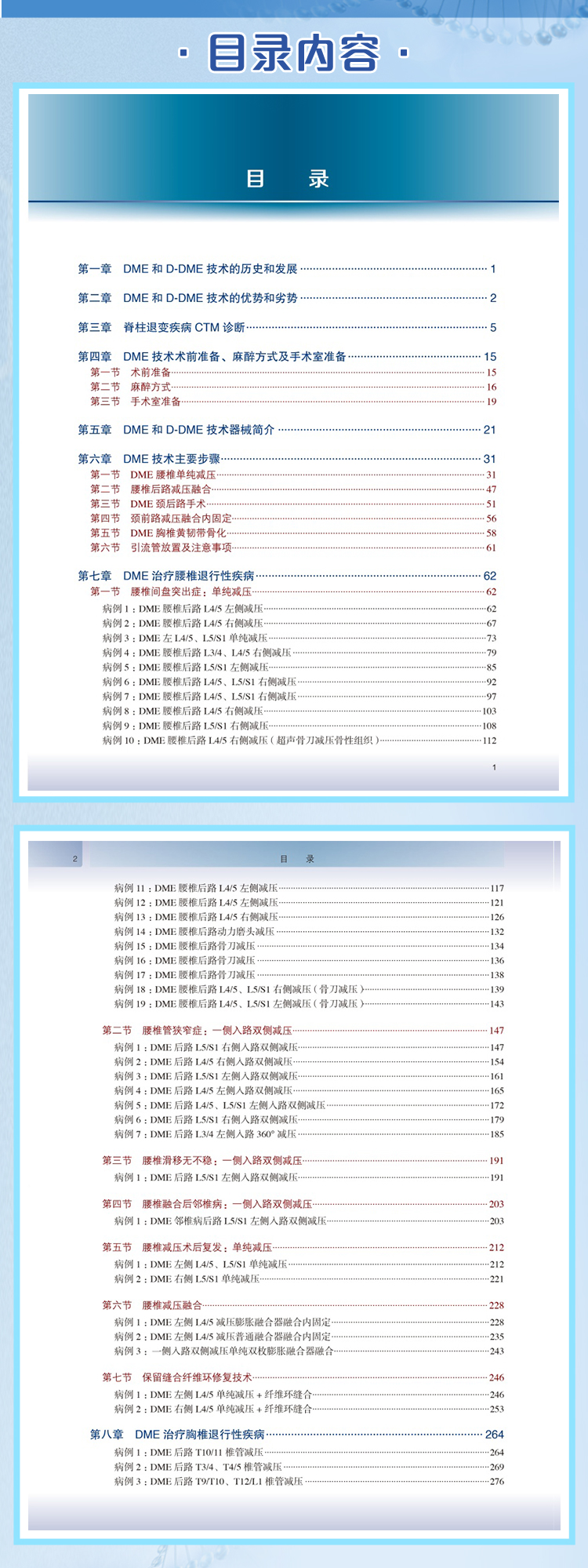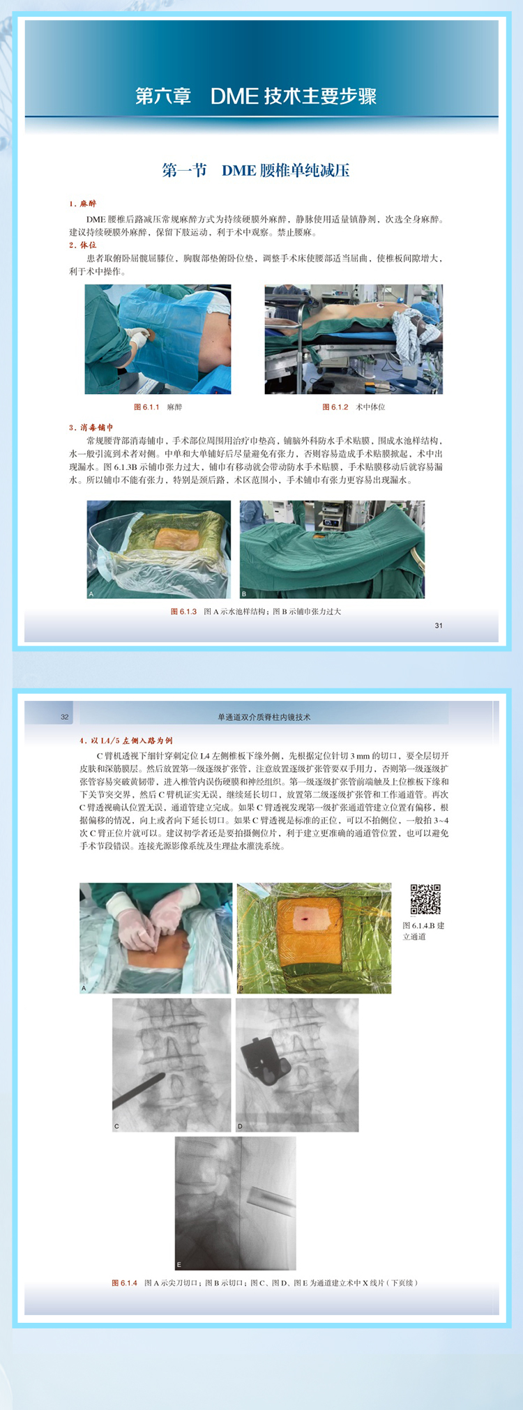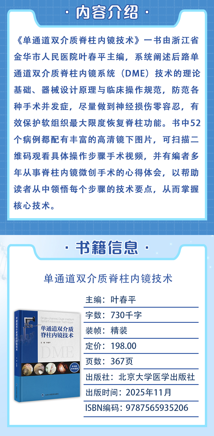 《单通道双介质脊柱内镜技术》一书由浙江省金华市人民医院叶春平主编,系统阐述后路单通道双介质脊柱内镜系统(DME)技术的理论基础、器械设计原理与临床操作规范,防范各种手术并发症,尽量做到神经损伤零容忍,有效保护软组织最大限度恢复脊柱功能。书中52个病例都配有丰富的高清镜下图片,可扫描二维码观看具体操作步骤手术视频,并有编者多年从事脊柱内镜微创手术的心得体会,以帮助读者从中领悟每个步骤的技术要点,从而掌握核心技术。