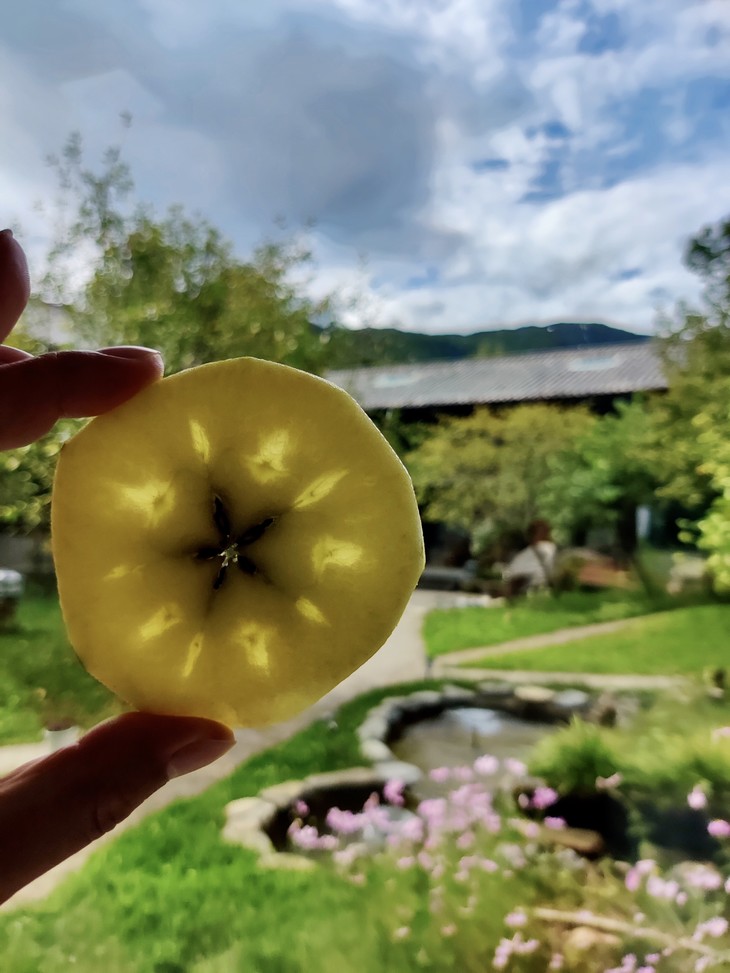 它的生长环境,是每一颗追求美味苹果梦寐以求的圣地。第一次买丑苹果的人,看到它的第一眼,可能会觉得有点小失望,当你吃到嘴里的时候,甜蜜脆爽在嘴里化开,浓浓果香扑鼻而来,让人感到惊喜和确幸!极大的昼夜温差,使得糖分在果核周围形成独特的果糖结晶,也就我们所说的冰糖心!诺,切开就像果肉里装着一块霜花,散发着诱人的香甜!将果肉切成薄片对着太阳,结晶的糖心闪亮如剔透霜花,好看极了。霜降过后,秋去冬欲来,十一前后的泸沽湖丑苹果更甜,保存时间较长,从树上直接采摘后新鲜发出到家,不用担心存放问题。