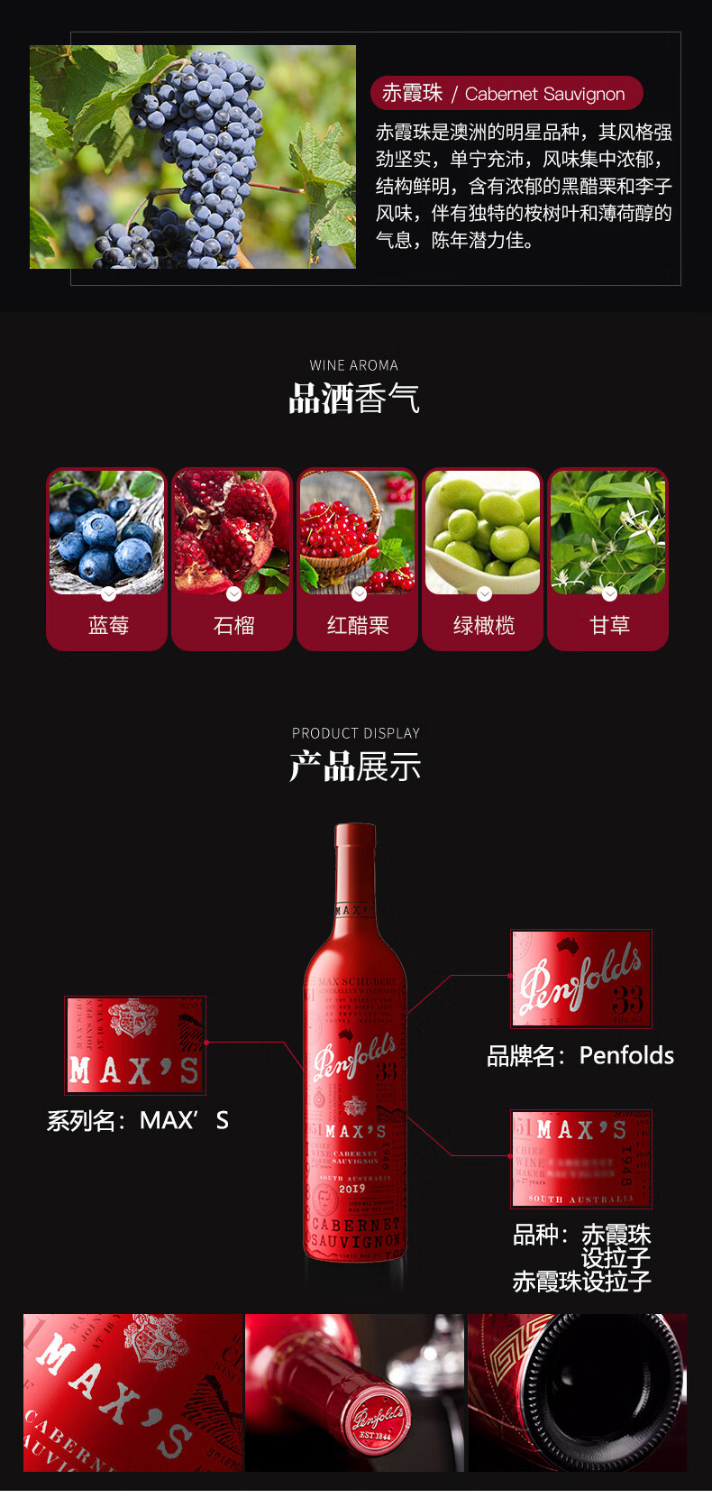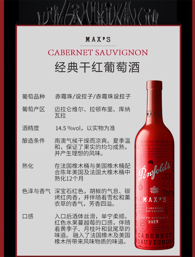 奔富麦克斯红酒Max赤霞珠干红葡萄酒750ml*1瓶
