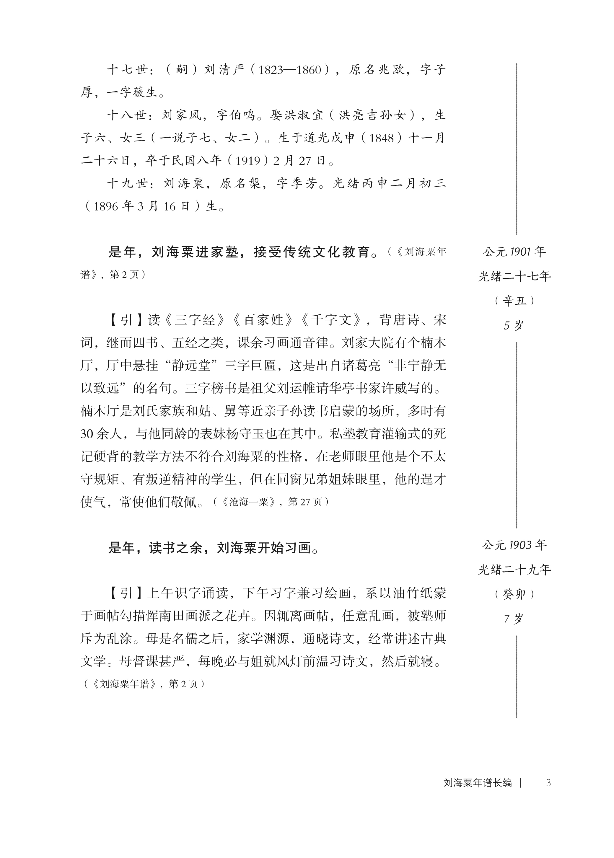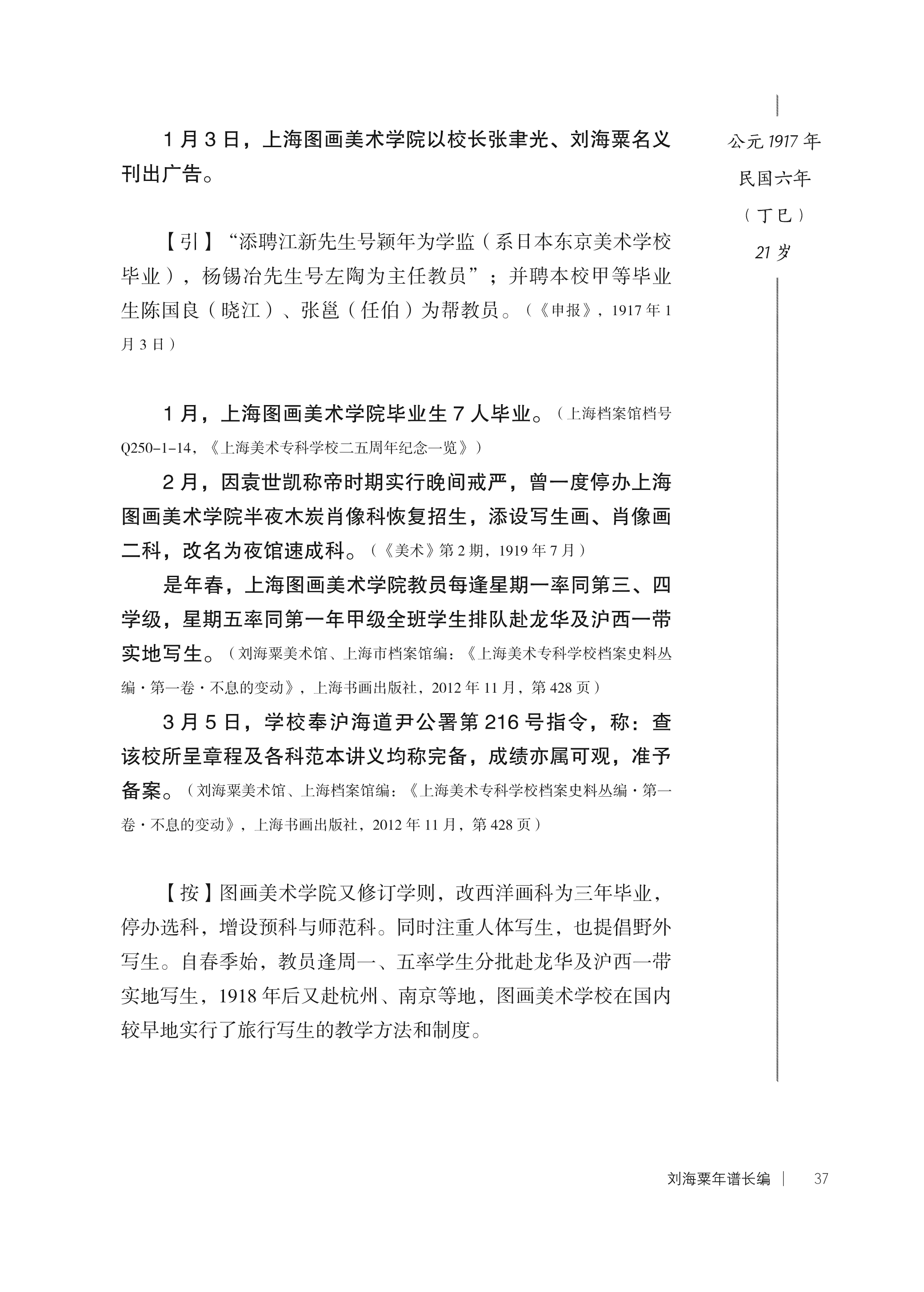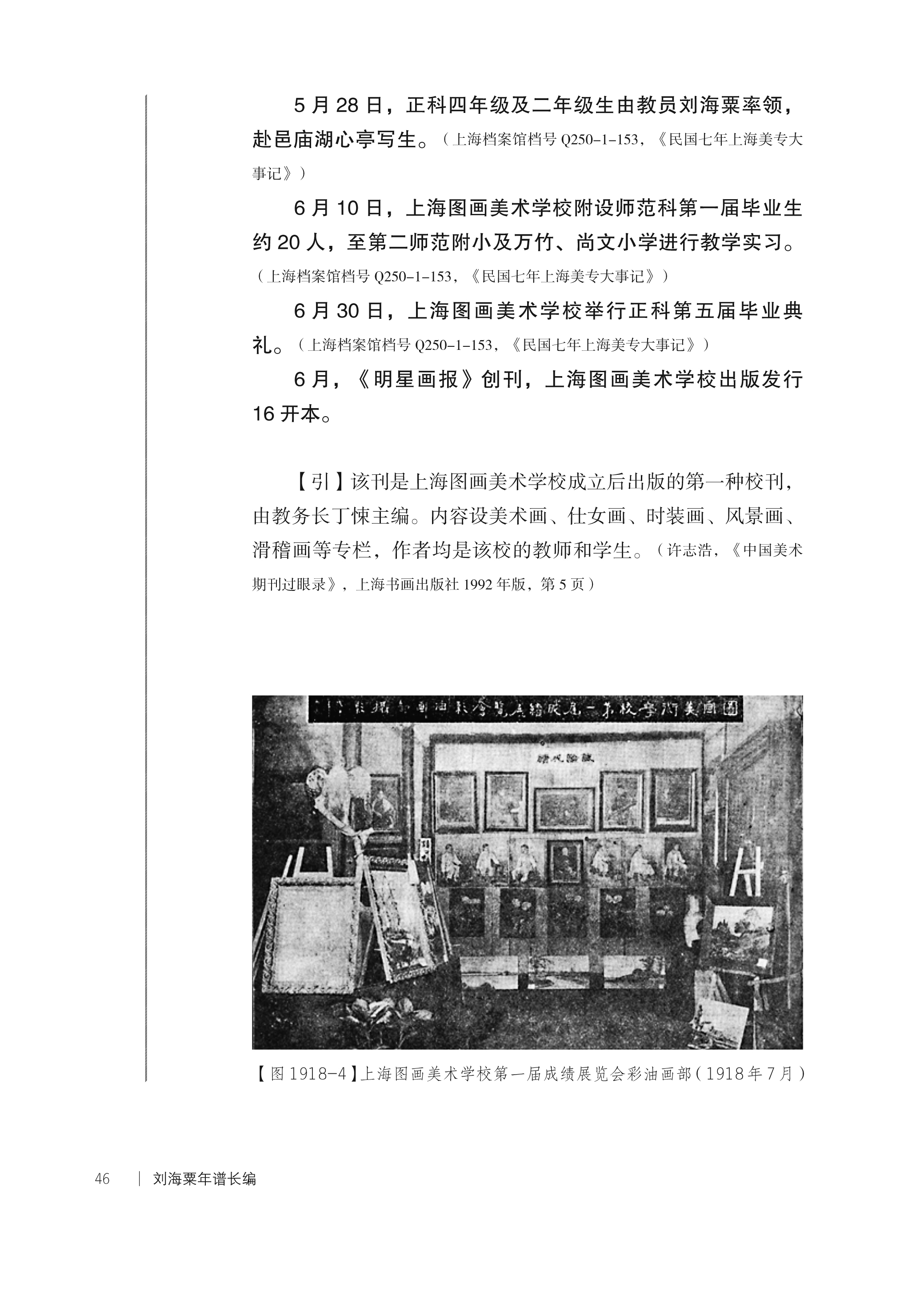 《刘海粟年谱长编》注重资料的原始性、初显性、史料性与完整性,对谱主重要作品、著述及所涉及的重要人物之文献、论述等相关内容,均依式迻录或分类附录,以便研究者引用参考方便。为增强《长编》的可读性以及显示资料的丰富性与完整性,在按照历时性、共时性的特点,有机楔入相关历史、艺术、人物图片,以便读者阅读思考。