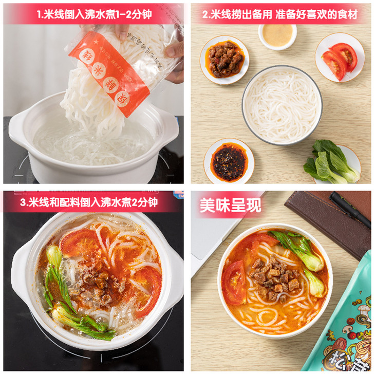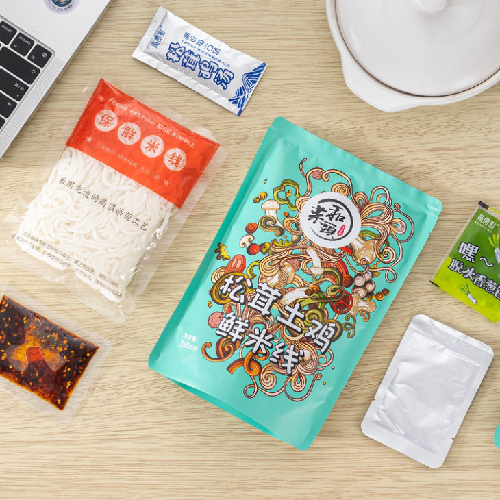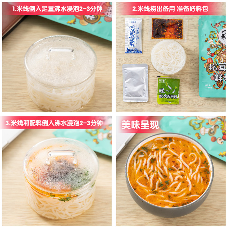 配料包含:鲜米线包、菌子米线酱包、松茸鸡汤包、油辣椒包、脱水香葱包