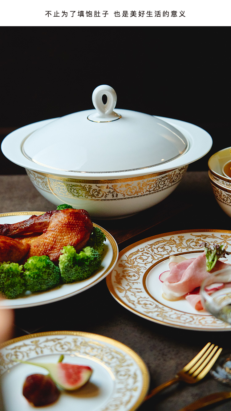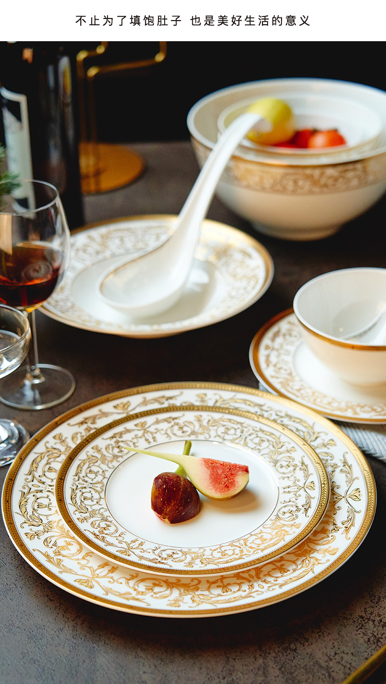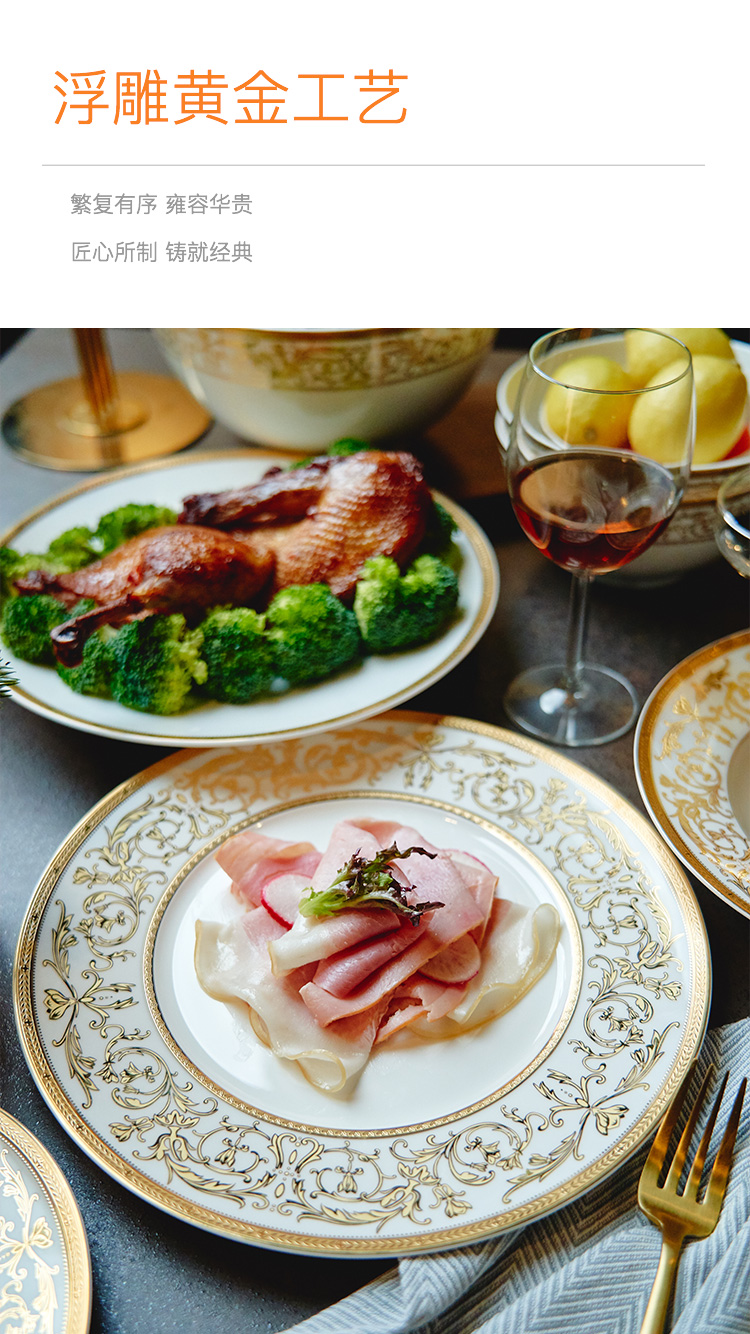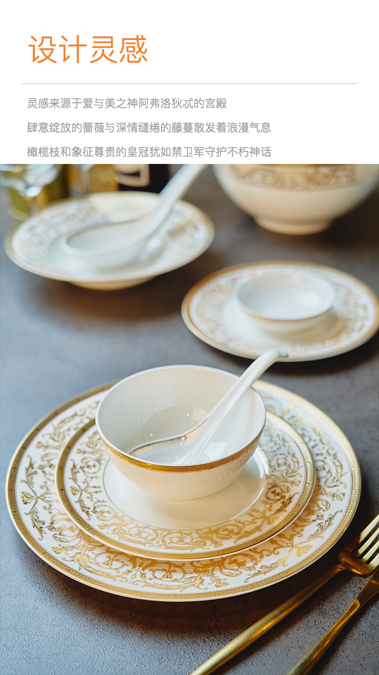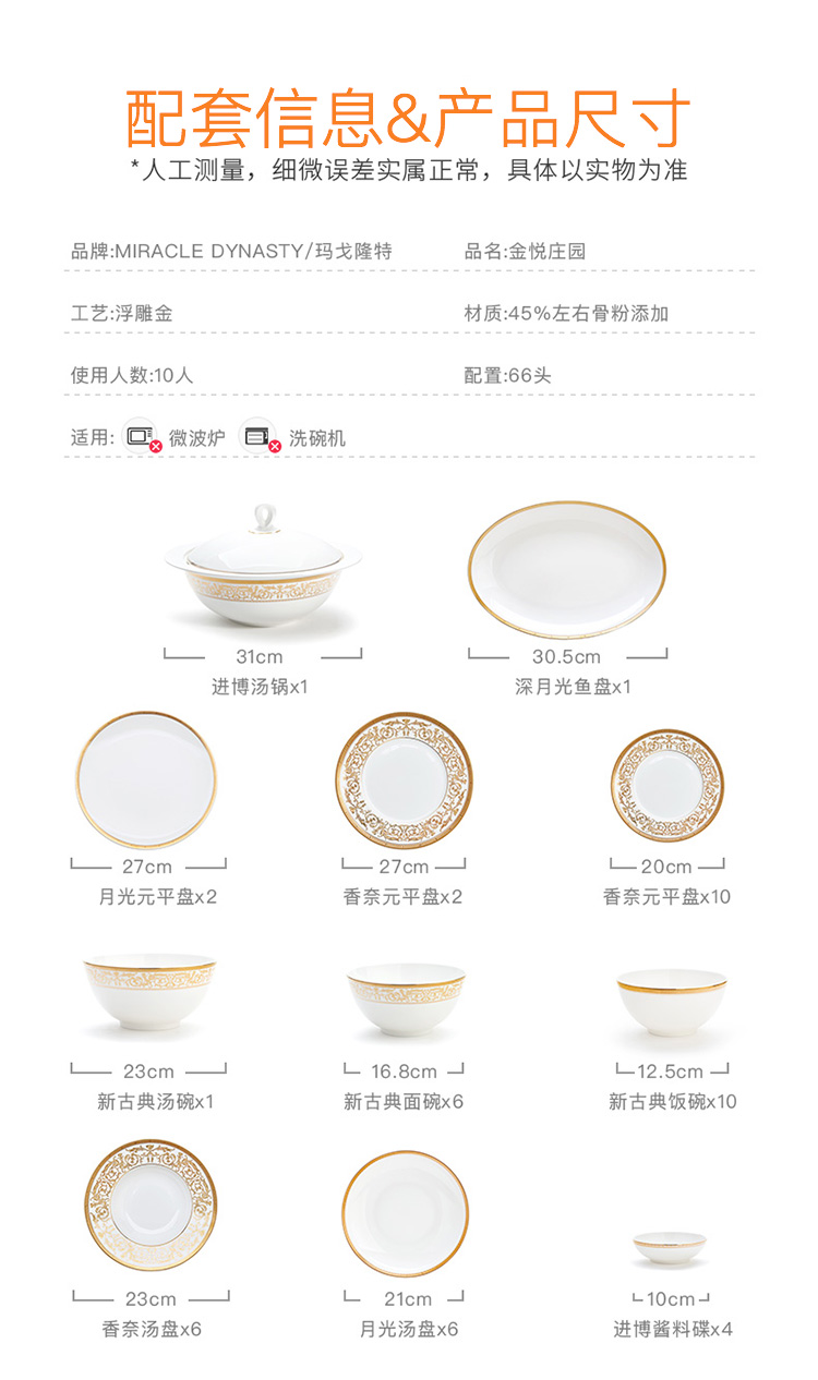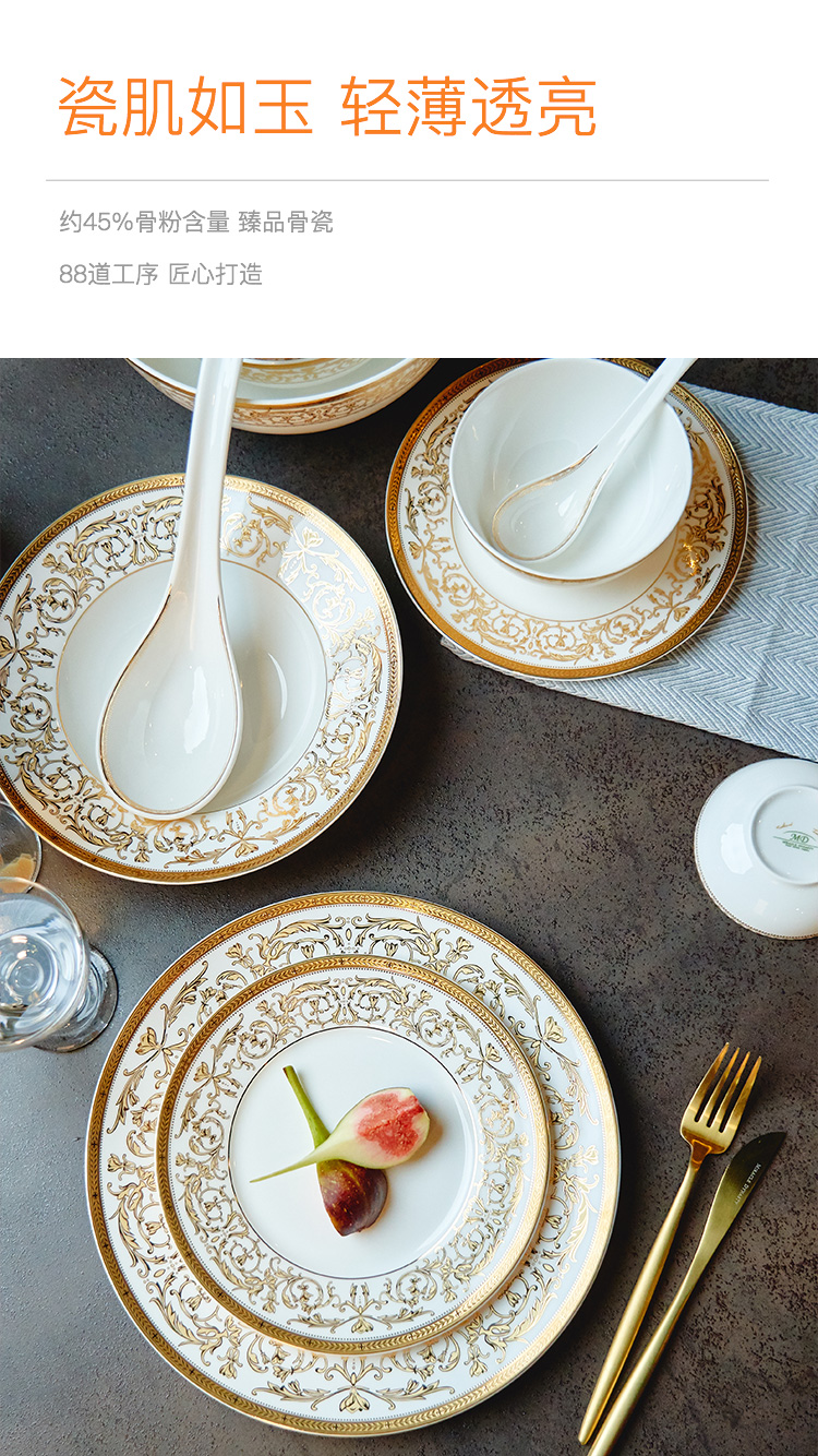 【玛戈隆特】B7F 10人骨瓷餐具套装碗碟套装 欧式轻奢家用碗盘碟 礼盒礼品包装 66头黄金瀚宫