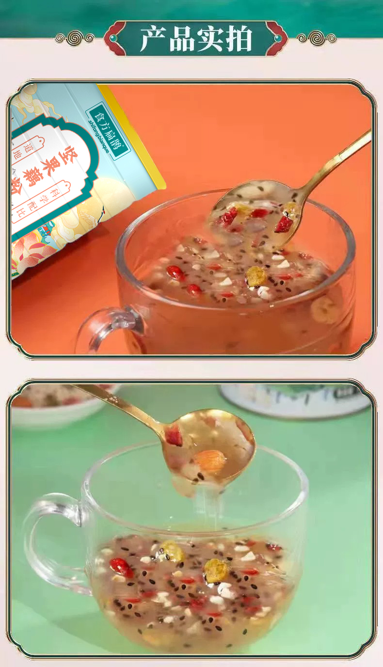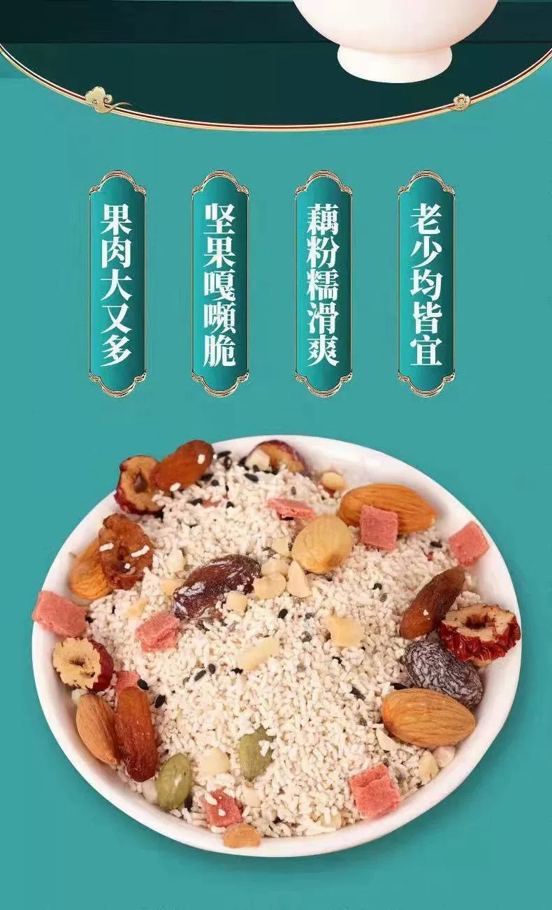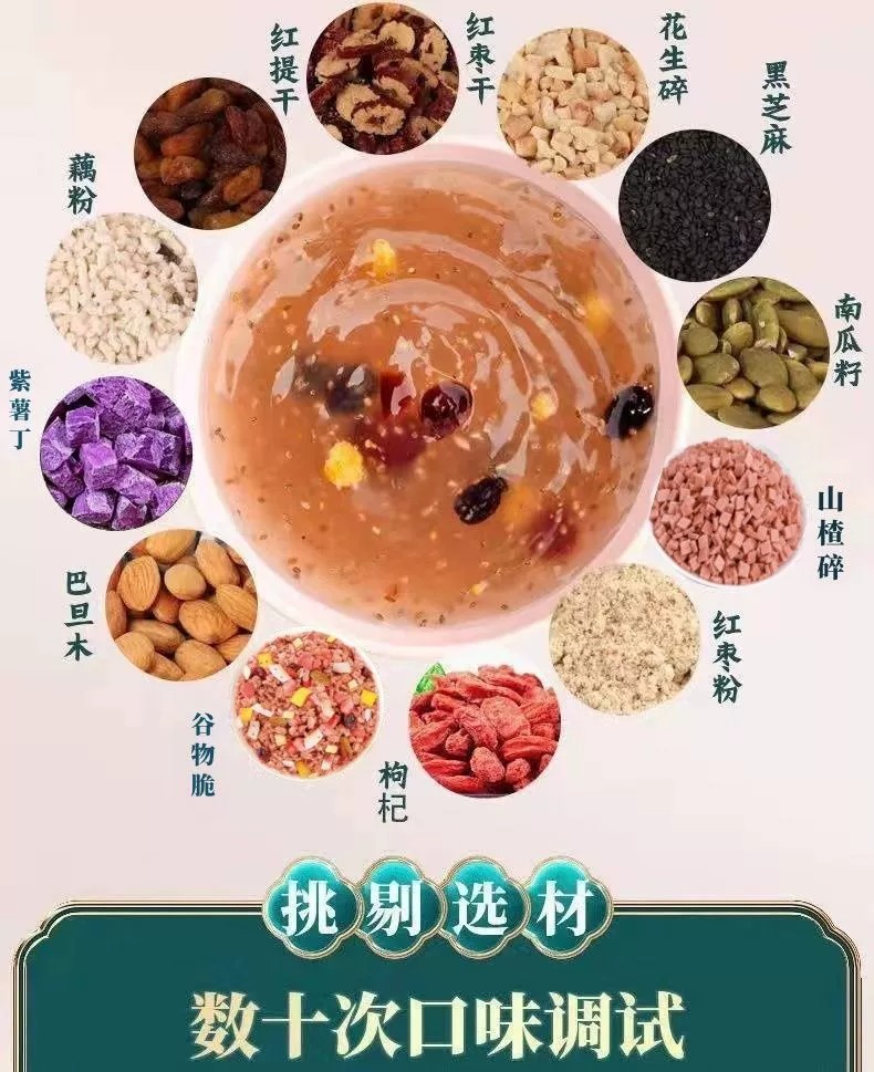 配料:速溶颗粒(藕粉、木薯粉)、红提干、红枣圈、瓜子仁、奇亚籽、黑芝麻、南瓜籽仁、巴旦木、山楂碎、枸杞
