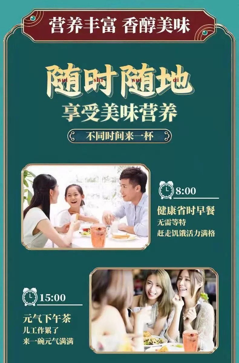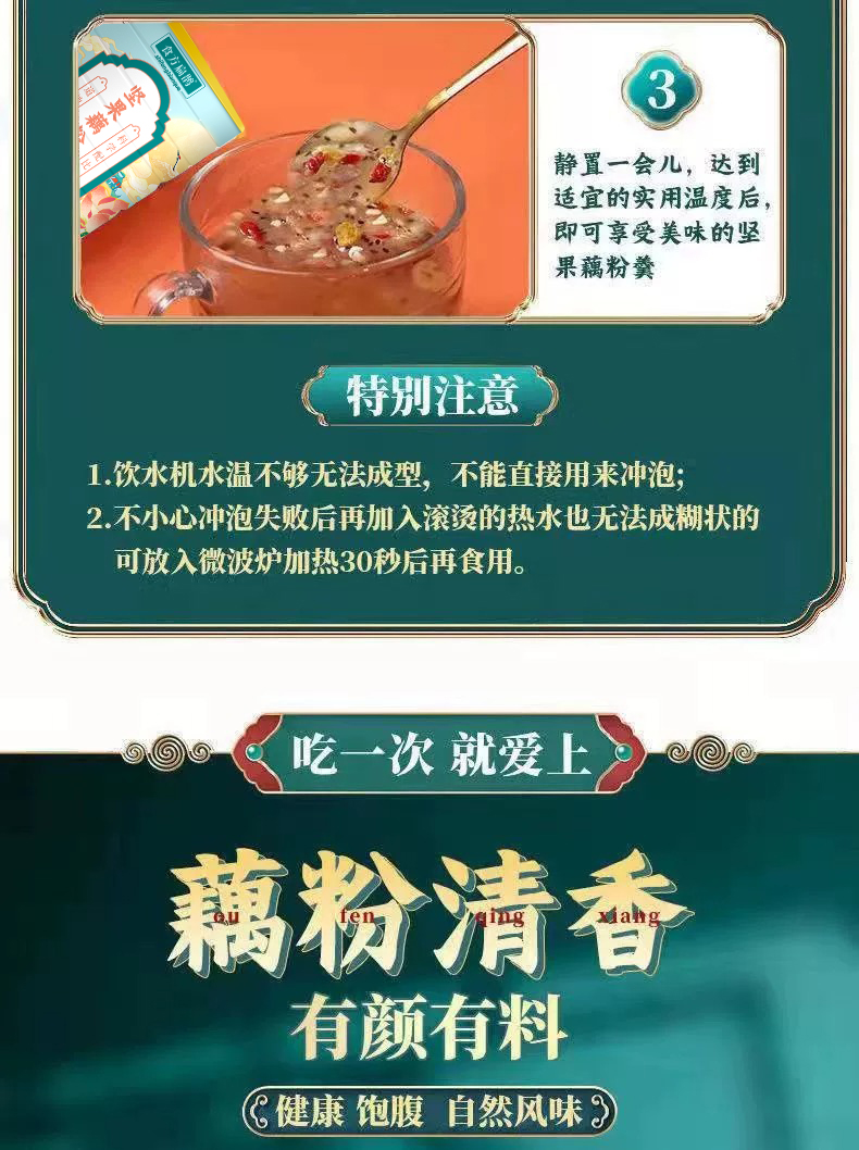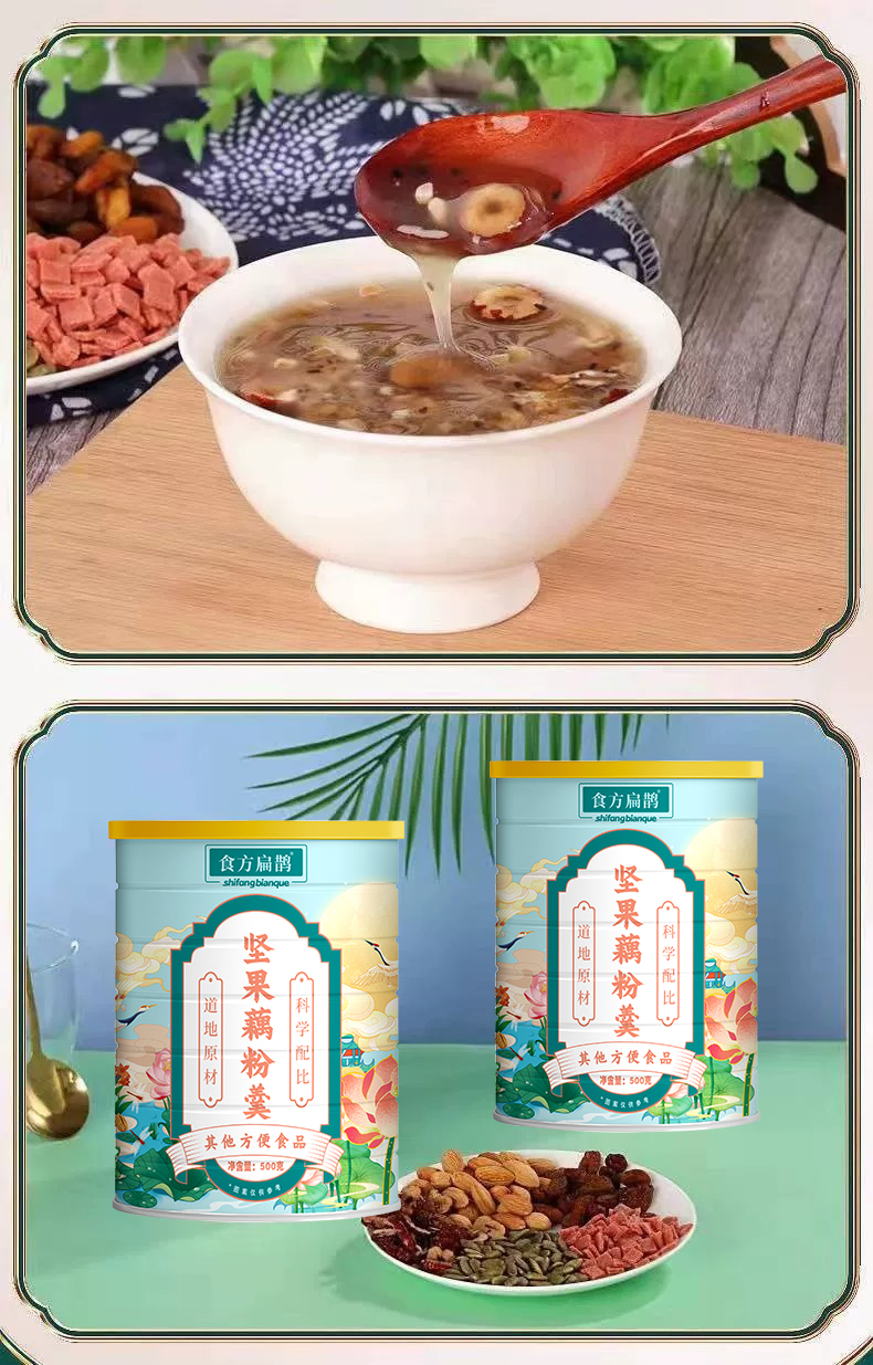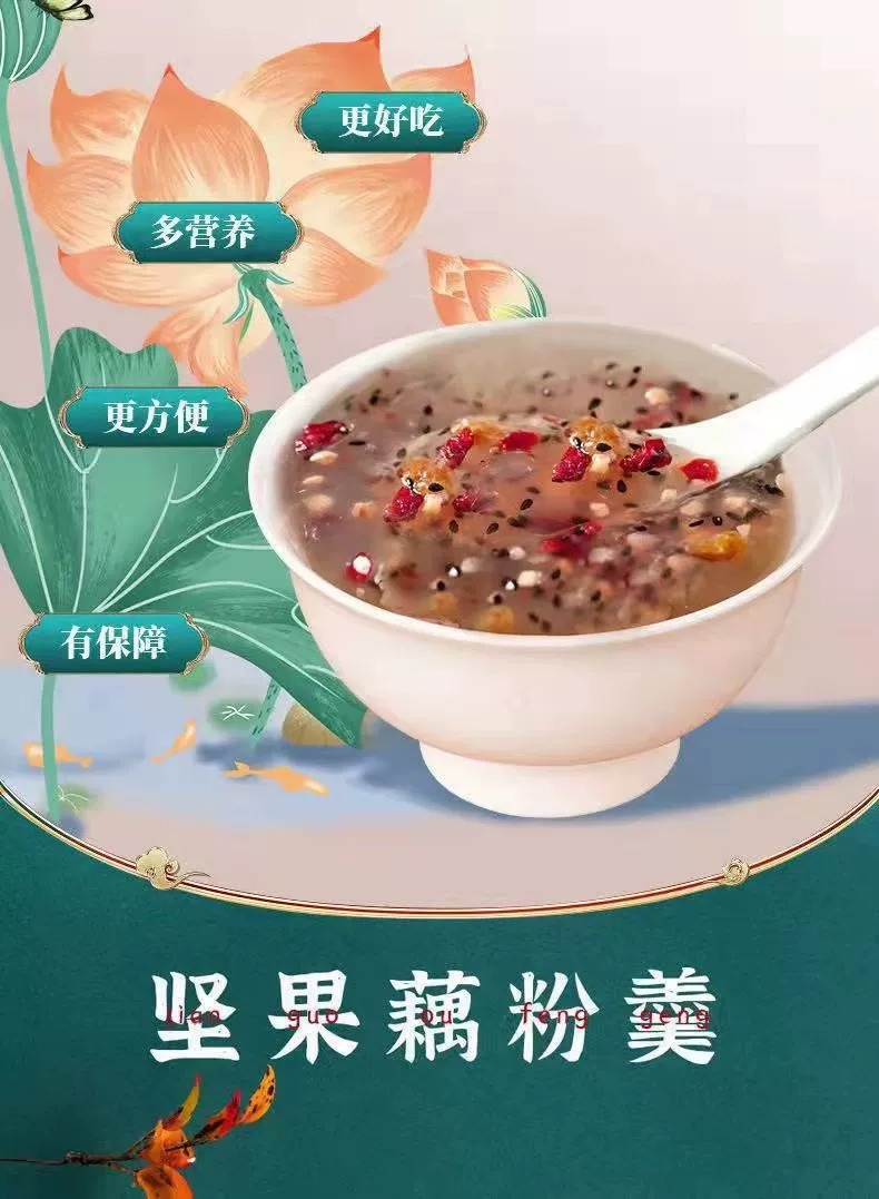 配料:速溶颗粒(藕粉、木薯粉)、红提干、红枣圈、瓜子仁、奇亚籽、黑芝麻、南瓜籽仁、巴旦木、山楂碎、枸杞