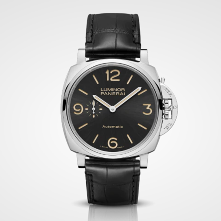 镜面材质 | 蓝宝石水晶玻璃 | 表盘 | 精钢表壳 黑色磨砂太阳纹表盘,附阿拉伯数字及条形夜光圆点时标。9点钟位置设小秒盘。 磨砂精钢表冠护桥(沛纳海专利) 透底 |