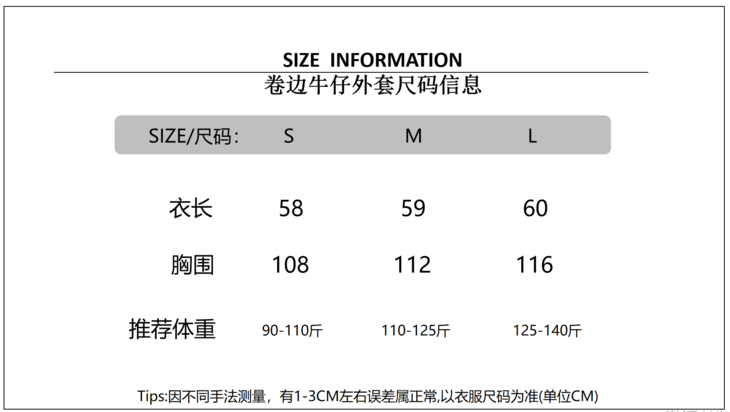 Gesamy卷边牛仔外套尺码表⬇⬇⬇