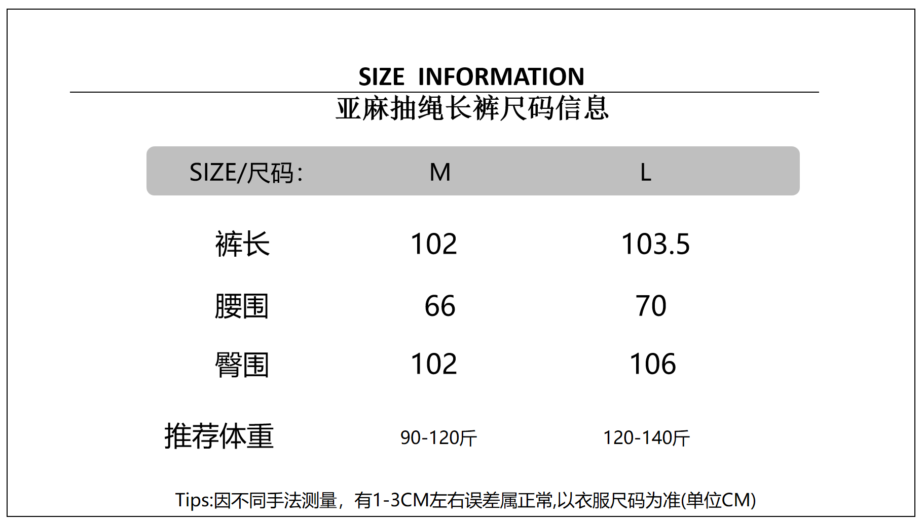 Gesamy亚麻抽绳长裤尺码表⬇⬇⬇