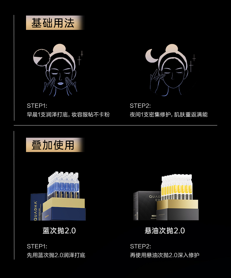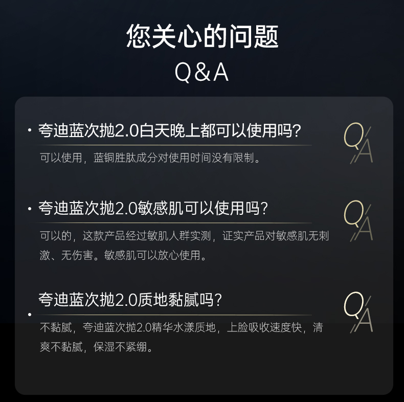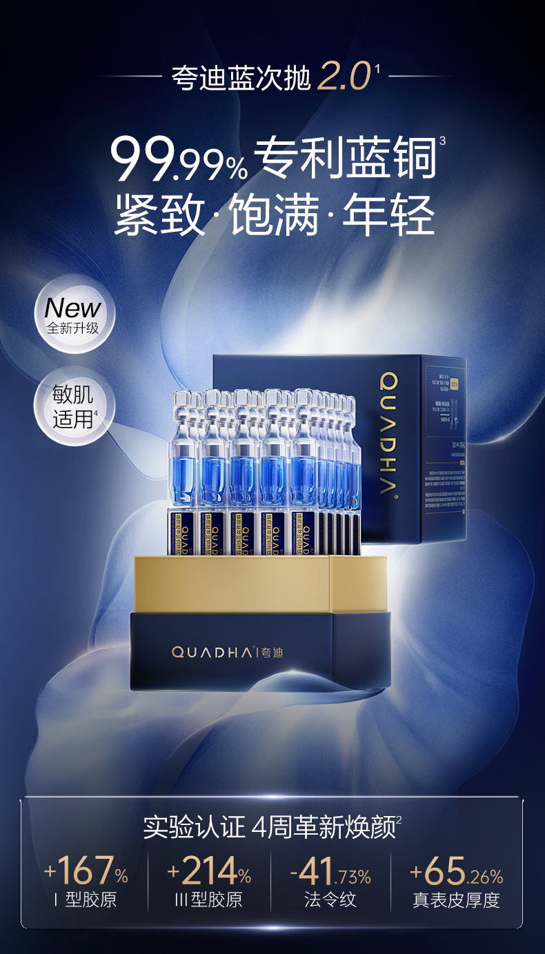 | 售后标准 | 售后期为收货7天内,未拆不影响二次销售可退,非质量问题客户自费寄回 蓝铜胜肽次抛剩余有效期18个月以上;夸迪动能支撑净澈洁面乳[100支/盒]剩余效期18个月以上;夸迪水乳面膜效期到28年4月;保质期三年 |