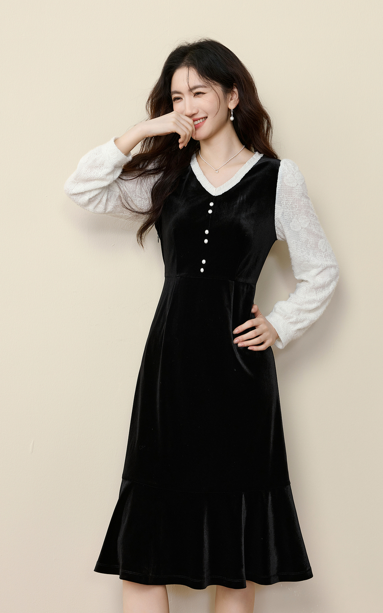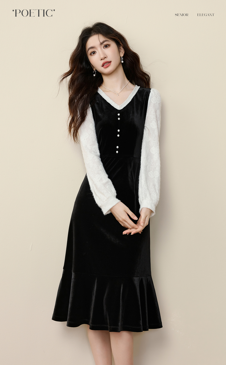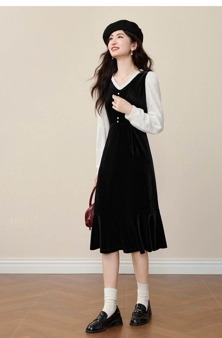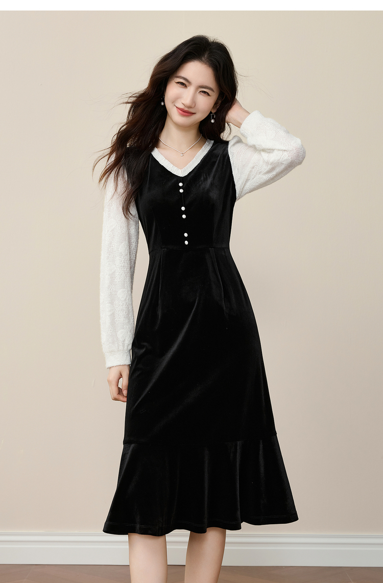 【12/10新品6折】熙世界优雅赫本风假两件连衣裙女2025秋冬新款蕾丝拼接丝绒鱼尾裙