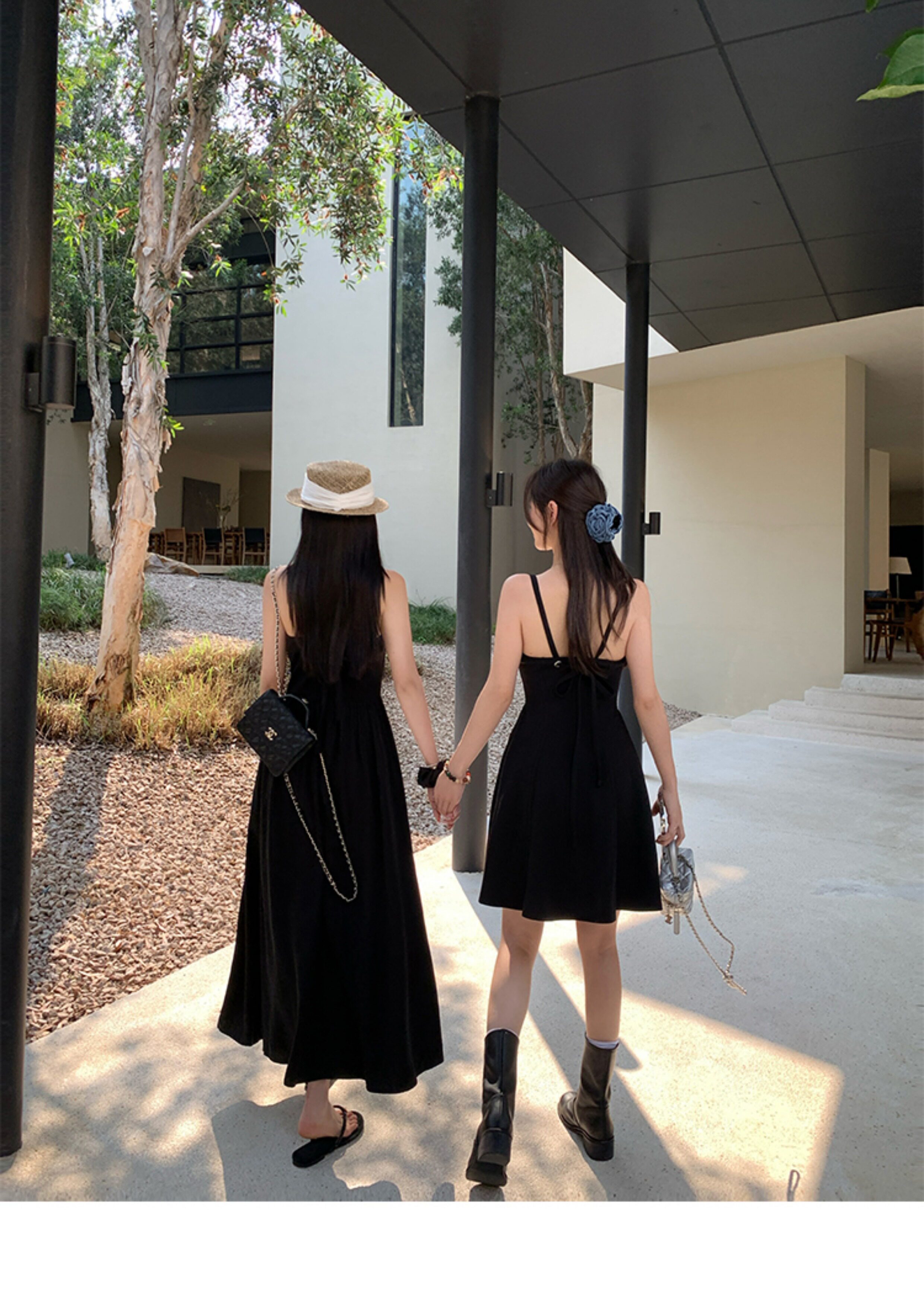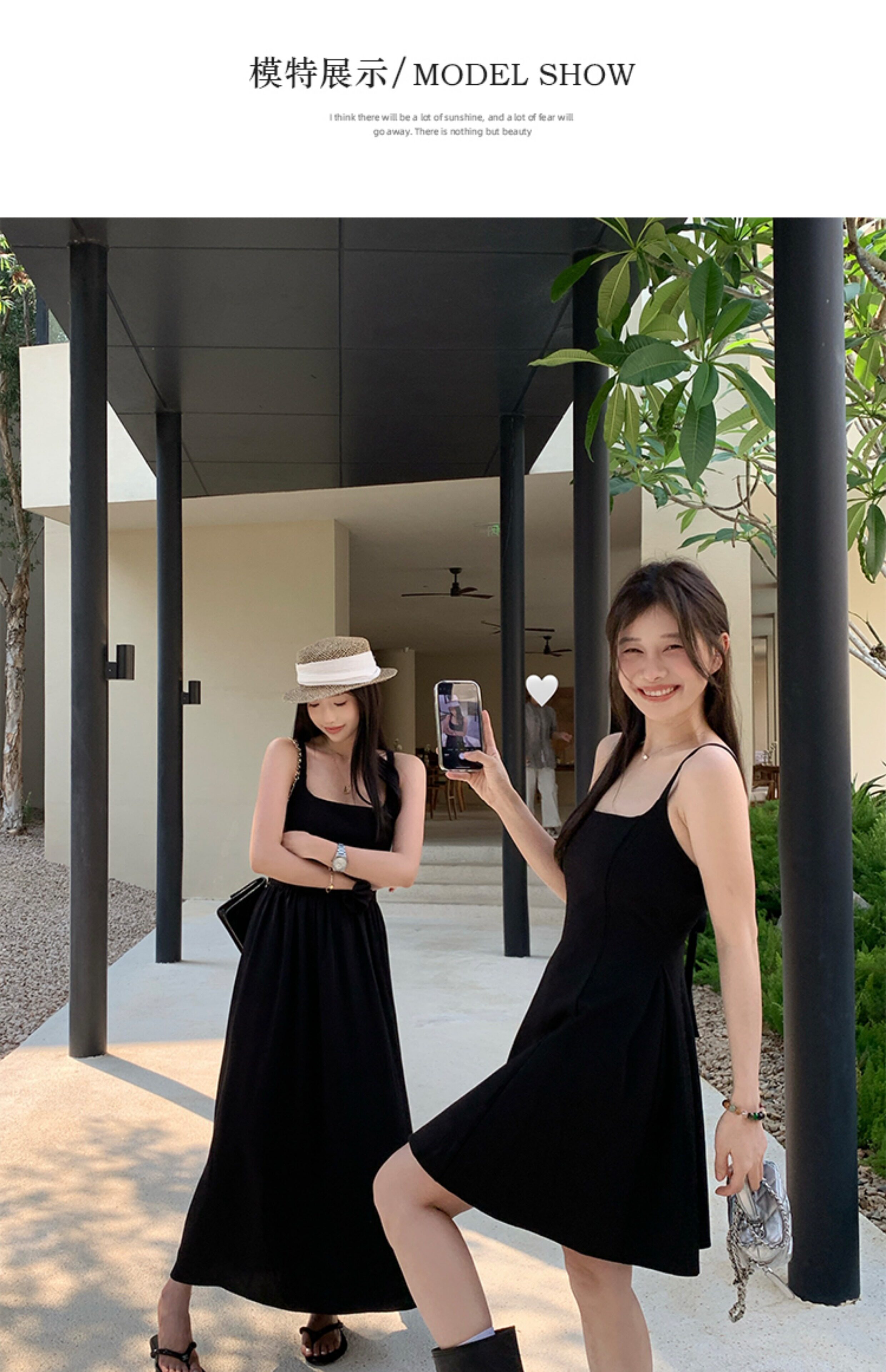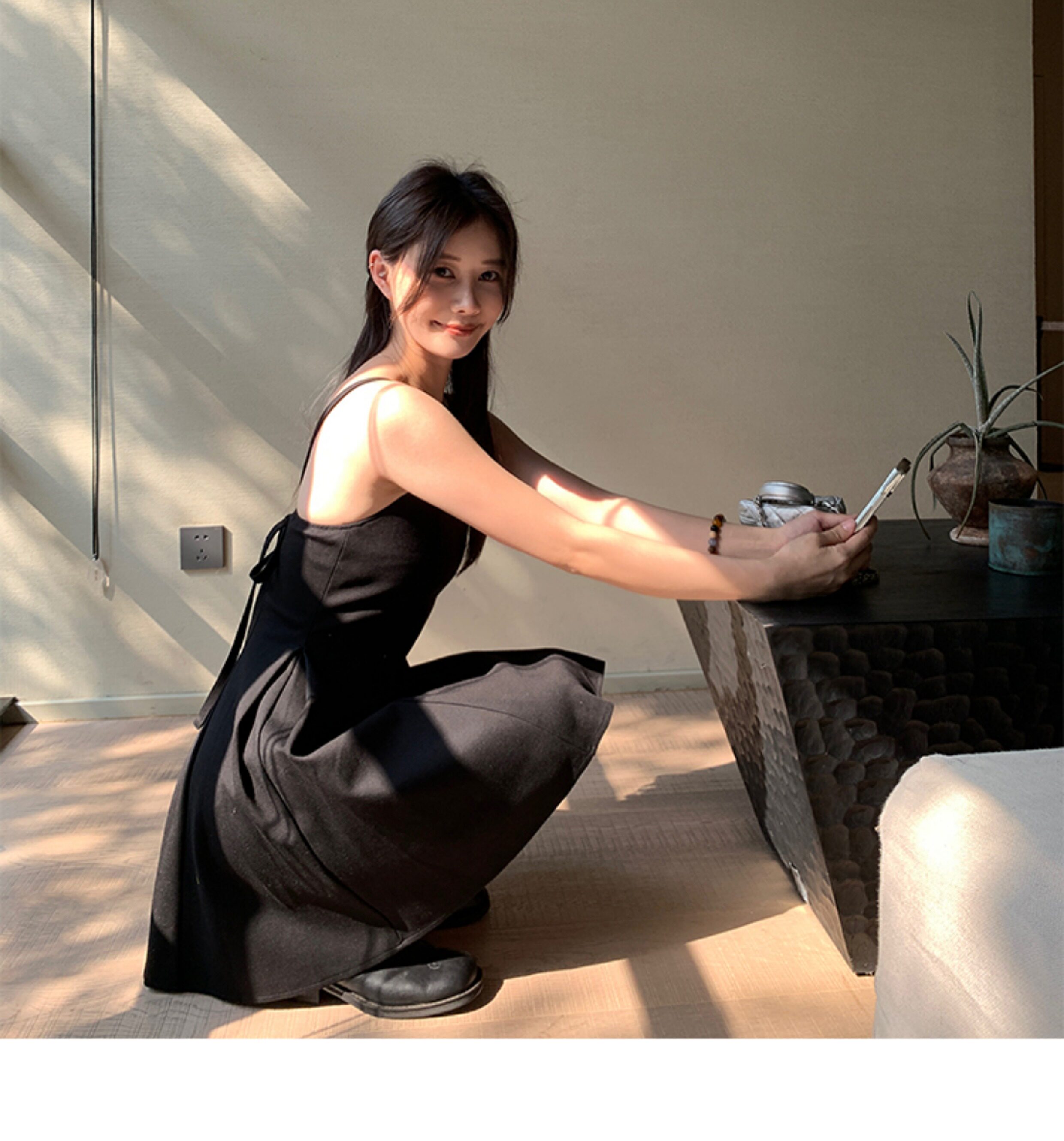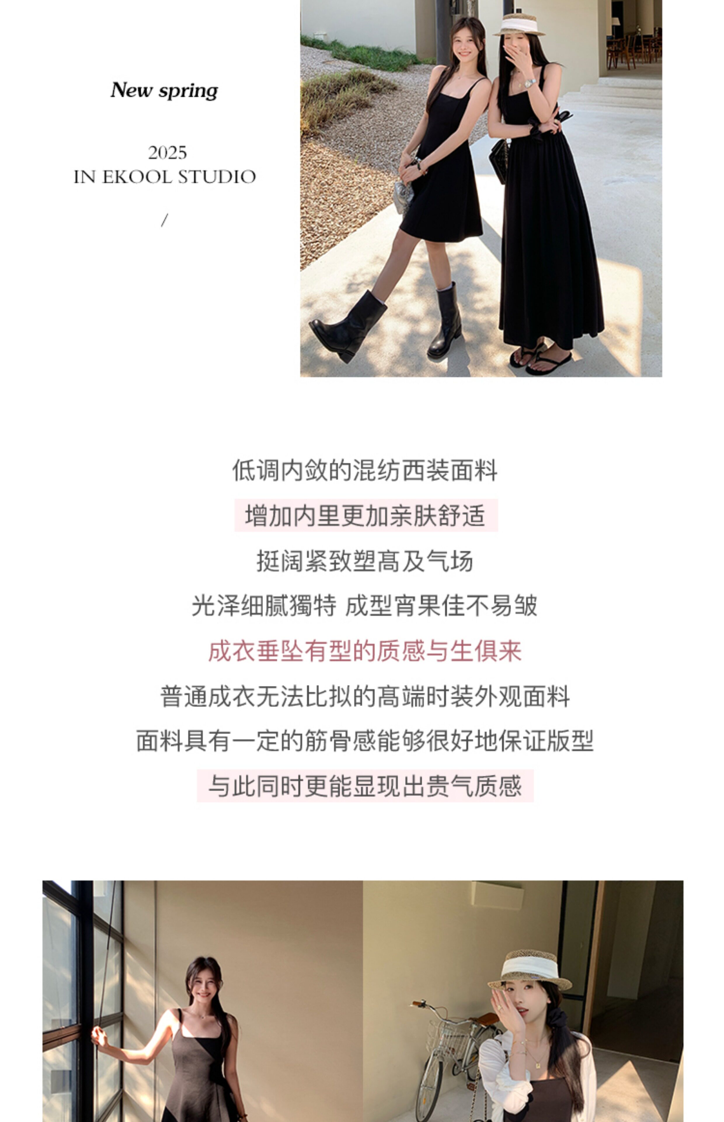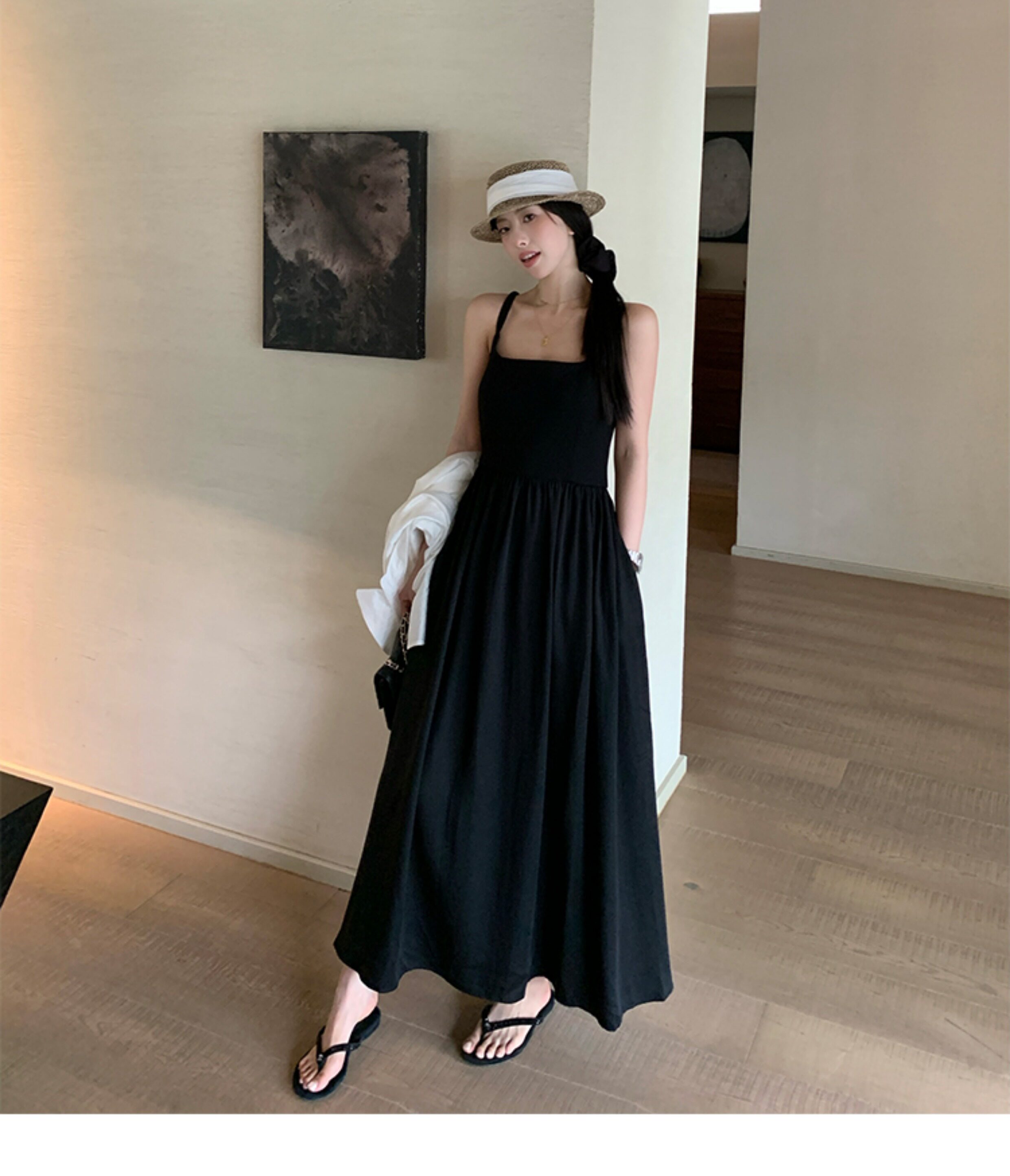 EKOOL衣库 天丝吊带连衣裙女夏季后背绑带修身显瘦长裙a字小黑裙