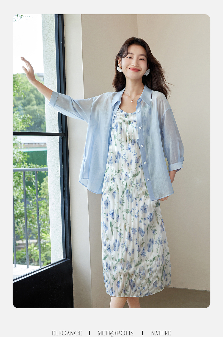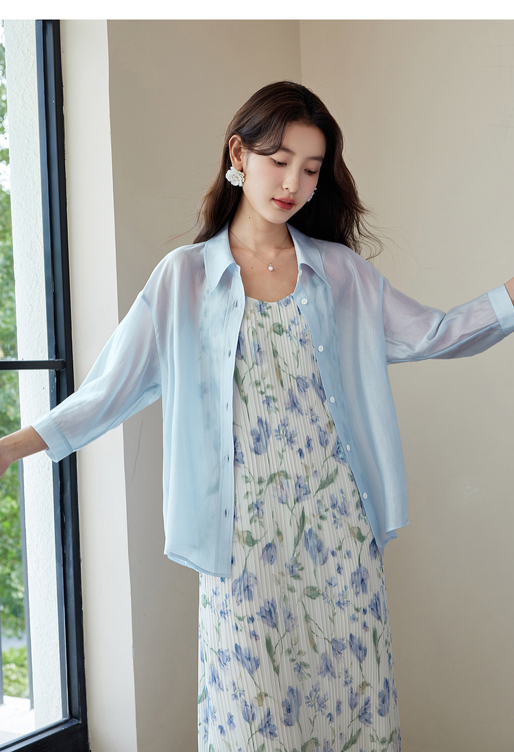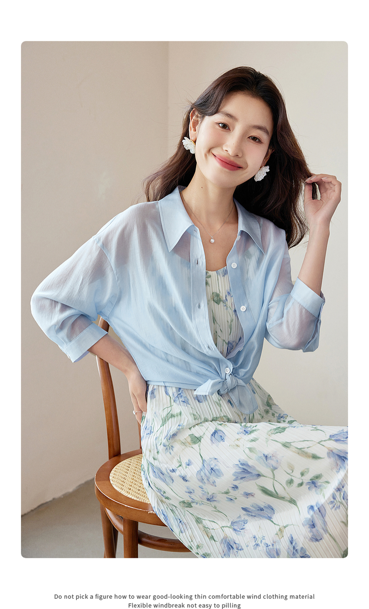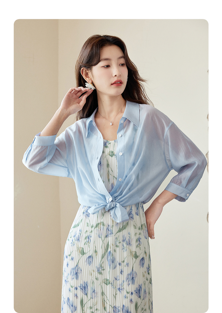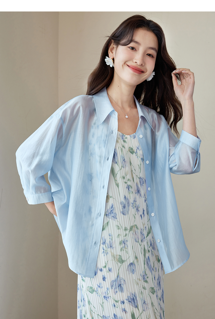 【五折购】熙世界莱赛尔防晒衬衫女2025夏季新款休闲薄款天丝开衫蓝色衬衣