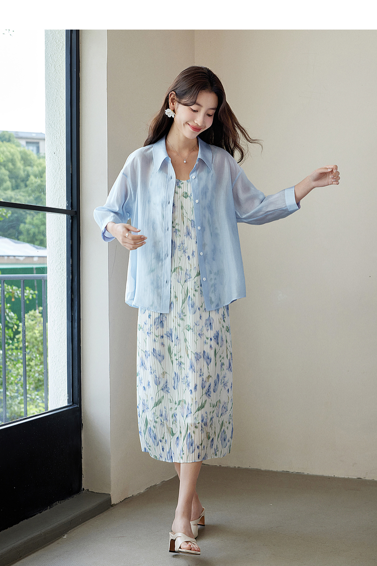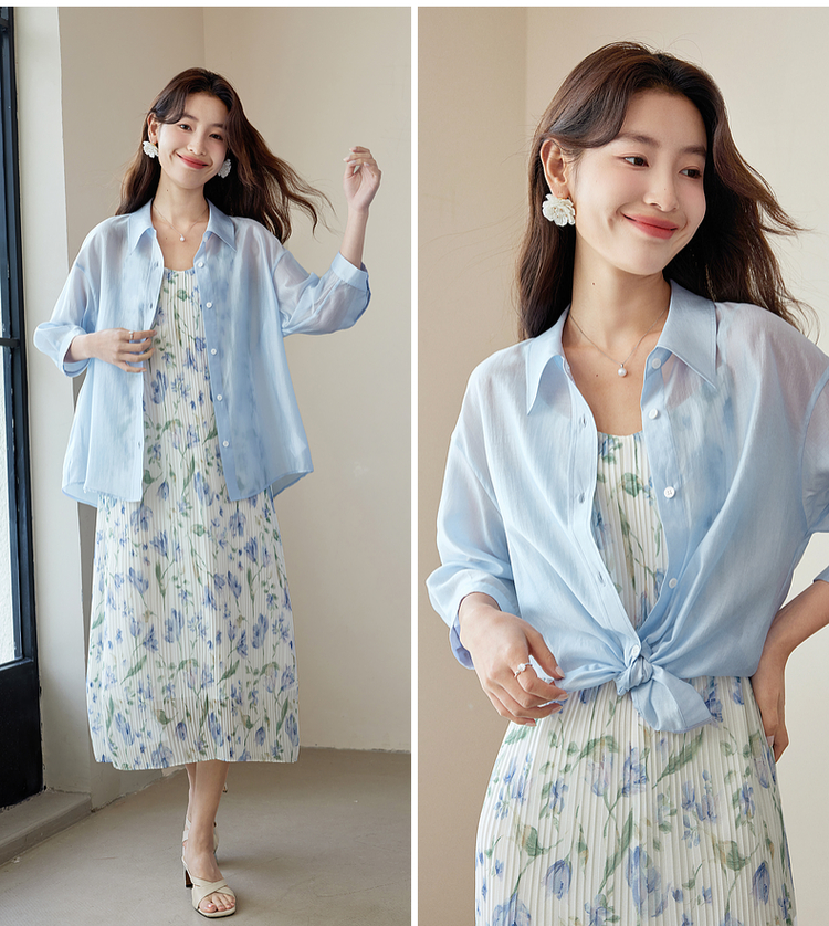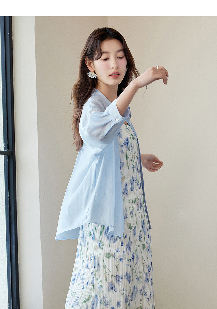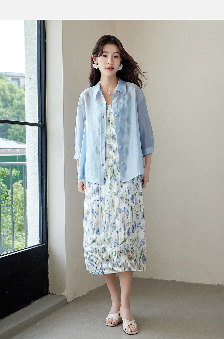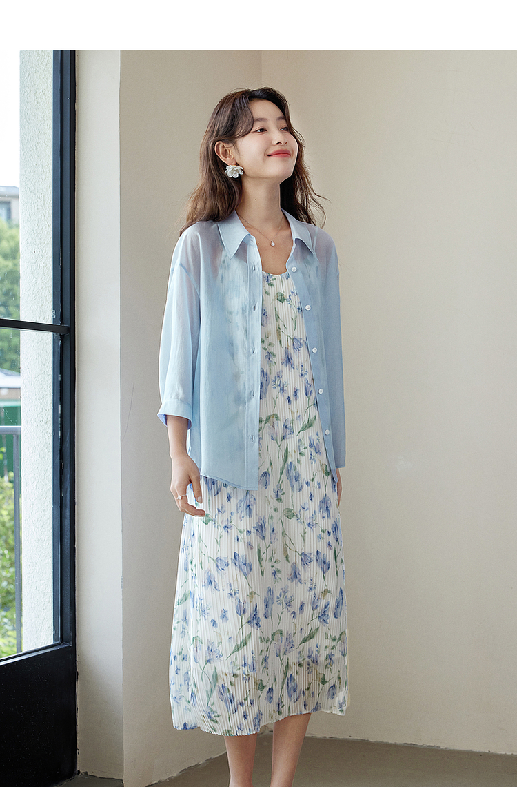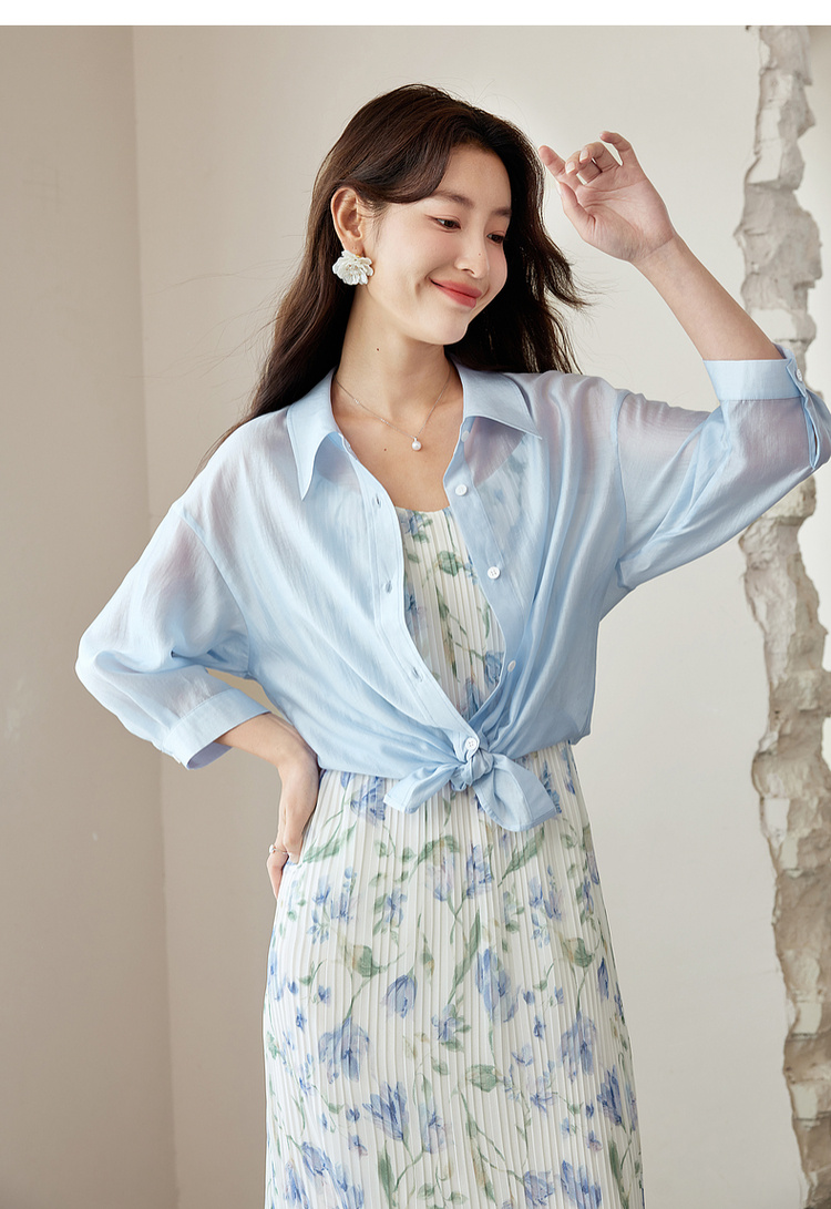 【五折购】熙世界莱赛尔防晒衬衫女2025夏季新款休闲薄款天丝开衫蓝色衬衣