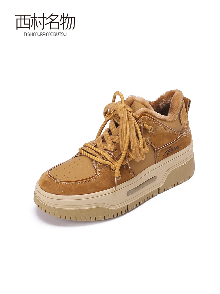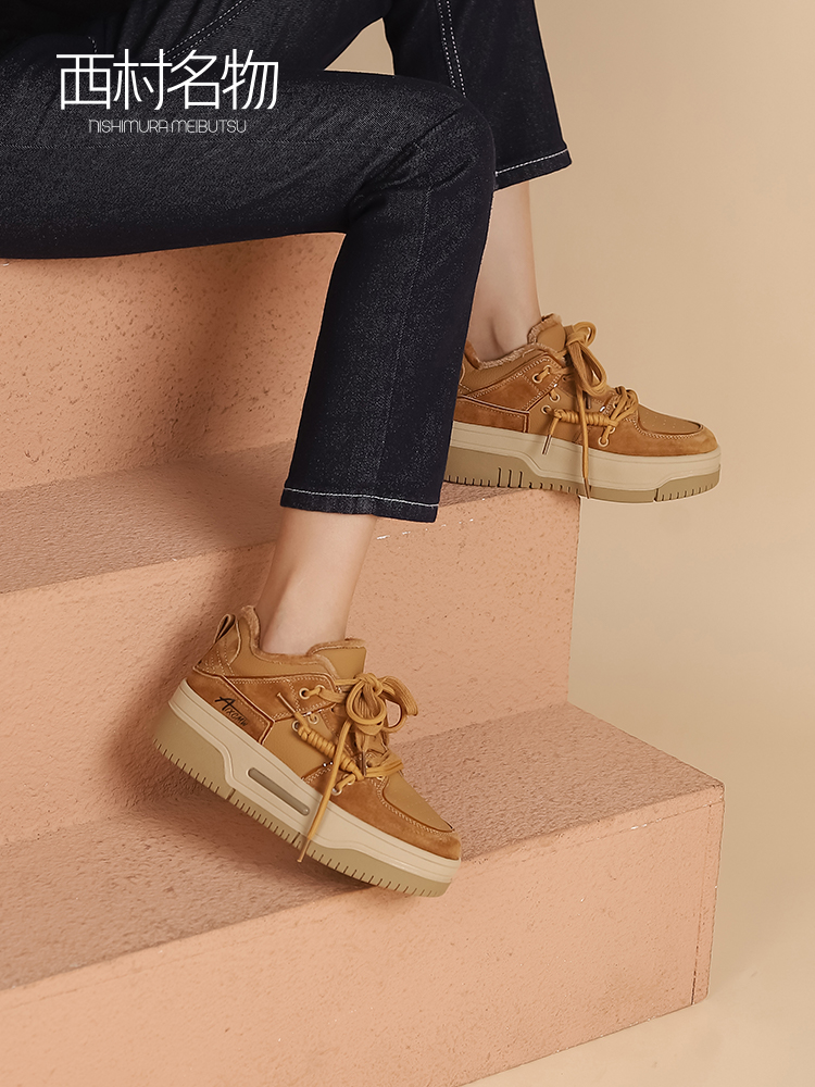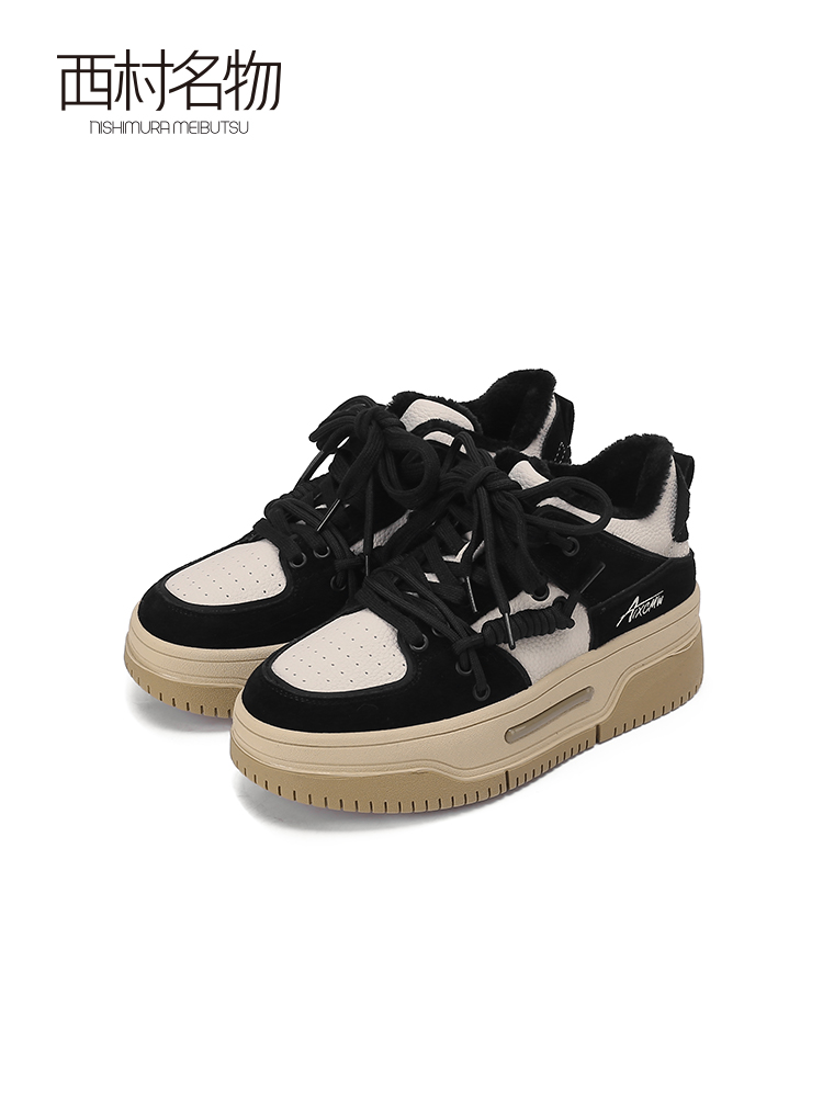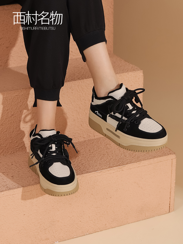 西村名物2023春季新款复古厚底板鞋面包鞋加绒小白休闲鞋女12251