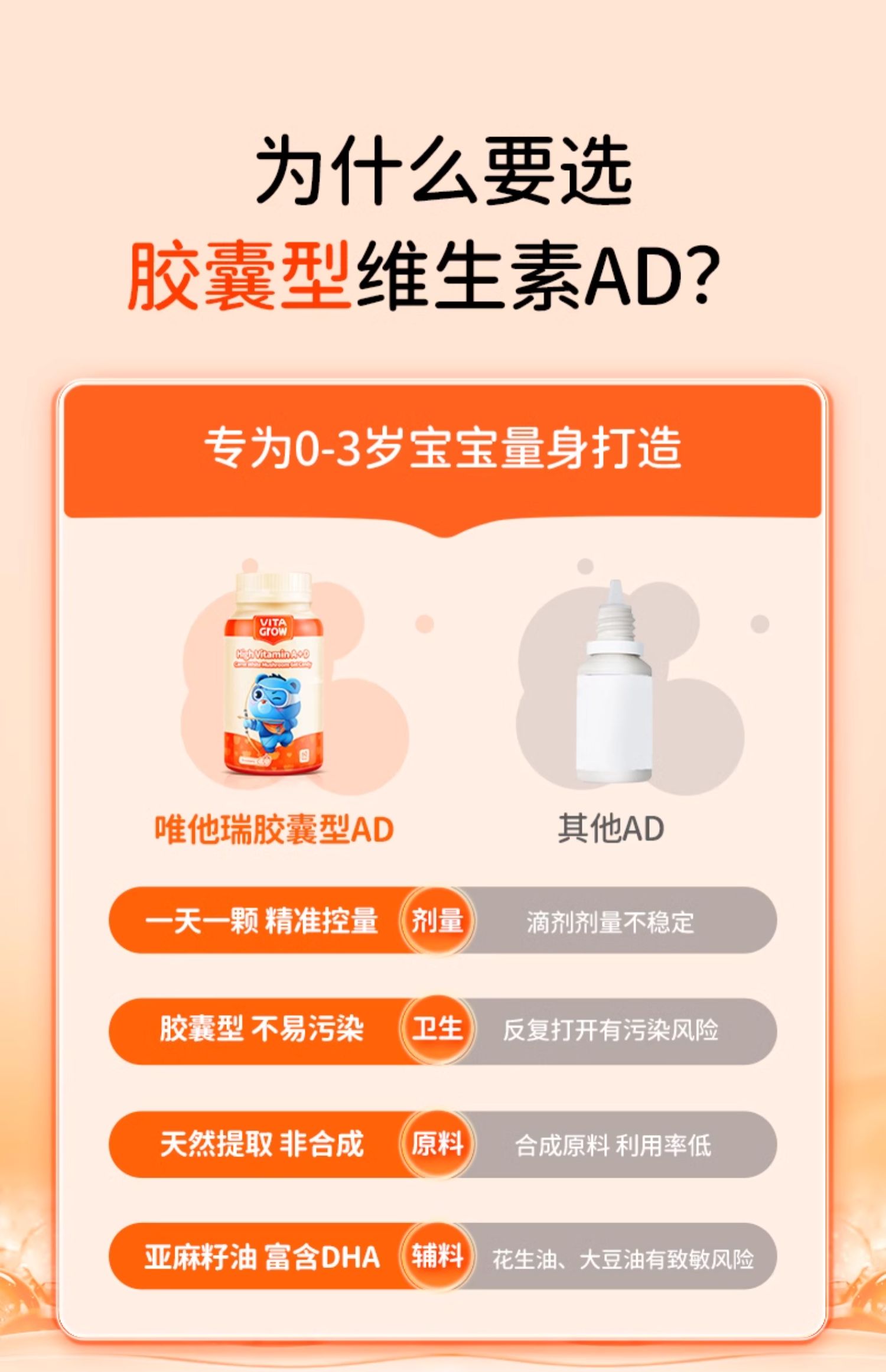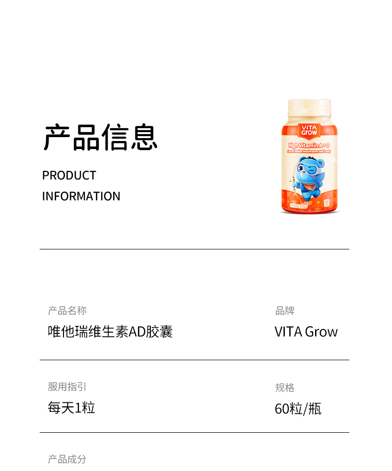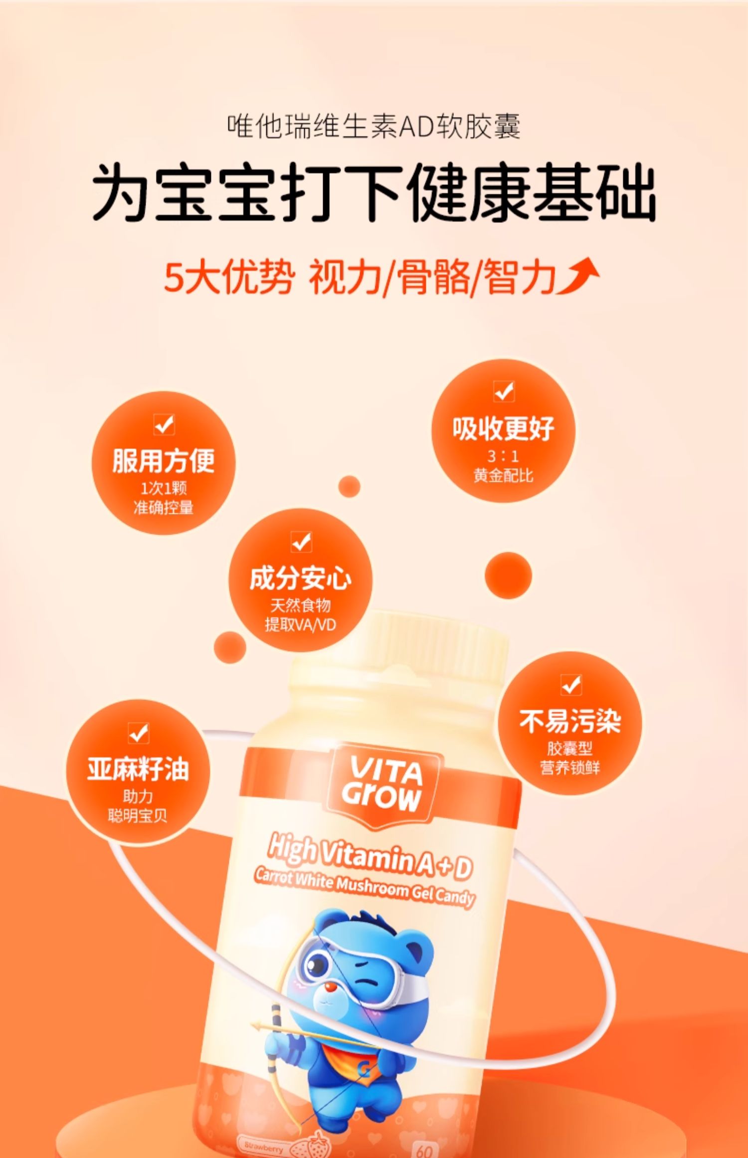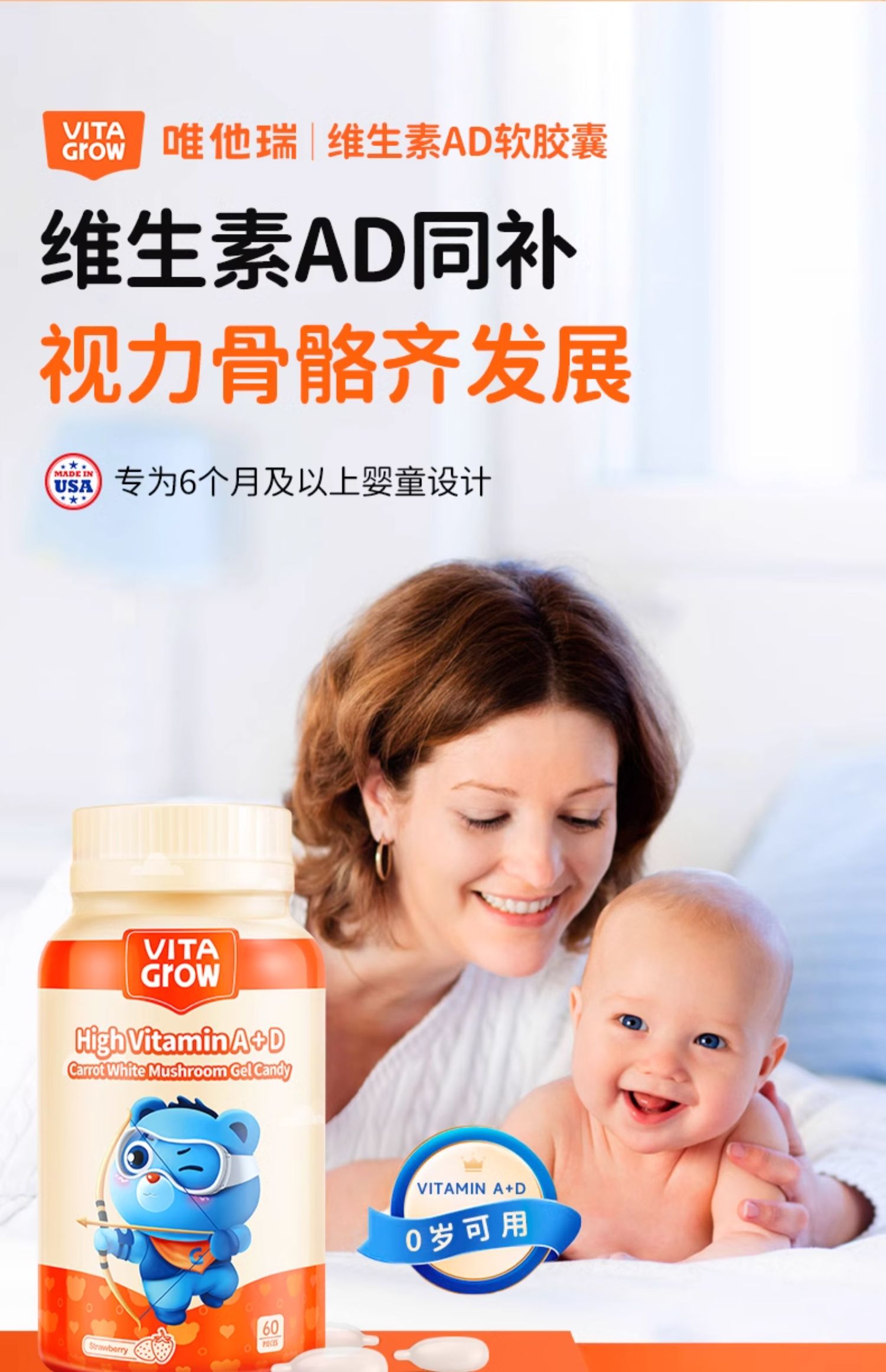 VITA Grow 婴幼儿维生素AD软胶囊 60粒/瓶 补好维AD 补钙视力齐发展(效期至2026-11-08 )
