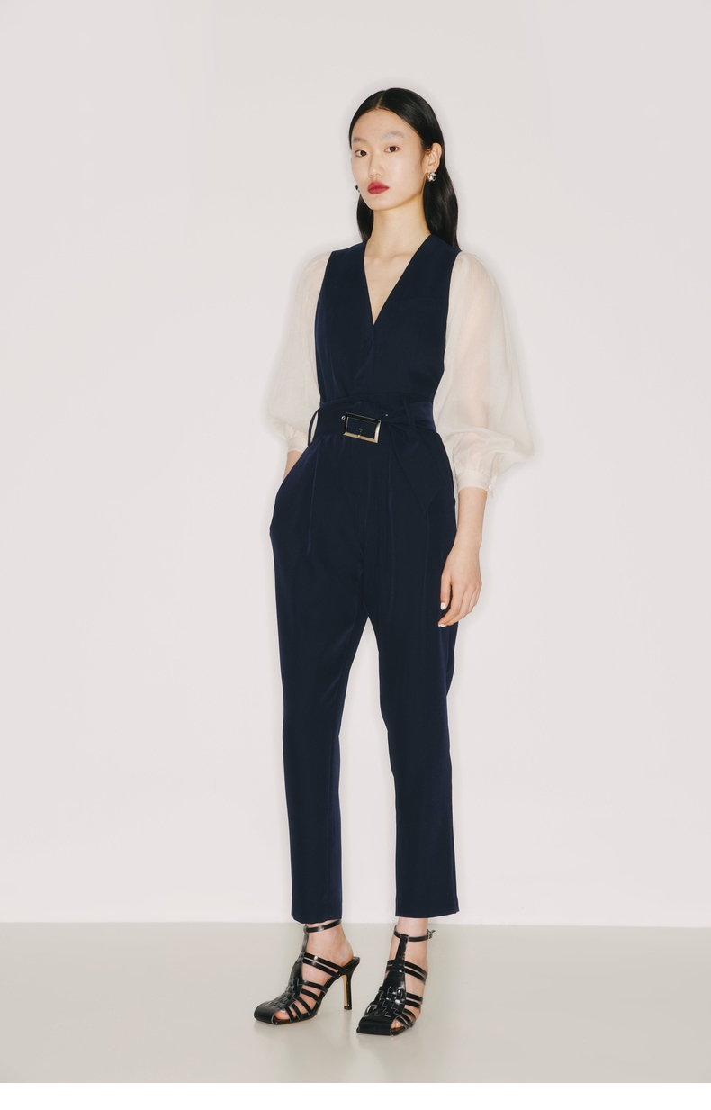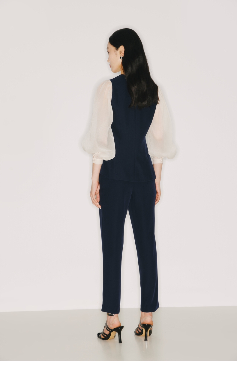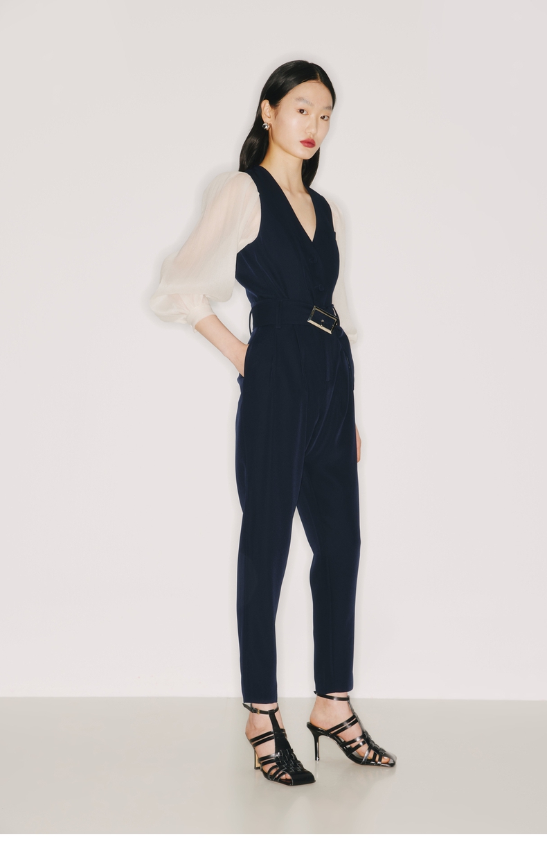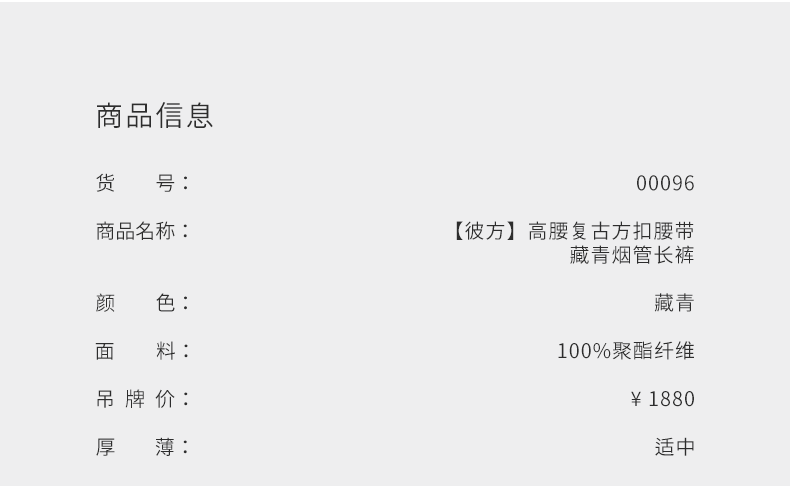 【彼方夜空】藏青高腰复古方扣腰带烟管长裤/00096