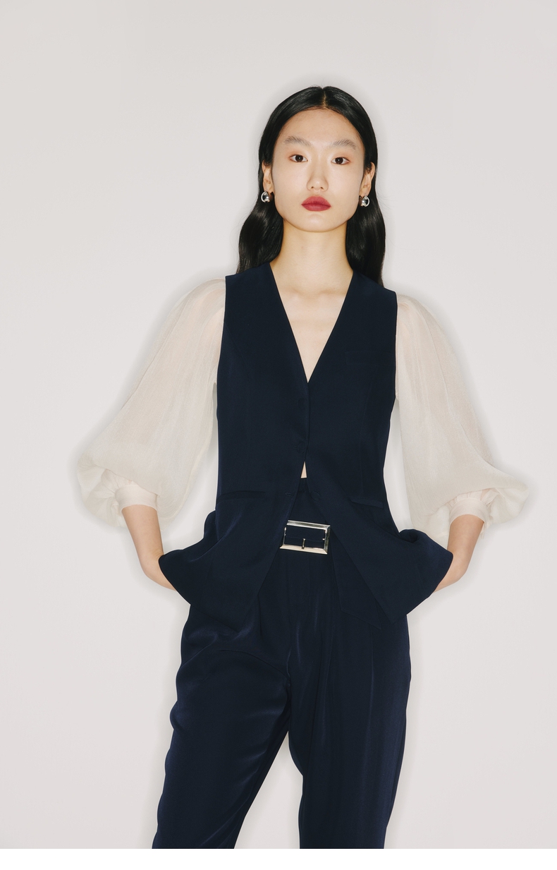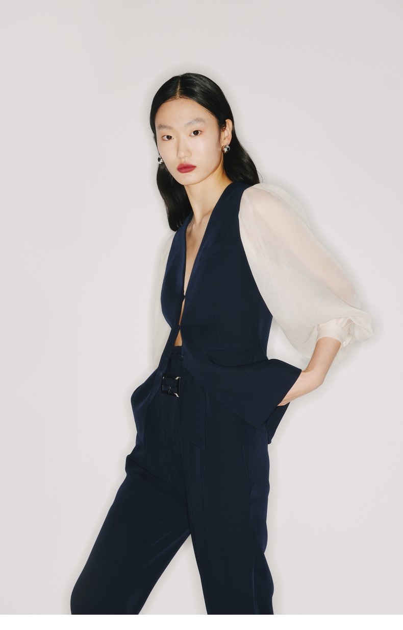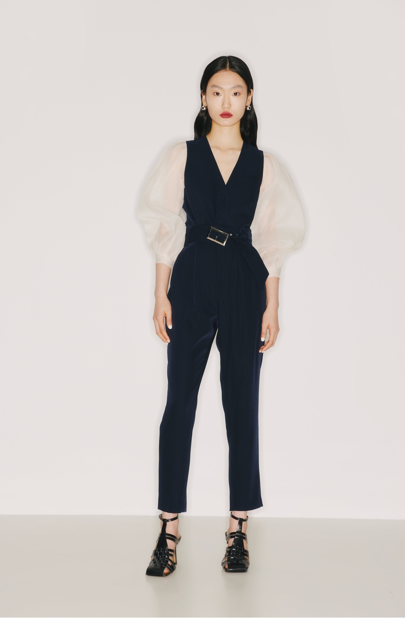 【彼方夜空】藏青高腰复古方扣腰带烟管长裤/00096