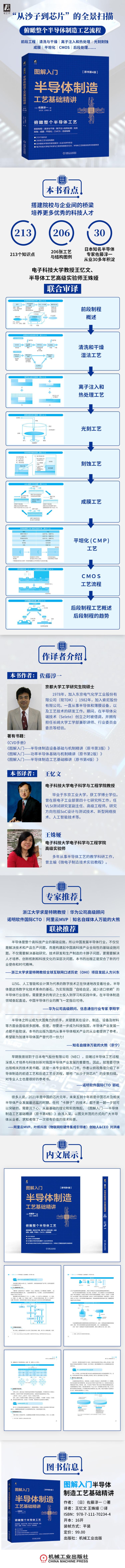 ●前言第1章 半导体制造工艺全貌/1-1半导体工艺简介/各种半导体产品/为什么称为半导体工艺?/1-2前段制程和后段制程的区别/前段制程和后段制程的优选区别/晶圆厂的差异/1-3循环型的前段制程半导体工艺/什么是循环型工艺?/几种基本的组合/1-4前端工艺和后端工艺/为何要分前端工艺和后端工艺?/温度耐受的差异/1-5什么是硅晶圆?/为什么是硅?/半导体的特性是什么?/1-6硅晶圆是如何制造的?/作为原料的多晶硅的纯度是11个9/缓慢拉起的单晶硅/1-7硅的特性是什么?/硅的同类有哪些?/硅的特点/1-8硅晶圆所需的洁净度/硅晶圆和颗粒/其他污染/1-9硅晶圆在fab中的使用方法/硅晶圆的实际应用/不只用于产品制造的晶圆的使用方法/防止生产线中的相互污染/1-10晶圆的大直径化/为什么要大直径化?/从200mm至 300mm/1-11与产品化相关的后段制程/包装为什么是黑色的?/封装的趋势/1-12后段制程使用的工艺是什么?/后段制程的流程/后段制程工厂是什么样的?/第2章 前段制程概述/2-1追求微细化的前段制程工艺/摩尔定律/微细化是如何发展起来的?/2-2批量制造芯片的前段制程/批量生产的优点/与 LCD 面板的比较/2-3在没有“等待”的工艺中进行必要的检查和监控/半导体工艺独有的思路/监控的必要性/2-4前段制程fab的全貌/什么是洁净室?/工厂需要哪些设备?/2-5fab的生产线构成——什么是Bay方式?/为什么选择Bay方式?/实际生产线的运行/2-6晶圆厂需要尽早提升良品率/为什么要尽早启动?/如何提高初期成品率?/第3章 清洗和干燥湿法工艺/3-1始终保持洁净的清洗工艺/为什么每次都需要清洗?/仅对表面进行清洗处理是不够的/3-2清洗方法和机理/清洗方法/什么是超声波清洗?/3-3基础清洗——RCA清洗/什么是RCA清洗?/RCA清洗的挑战/3-4新清洗方法的例子/新的清洗方法/未来的清洗方法/3-5批量式和单片式之间的区别/什么是批量式?/什么是单片式?/3-6吞吐量至关重要的清洗工艺/清洗设备的吞吐量/无载具清洗机/3-7清洗后必不可少的干燥工艺/什么是水渍?/干燥方法/3-8新的干燥工艺/什么是马兰戈尼干燥?/什么是罗塔戈尼干燥?/3-9湿法工艺和干法清洗/为什么是湿法工艺?/完全干法清洗的尝试/第4章 离子注入和热处理工艺/4-1注入杂质的离子注入技术/离子注入技术之前/什么是离子注入?/4-2需要高真空的离子注入工艺/什么是离子注入机?/离子束扫描是什么样子的?/4-3用于不同目的的离子注入工艺/各式各样的扩散层/具有不同加速能量和束电流的离子注入工艺/4-4离子注入后的晶格恢复处理/什么是硅晶格?/杂质原子的作用/4-5各种热处理工艺/恢复晶格的方法/用什么方法进行热处理?/4-6近期新的激光退火工艺/什么是激光退火设备?/激光退火和RTA之间的区别是什么?/4-7LSI制造和热预算/什么是杂质的分布曲线?/半导体材料的耐热性和热预算/第5章 光刻工艺/5-1复制图形的光刻工艺/什么是光刻工艺?/光刻工艺流程/光刻是减法工艺/5-2光刻工艺的本质就是照相/与日光照相相同的接触式曝光/缩小投影的好处/5-3推动微细化的曝光技术的演变/分辨率和焦深/光源和曝光设备的历史/5-4掩膜版和防尘薄膜/什么是掩膜版?/什么是防尘薄膜?/套刻/5-5相当于相纸的光刻胶/光刻胶种类/感光机理/什么是化学放大光刻胶?/5-6涂布光刻胶膜的涂胶机/光刻胶涂布工艺/光刻胶涂布的实际情况/5-7曝光后必需的显影工艺/显影机理/实际的显影工艺和设备/5-8去除不要的光刻胶灰化工艺/灰化工艺的机理/灰化工艺和设备/5-9浸液曝光技术现状/为什么要使用浸液?/浸液式曝光技术的原理与问题/5-10什么是双重图形?/浸液的极限是什么?/多种方法的双重图形技术/5-11追求进一步微细化的EUV 技术/什么是 EUV曝光技术?/EUV 技术的挑战与展望/5-12纳米压印技术/什么是纳米压印技术?/与光刻的比较/纳米压印分类/纳米压印的可能性/第6章 刻蚀工艺/6-1刻蚀工艺流程和刻蚀偏差/刻蚀工艺流程是什么?/刻蚀偏差是什么?/6-2方法多样的刻蚀工艺/适应各种材料/适应各种形状/6-3刻蚀工艺中不可或缺的等离子体/等离子体生成机理/离子体电势/6-4RF(射频)施加方式有什么不同?/什么是干法刻蚀设备?/阴极耦合的优点/6-5各向异性的机理/什么是刻蚀反应?/利用侧壁保护效果/6-6干法刻蚀工艺的挑战/针对新材料的刻蚀工艺/什么是深槽刻蚀?/第7章 成膜工艺/7-1LSI功能不可或缺的成膜工艺/LSI和成膜/LSI 剖面所看到的薄膜形成示例/7-2方法多样的成膜工艺/各种成膜方法/成膜的参数/7-3受基底形状影响的成膜工艺/适应什么样的形状?/成膜机理/7-4直接氧化晶圆的氧化工艺/为什么是氧化硅膜?/硅热氧化机理/7-5热CVD和等离子体CVD/热CVD工艺的机理/什么是等离子CVD法?/7-6金属膜所需要的溅射工艺/